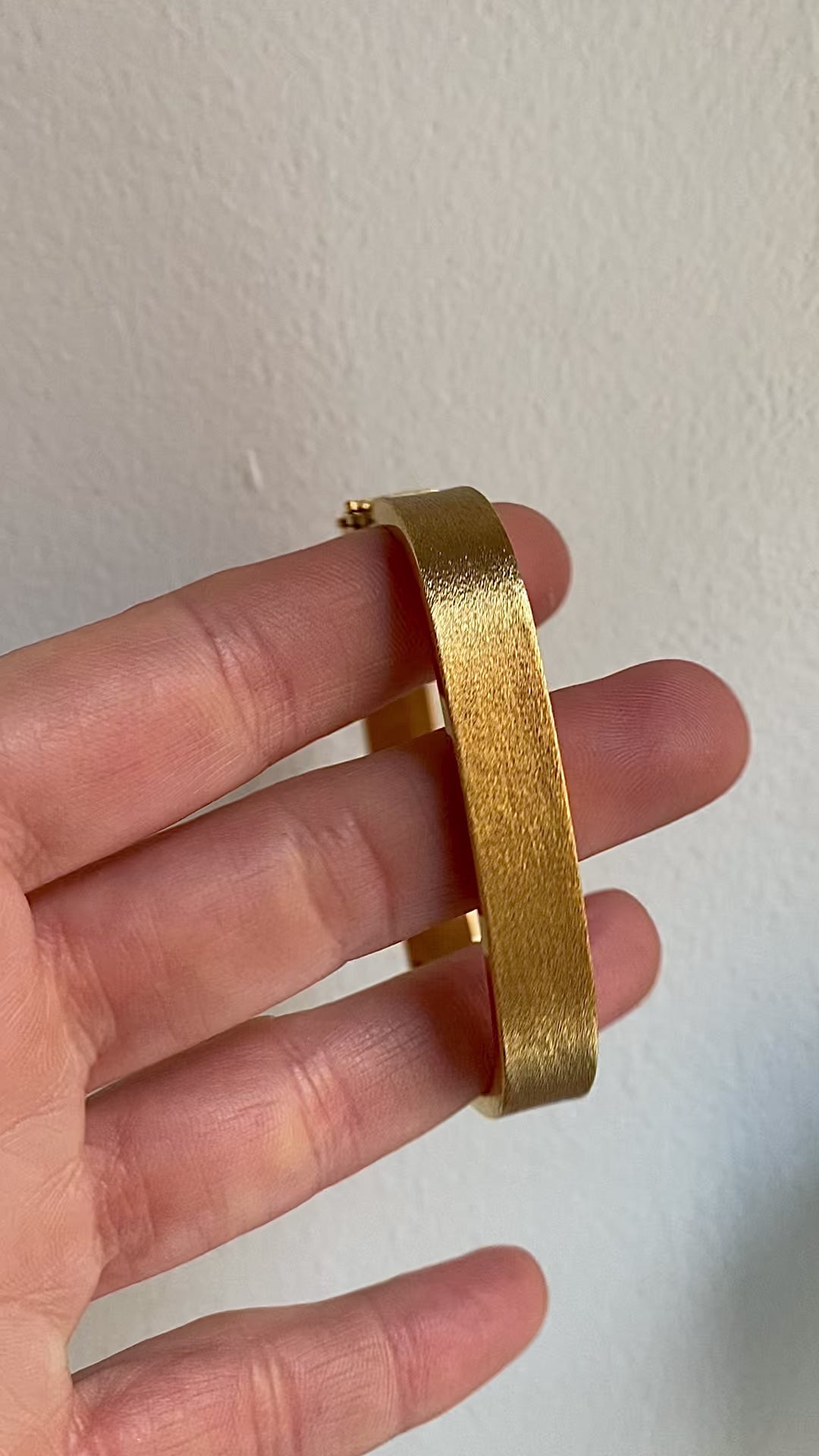 An obviously VERY high end 18k bangle in a cool squared shape! I'm not going to lie, I have been hoarding it for quite some time...but it's much too big on my 6" wrist! I love the texture on top and the shiny sides. It has lots of hallmarks, looks like "TC" and a tree...and 18k.