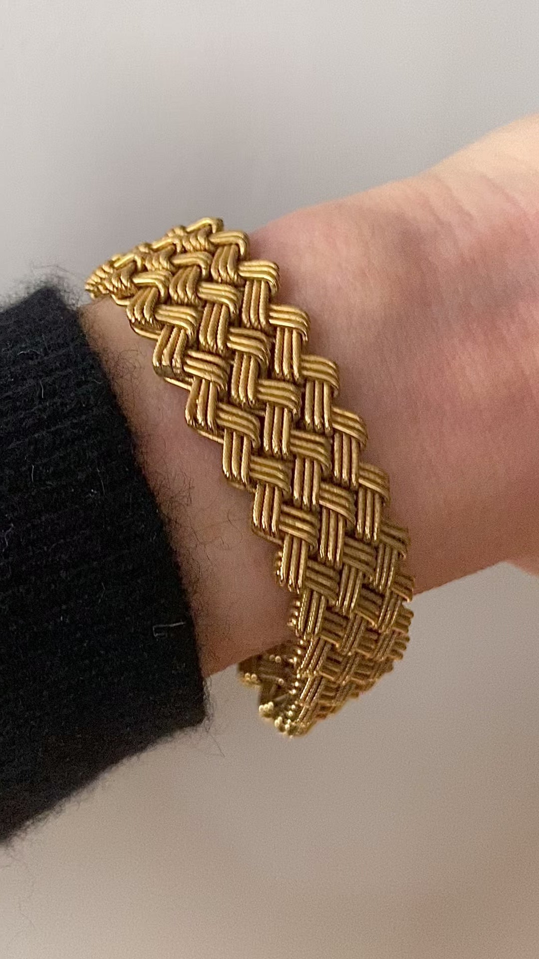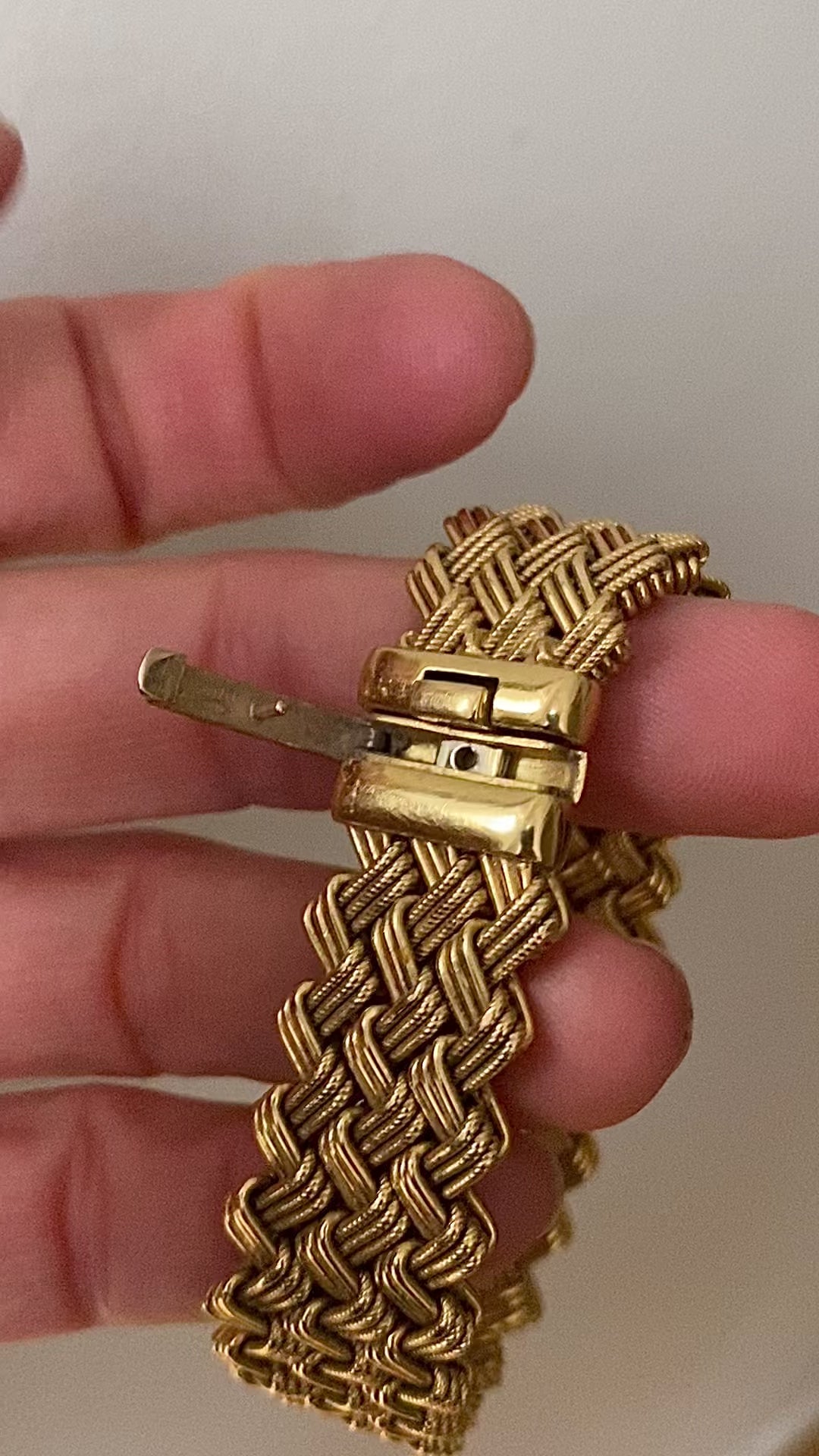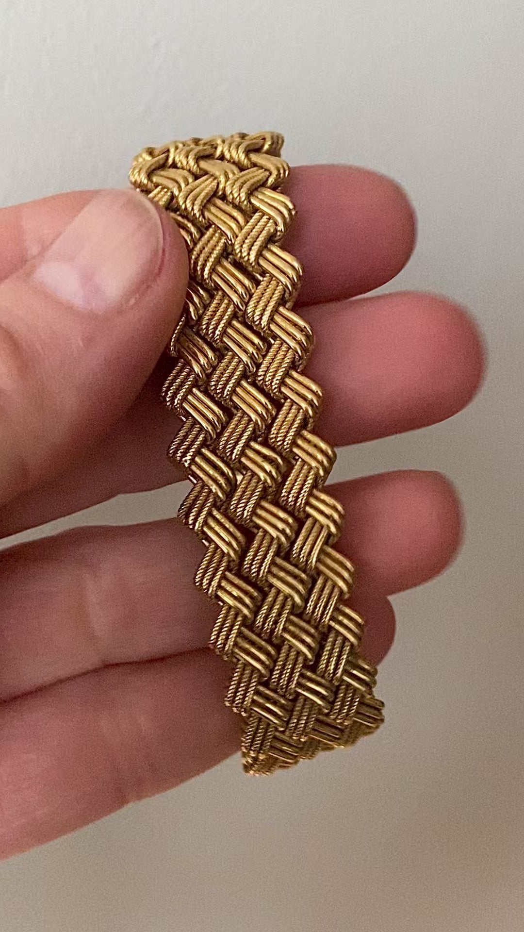 DESCRIPTION FROM ELISA: Boy do I love this bracelet: the woven pattern, the slinkiness, the color of the 18K and the wonderful feel on the wrist! I wanna keep it. Been hoarding it. Been wearing it. But gonna reluctantly let it go.
