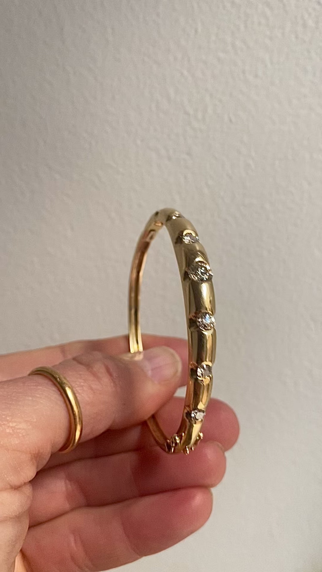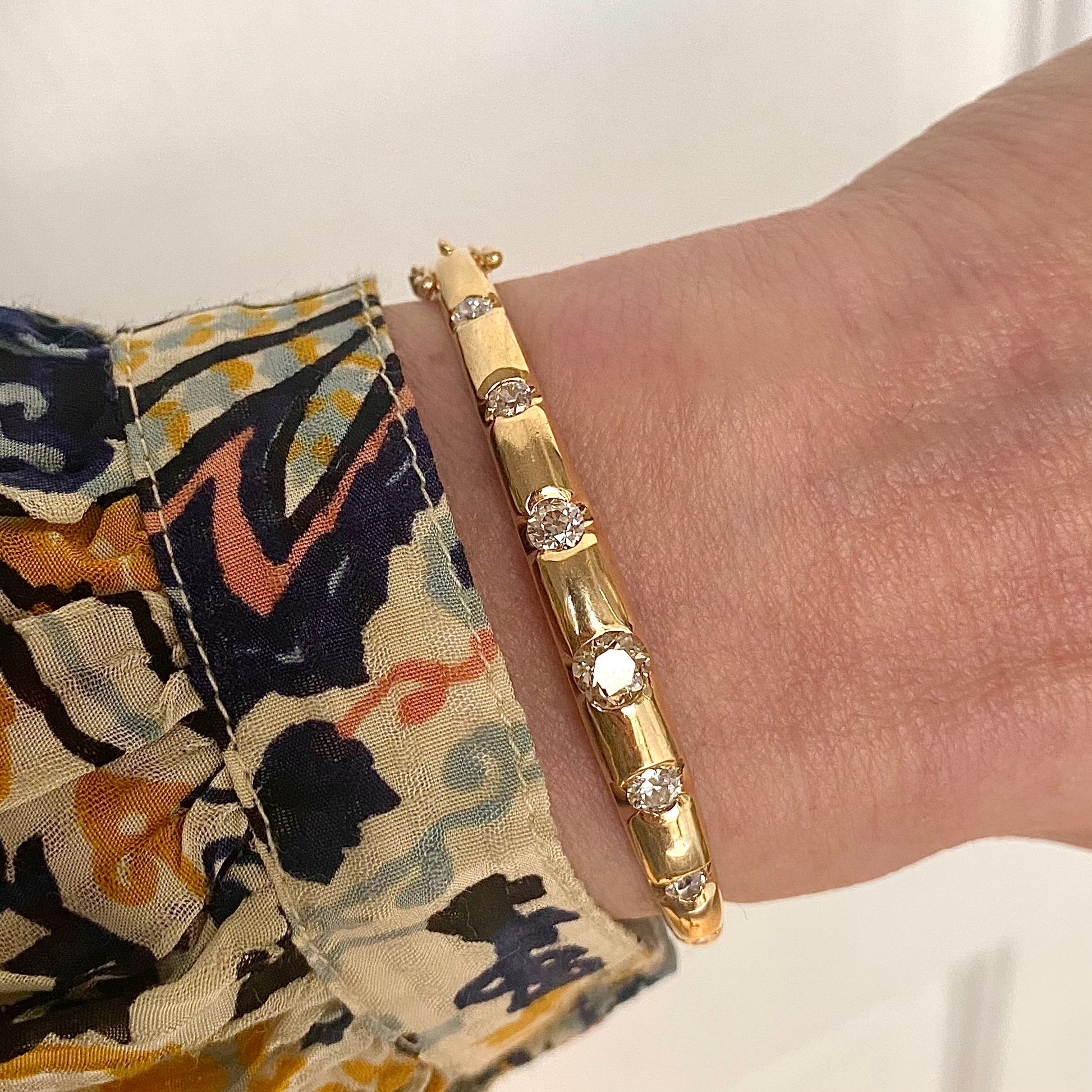 DESCRIPTION FROM ELISA: Anyone in the market for a diamond bangle? Because you won't find one finer than this! The center old Euro cut diamond is a chunky 6mm...about .85 carats. TCW of all seven diamonds is at least 2.3 carats. Oval in shape to show the beautiful diamonds face-up! Interior circumference of 6.5" (perfect on my 6" wrist,) hinge for easy on-and-off, with two safety latches.