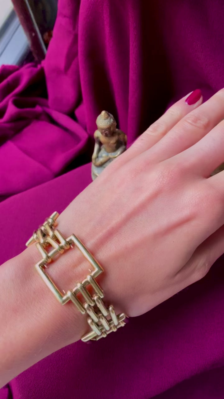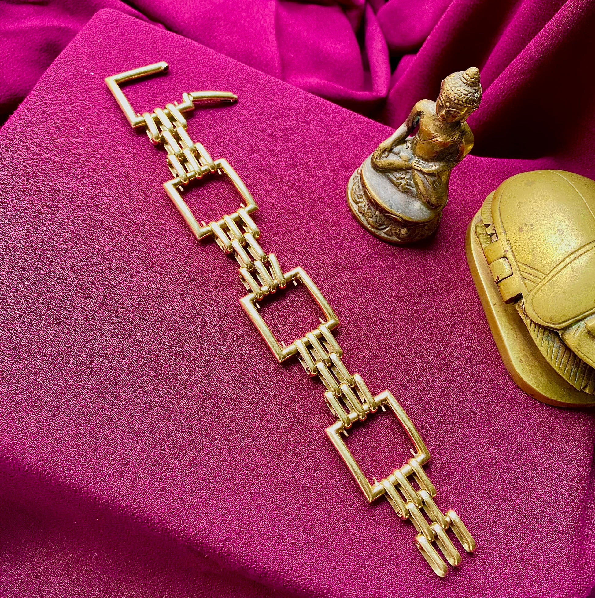 DESCRIPTION FROM ELISA: If this bracelet doesn’t evoke a WOW I don’t know what will. This geometric bracelet from the 1970s features bold squares linked with mesh-like links. I feel like you can always tell the quality of something by its clasp, and this case is no exception: perfectly integrated into the design and invisible when worn.