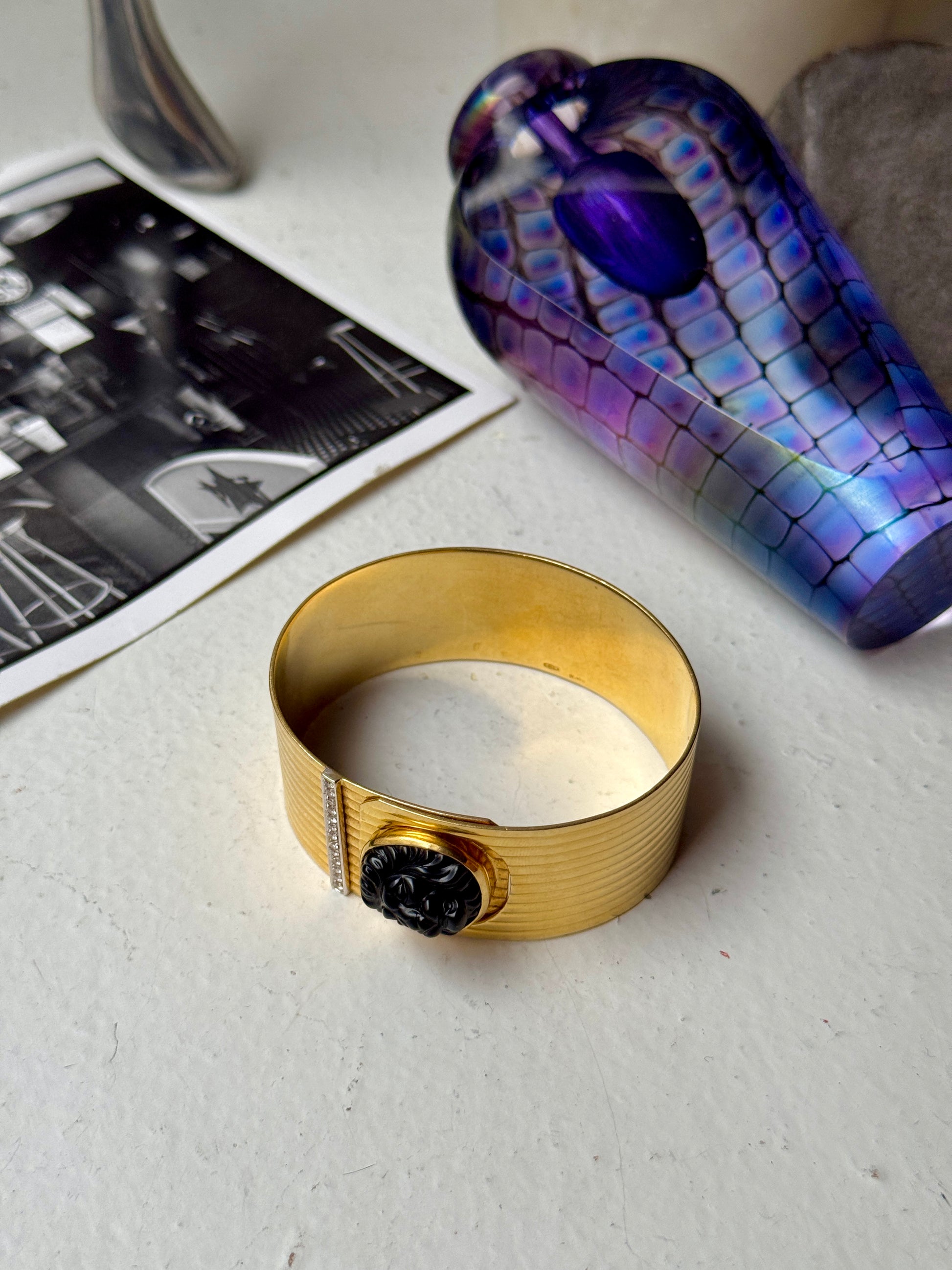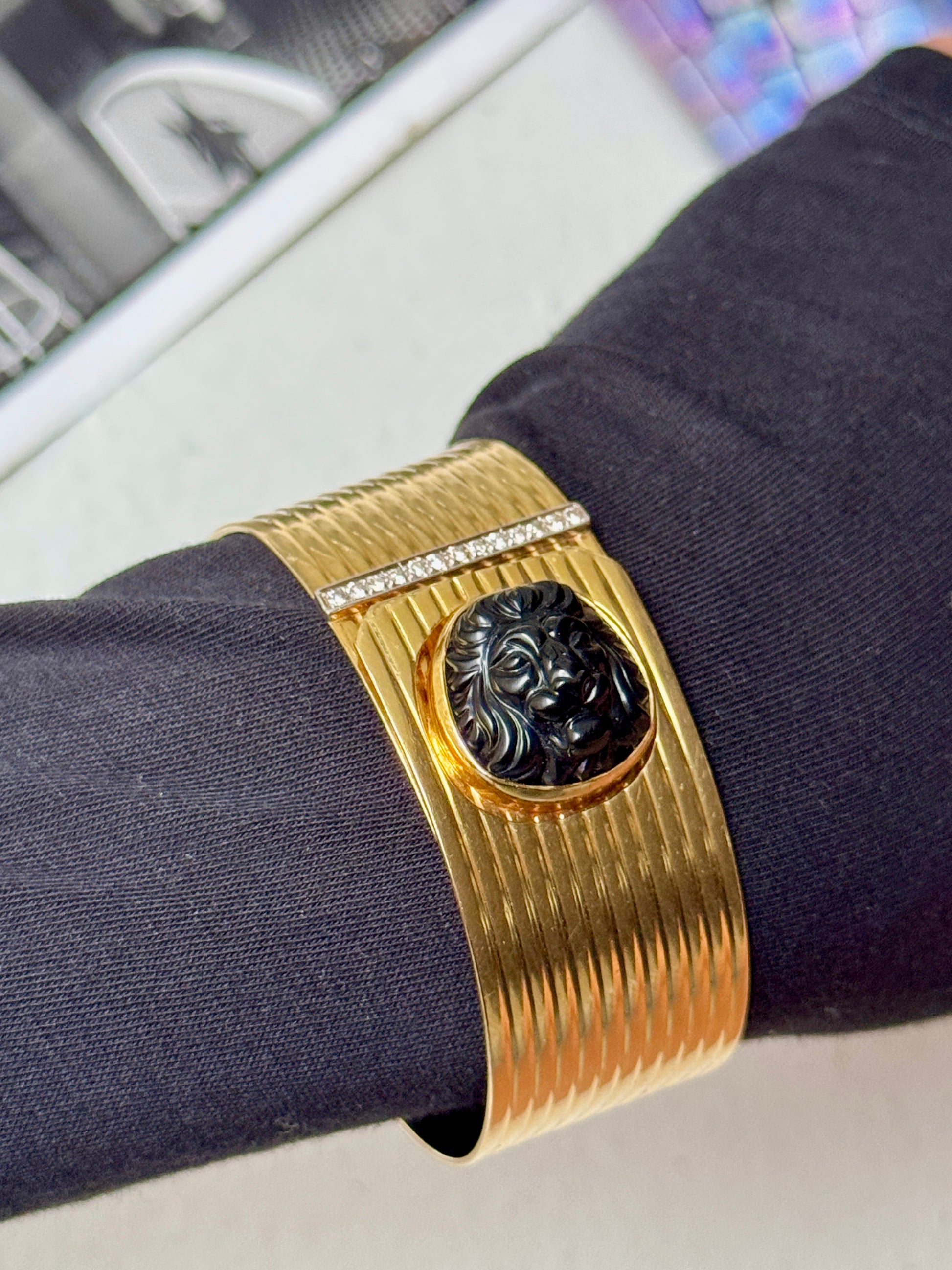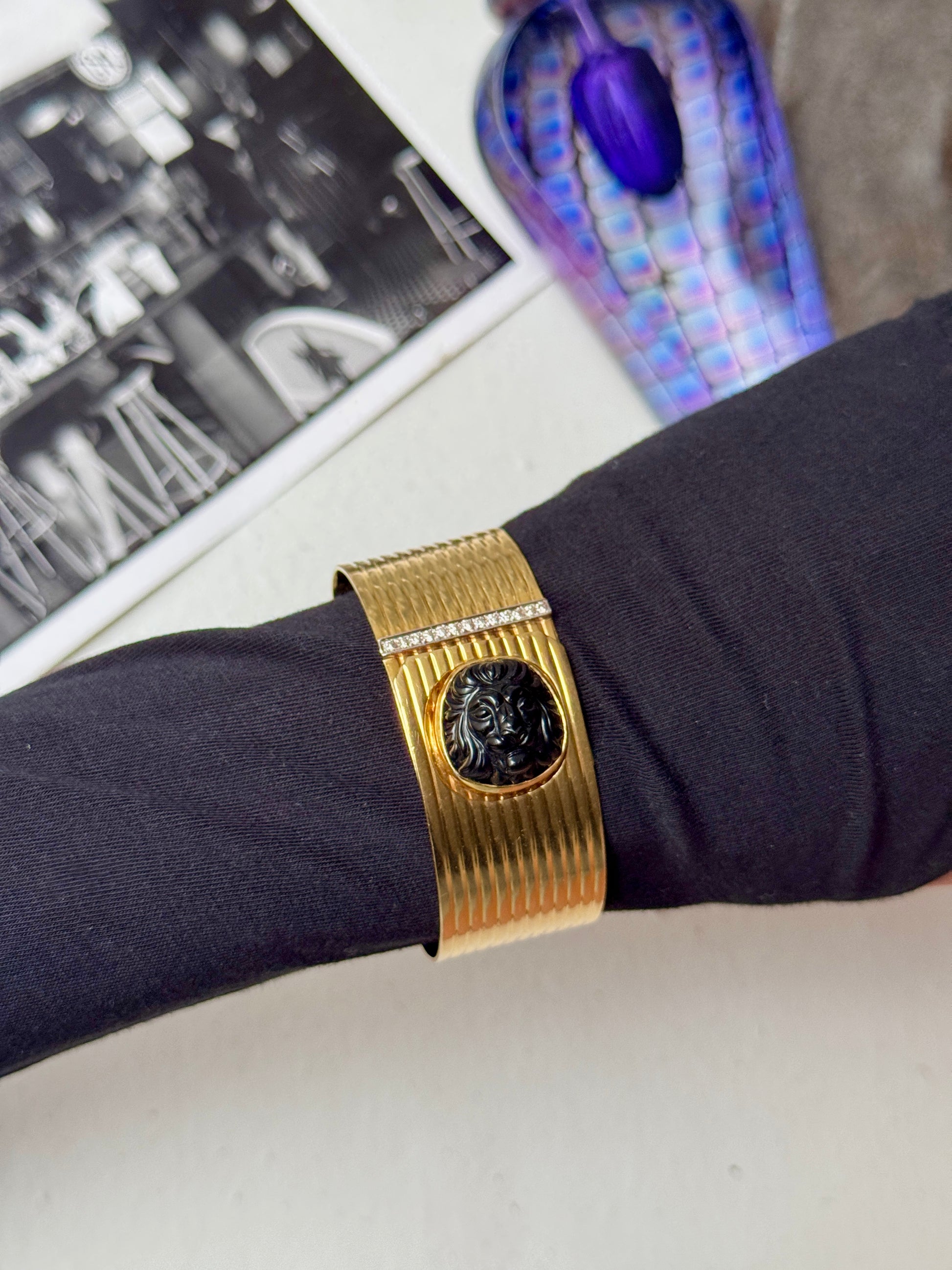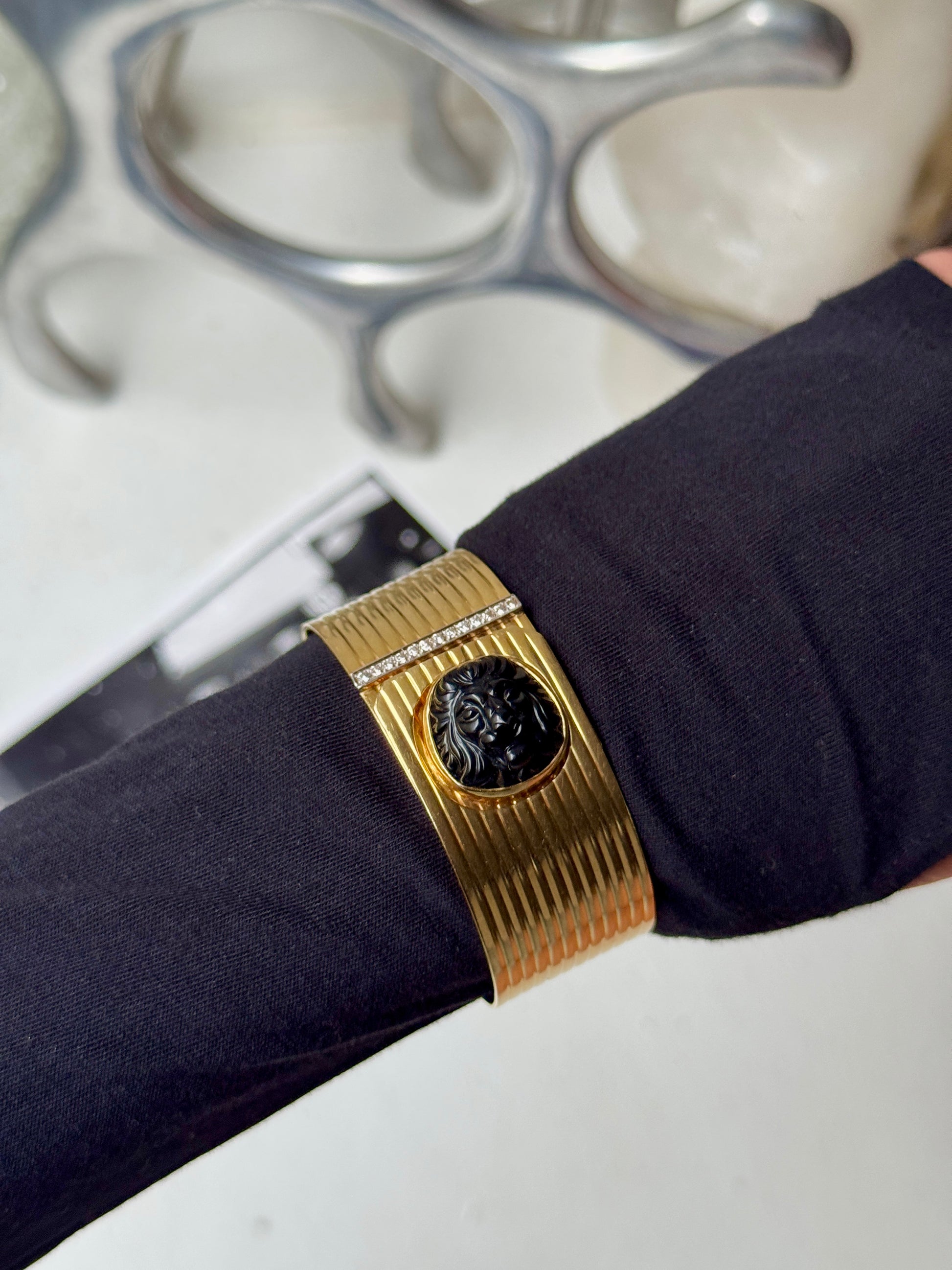 🤫 Not for the faint of wrist. This massive vintage gold cuff is chunky, heavy, bold, and of course, gorgeous… the piece features a roaring lion made from black onyx embellished on a ribbed surface finished with diamond details. The wraparound silhouette is so cool and unique, with a concealed closure that uses the lion to snap shut! It’s really a fab bracelet that needs a fab home 🦁❤️ 7 inches in internal circumference, weighs a whopping 57.4 grams of solid 18k yellow gold— priceless but letting this baby go for $6555