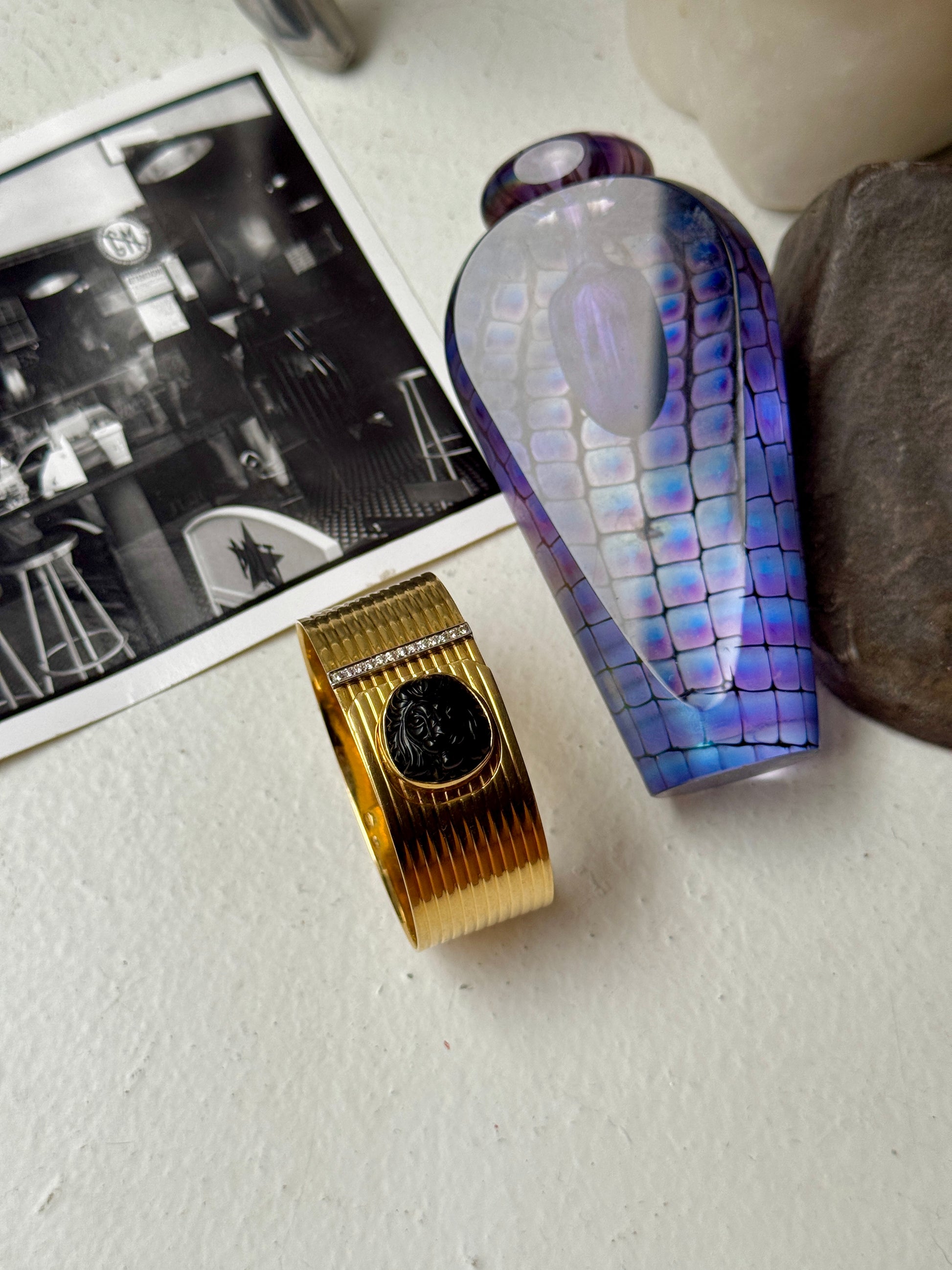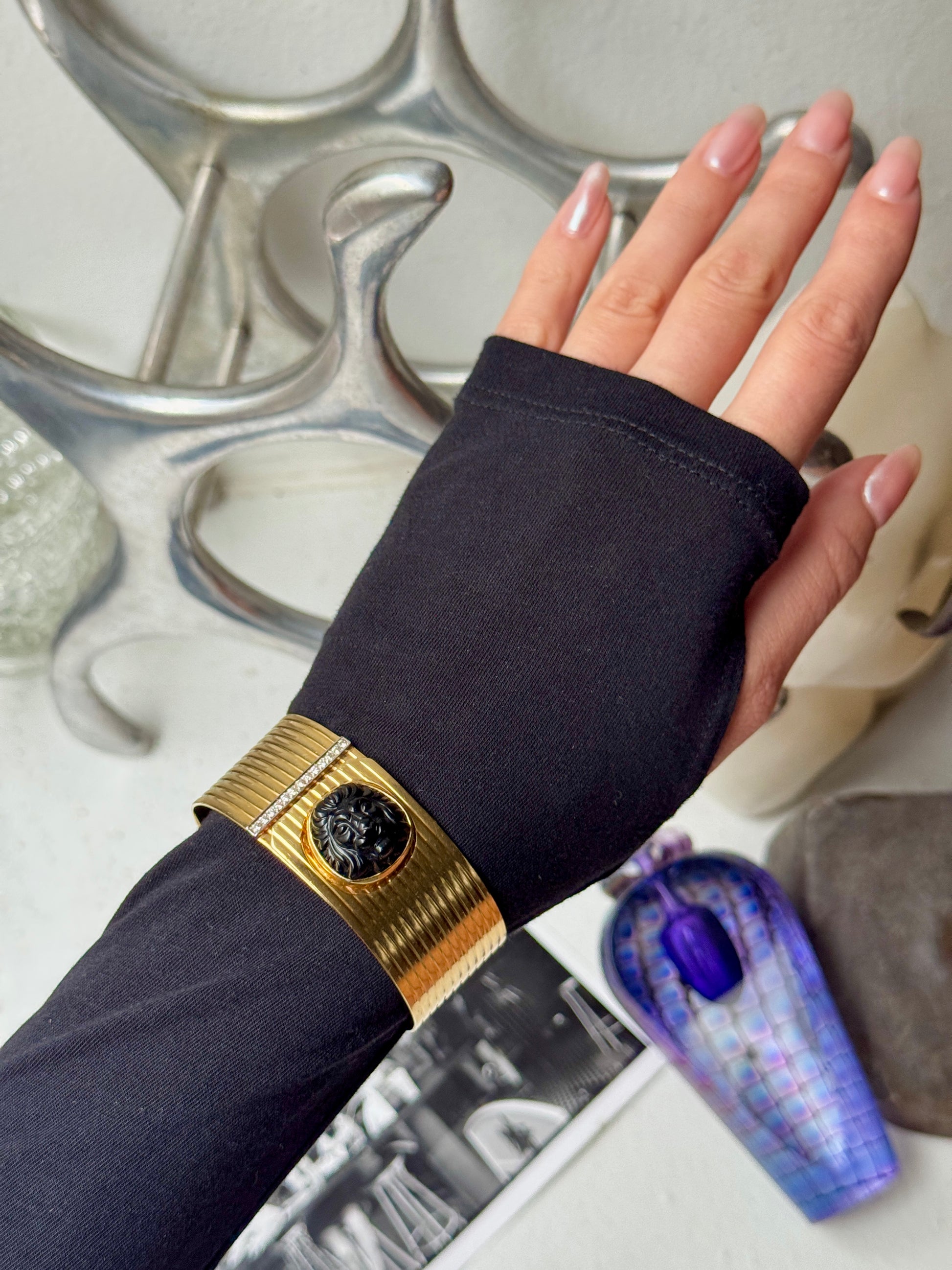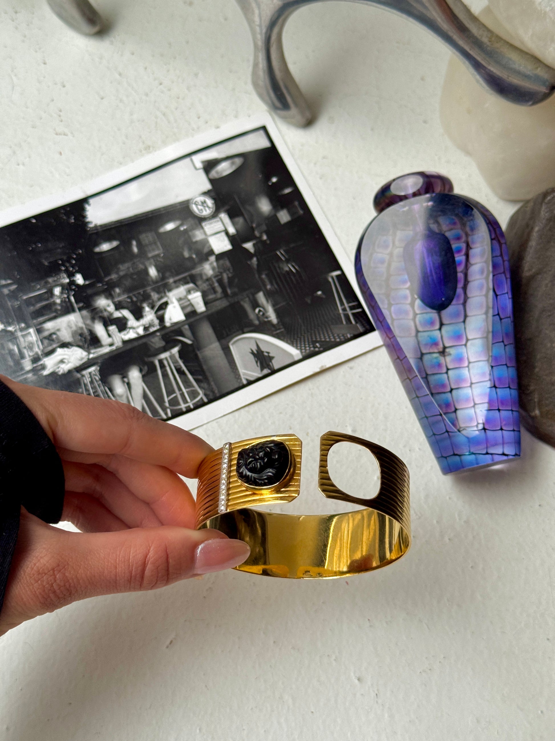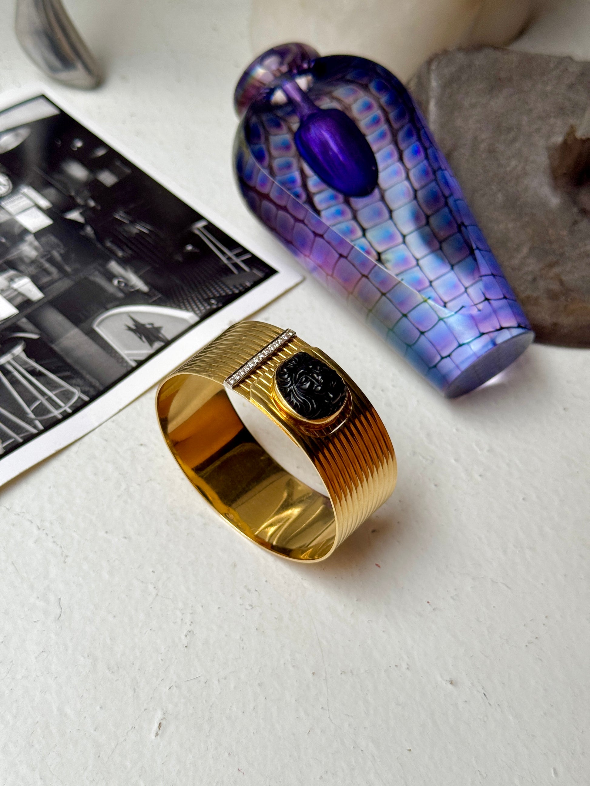 🤫 Not for the faint of wrist. This massive vintage gold cuff is chunky, heavy, bold, and of course, gorgeous… the piece features a roaring lion made from black onyx embellished on a ribbed surface finished with diamond details. The wraparound silhouette is so cool and unique, with a concealed closure that uses the lion to snap shut! It’s really a fab bracelet that needs a fab home 🦁❤️ 7 inches in internal circumference, weighs a whopping 57.4 grams of solid 18k yellow gold— priceless but letting this baby go for $6555