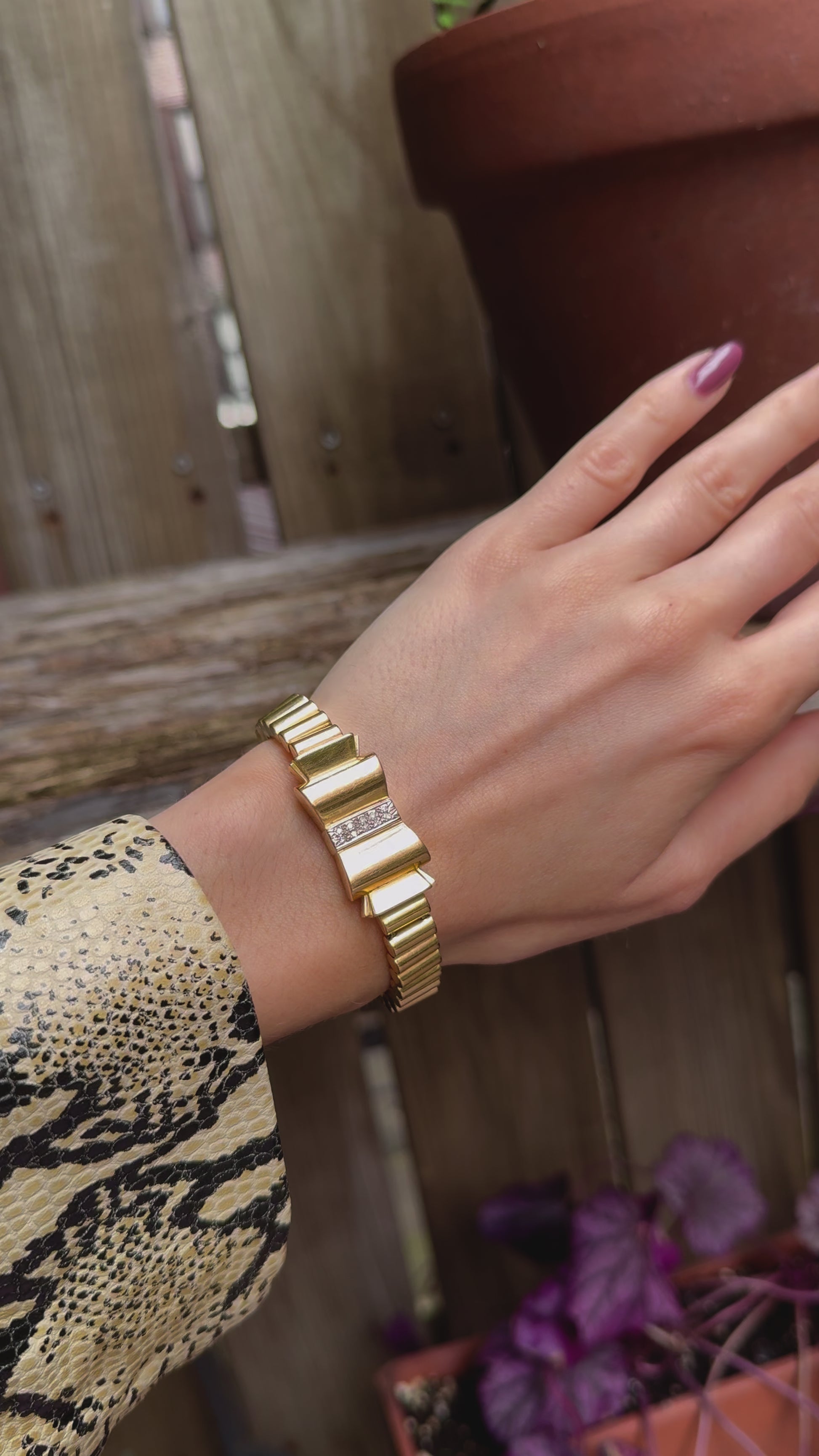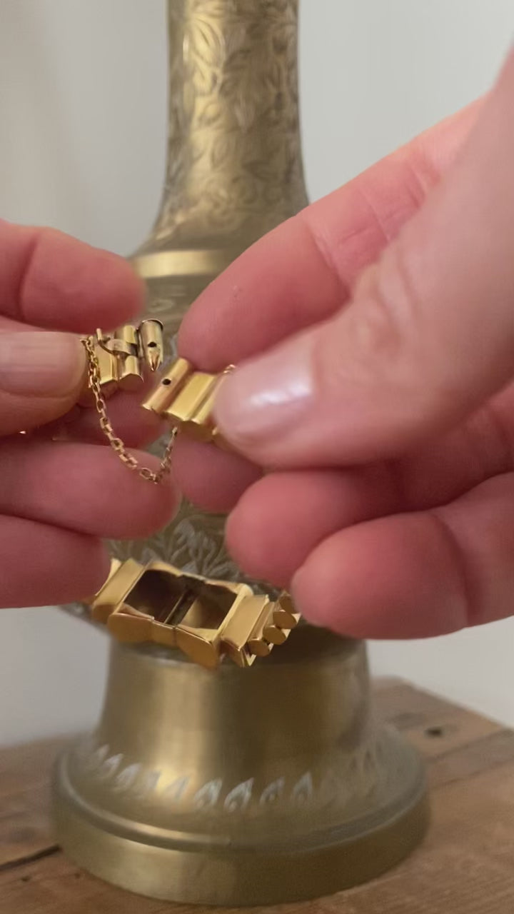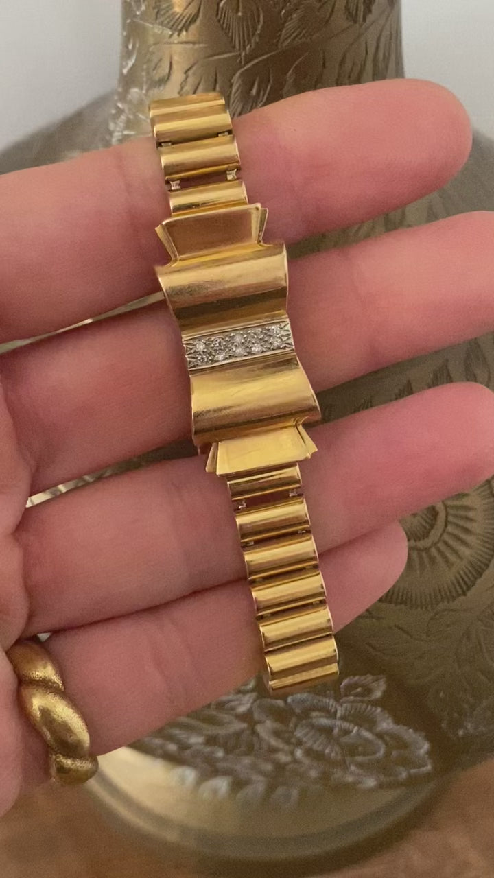 This phenomenal retro-era tank bracelet came from my Paris dealer and I love the contrast of the chain, which has the look of a bandolier, and the feminine bow. And those diamonds! It's a chunker...45 grams...and has the most unusual clasp that resembles a bullet and its casing