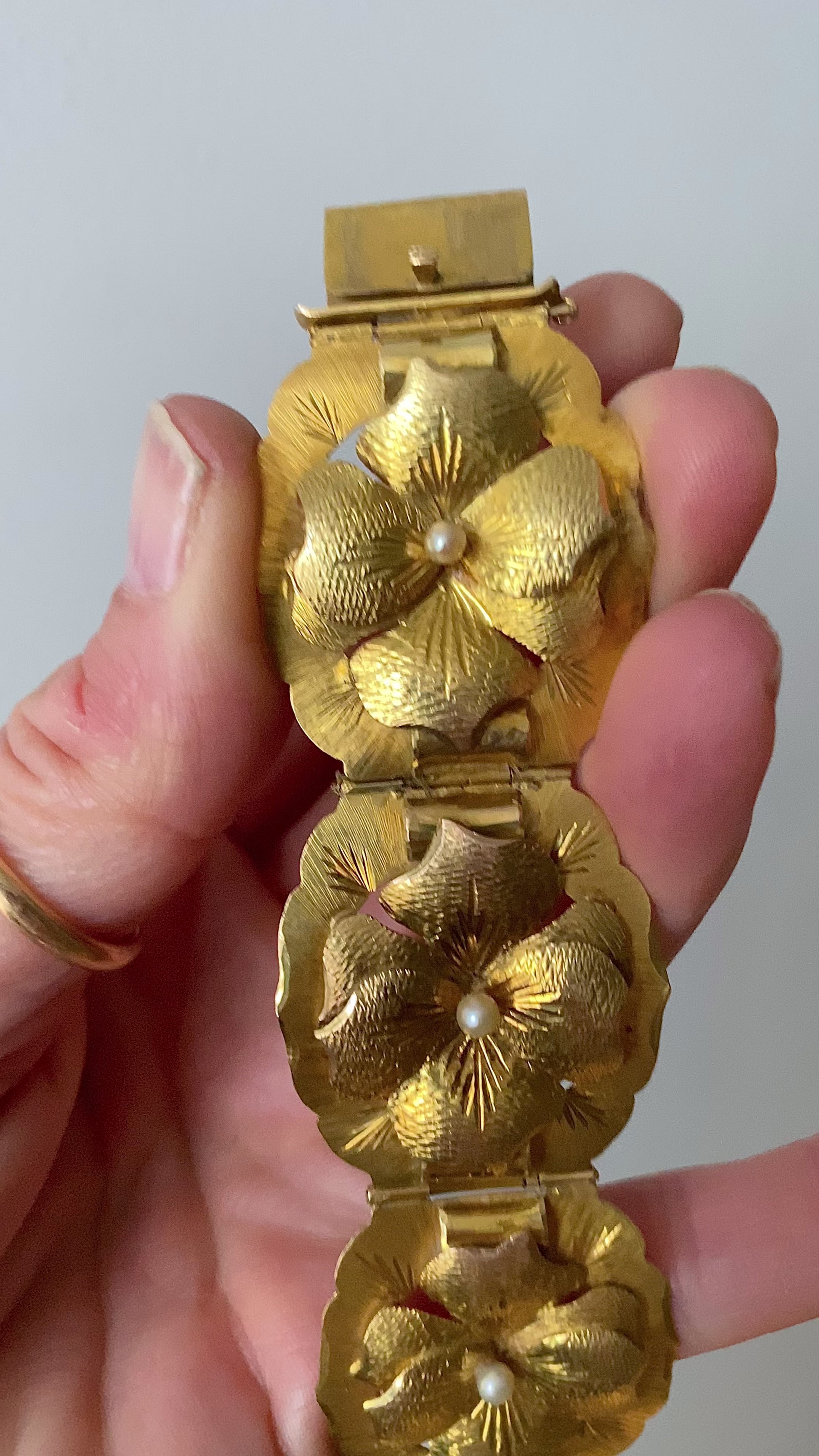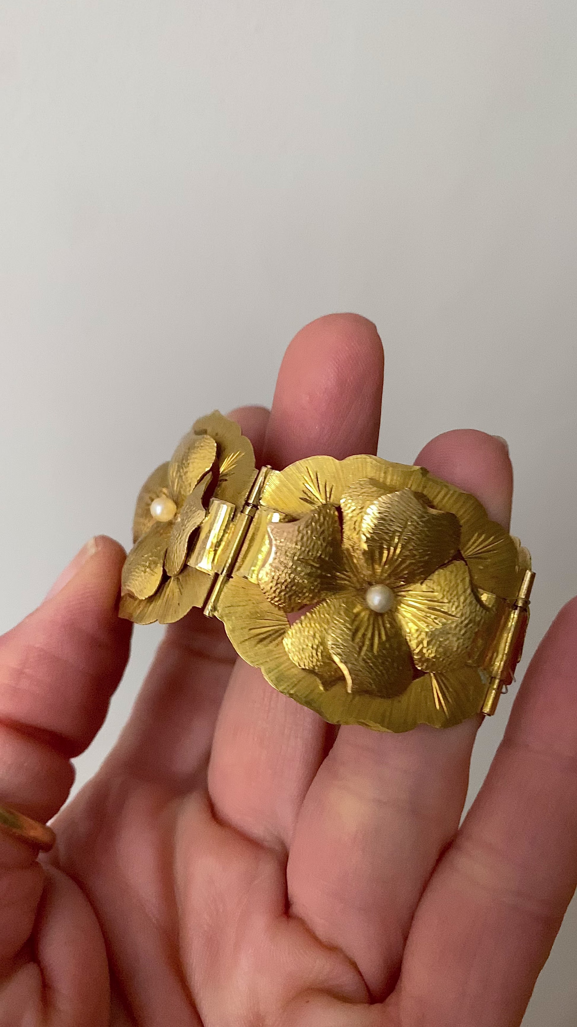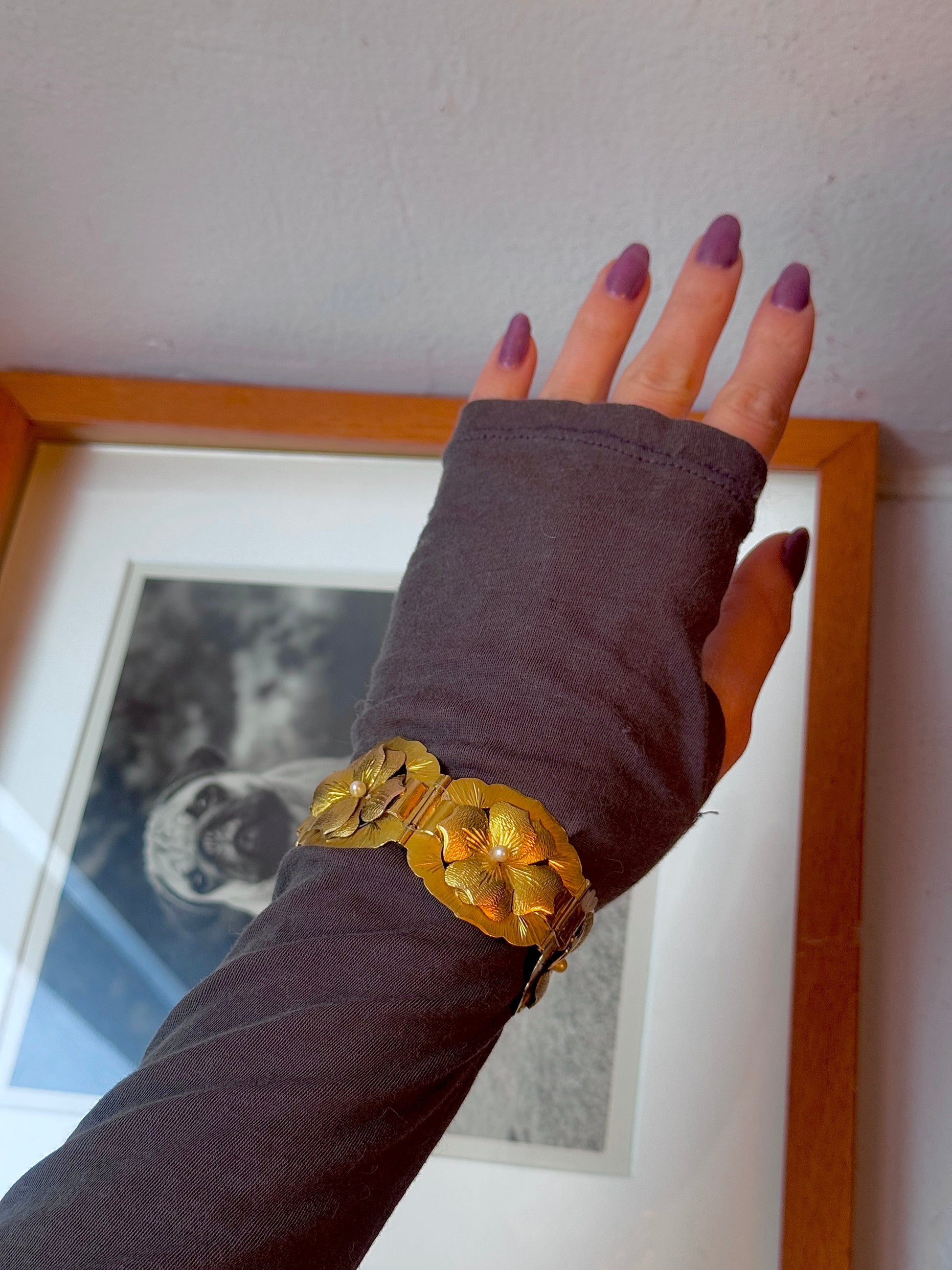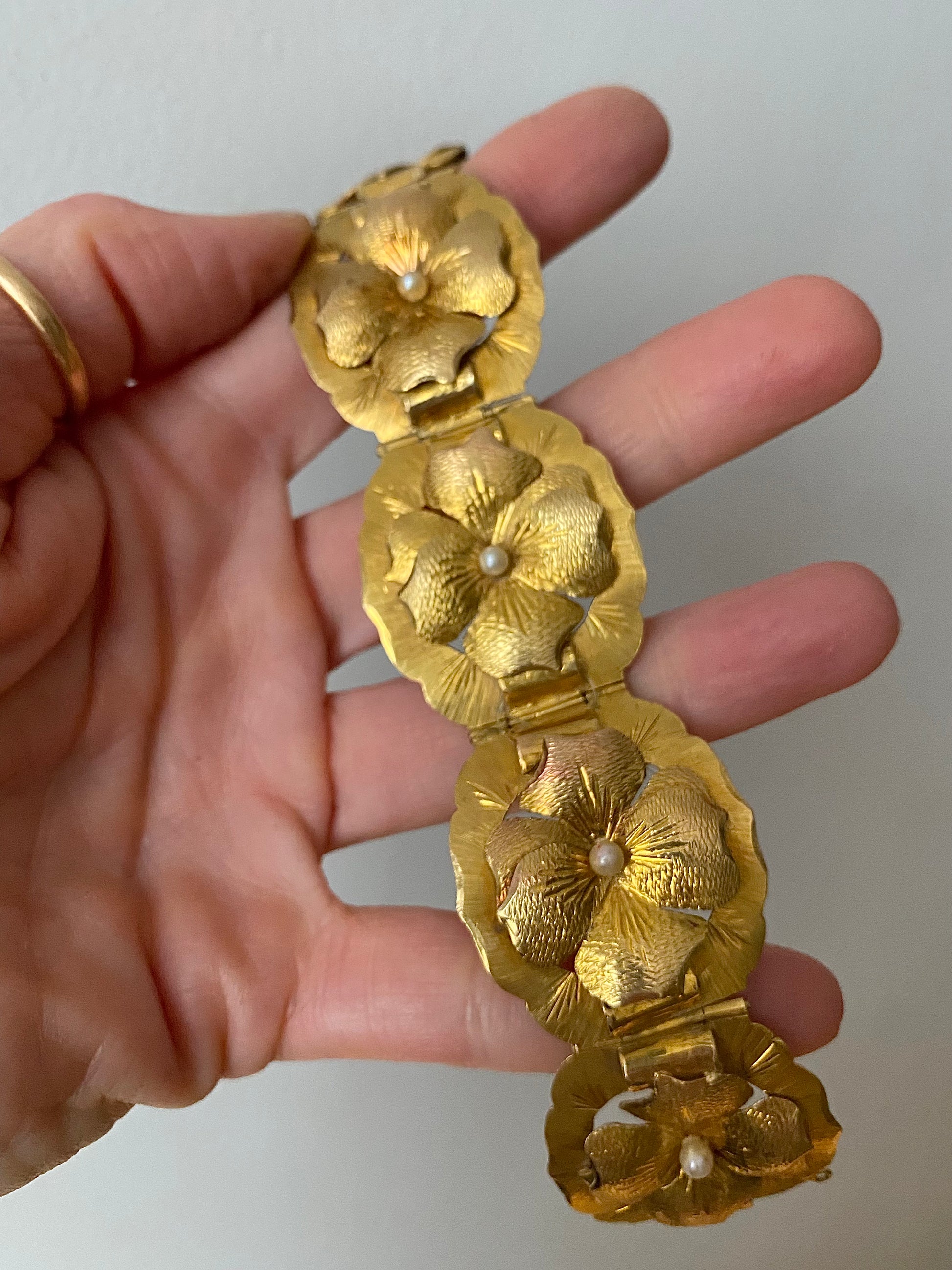 I love any kind of jewelry that depicts nature, but I especially love flowers! This bracelet is so special: it's all handmade and the flowers are so realistic. Does anyone know what kind of flowers they are? Each one has a pearl in its center. Missing its safety chain, but has the loops for it so one can be put on easily. The rest of the bracelet is perfect! From the retro (30s/40s) era, possibly earlier