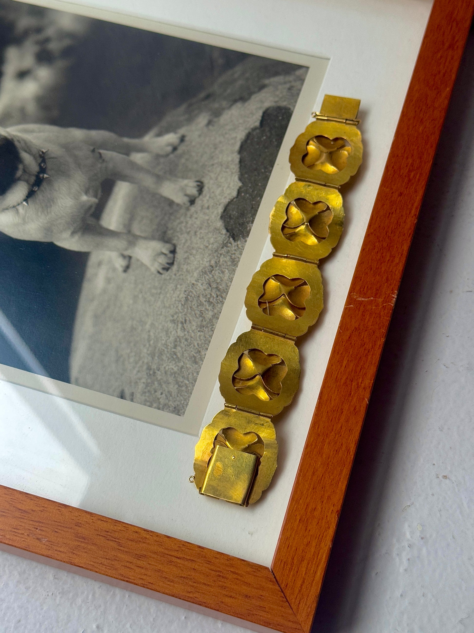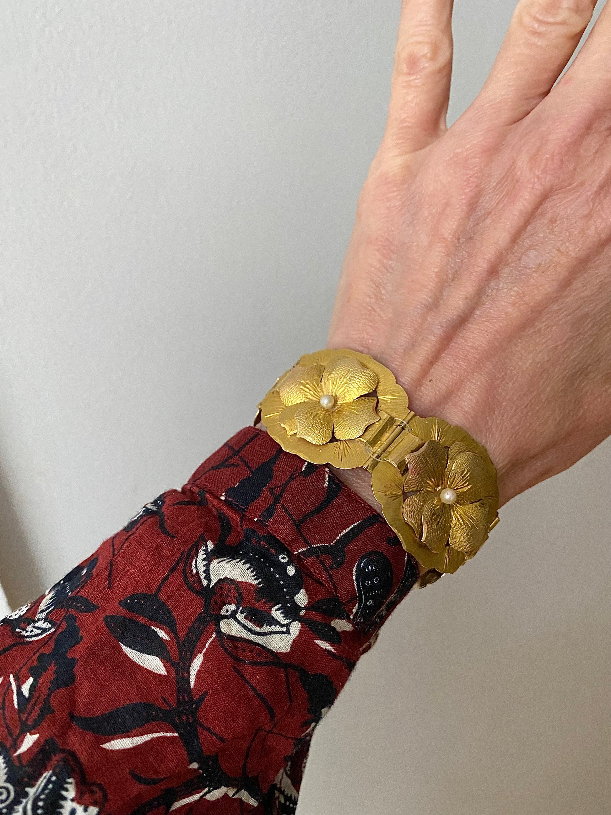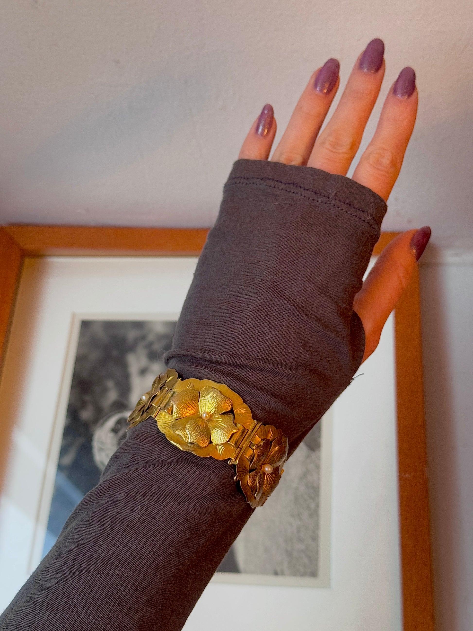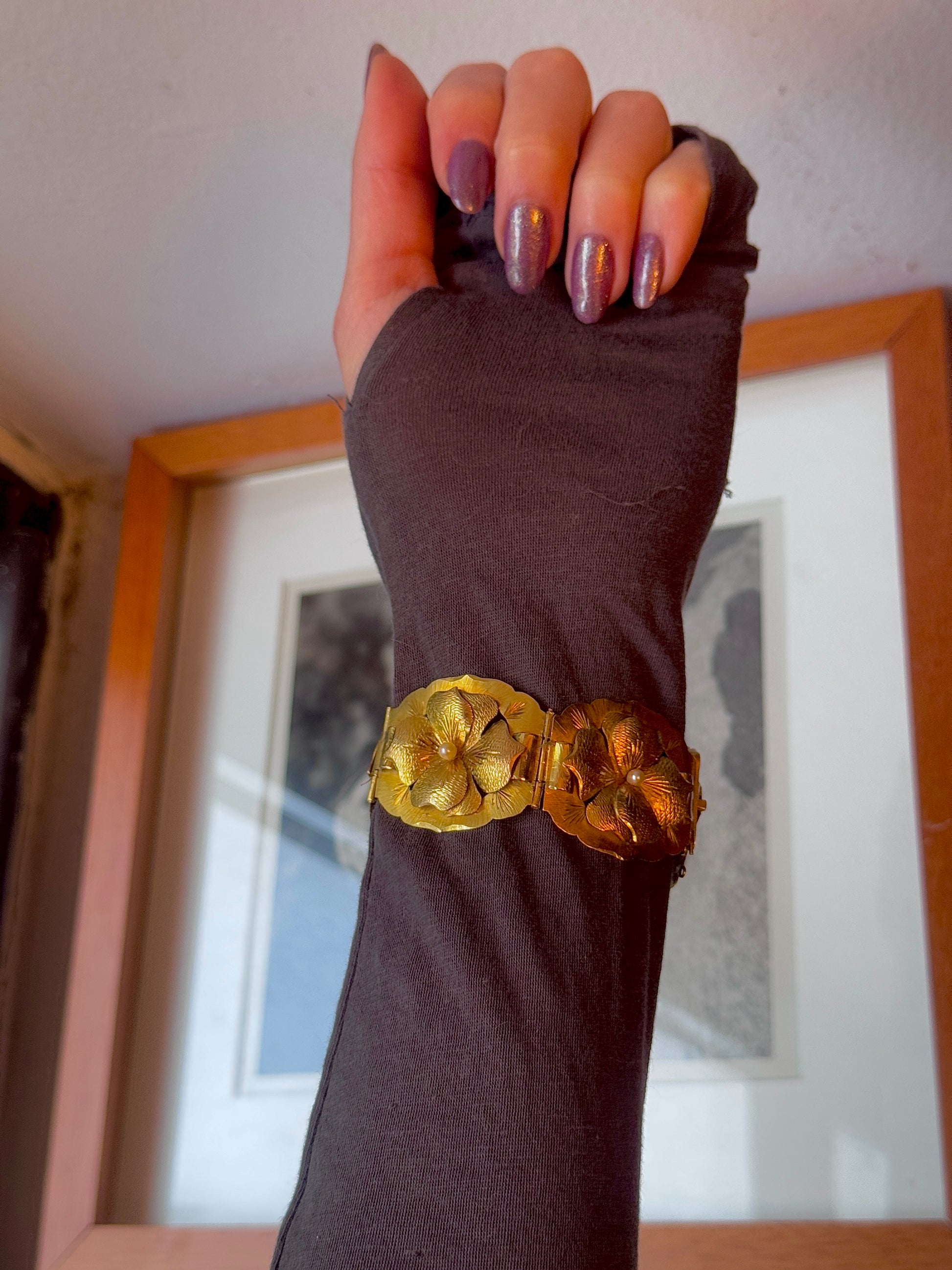 I love any kind of jewelry that depicts nature, but I especially love flowers! This bracelet is so special: it's all handmade and the flowers are so realistic. Does anyone know what kind of flowers they are? Each one has a pearl in its center. Missing its safety chain, but has the loops for it so one can be put on easily. The rest of the bracelet is perfect! From the retro (30s/40s) era, possibly earlier