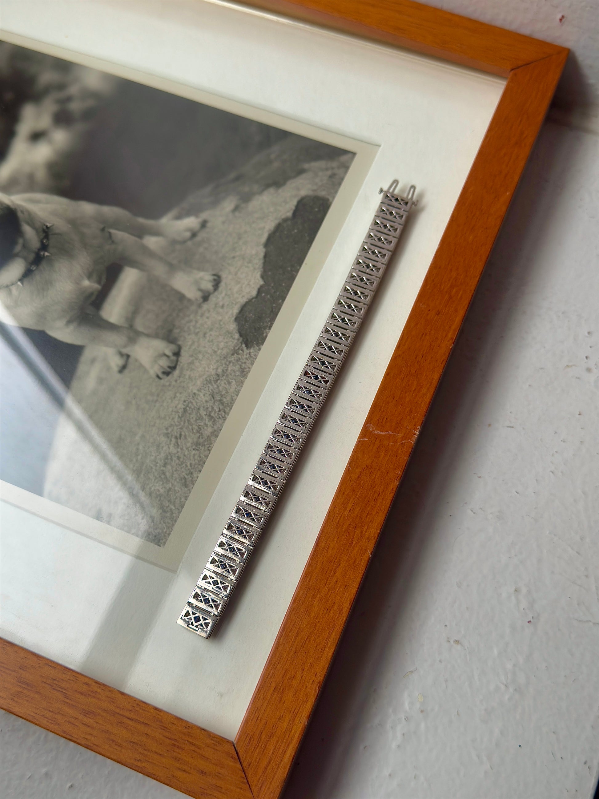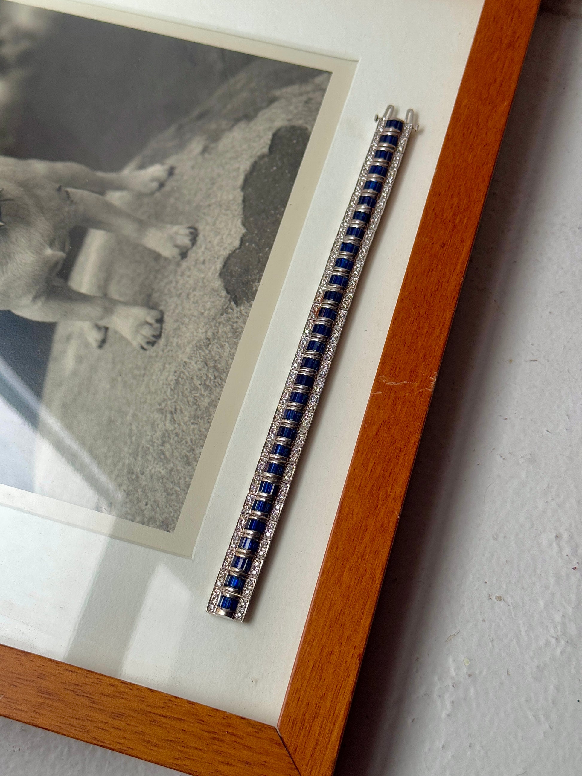 This silhouette of diamond bracelets is often called a line- or tennis- bracelet, and it adds MAJOR bling to any wrist-mess. This Art Deco one is particularly unique with lotsa sapphire baguettes (87) and lotsa diamonds (116...about 3 carats.)