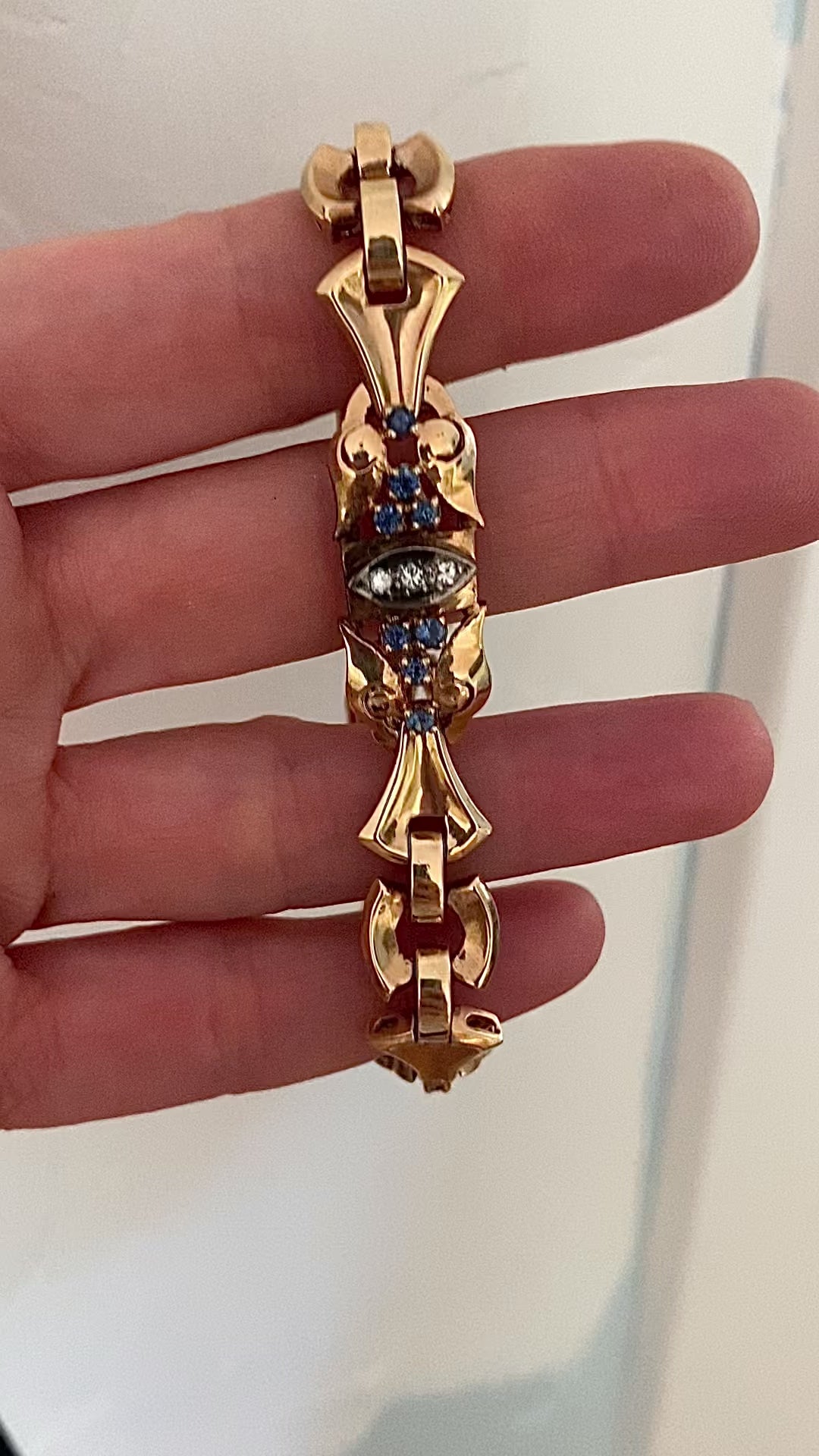 Parting will be sweet sorrow with this one. I have never seen a finer retro bracelet... and certainly never one with SAPPHIRES (lots of ruby ones out there!) It's a beautiful shade of "between-rose-and-yellow" gold, with a wonderful pattern that goes all the way around, and lots of natural sapphires and diamonds. Missing its safety chain.