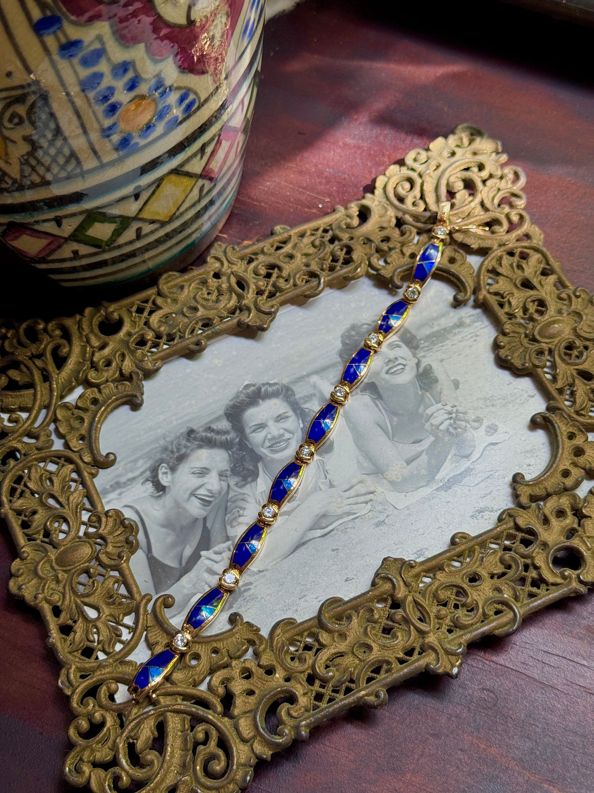 🤫 Feeling BLUE today, and I don’t mean sad! 💙 BLUE LAPIS BRACELET: A truly unique bracelet from the 80s that features inlay lapis and opal alternating with diamonds. The diamonds are .20 carats each for a TCW (total carat weight) of 1.6! 7 inches long (great for a medium-sized wrist), 29.8 grams, 14k