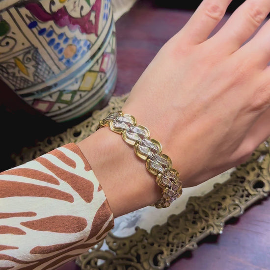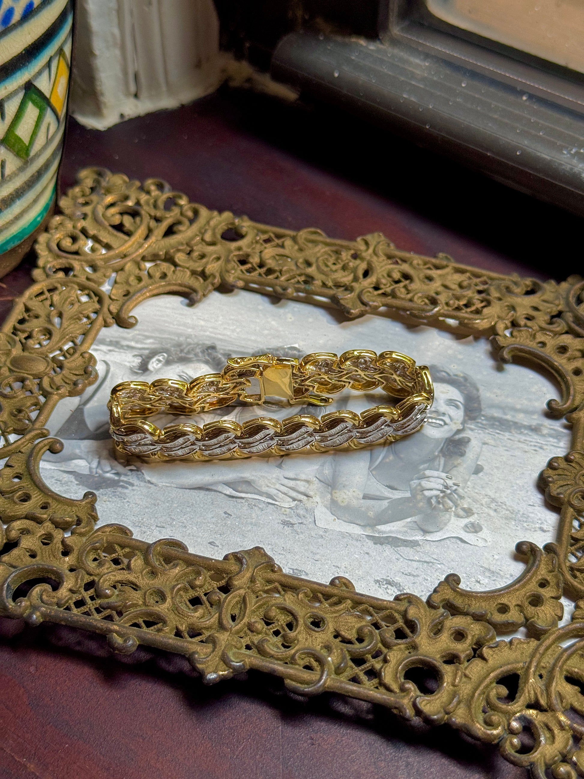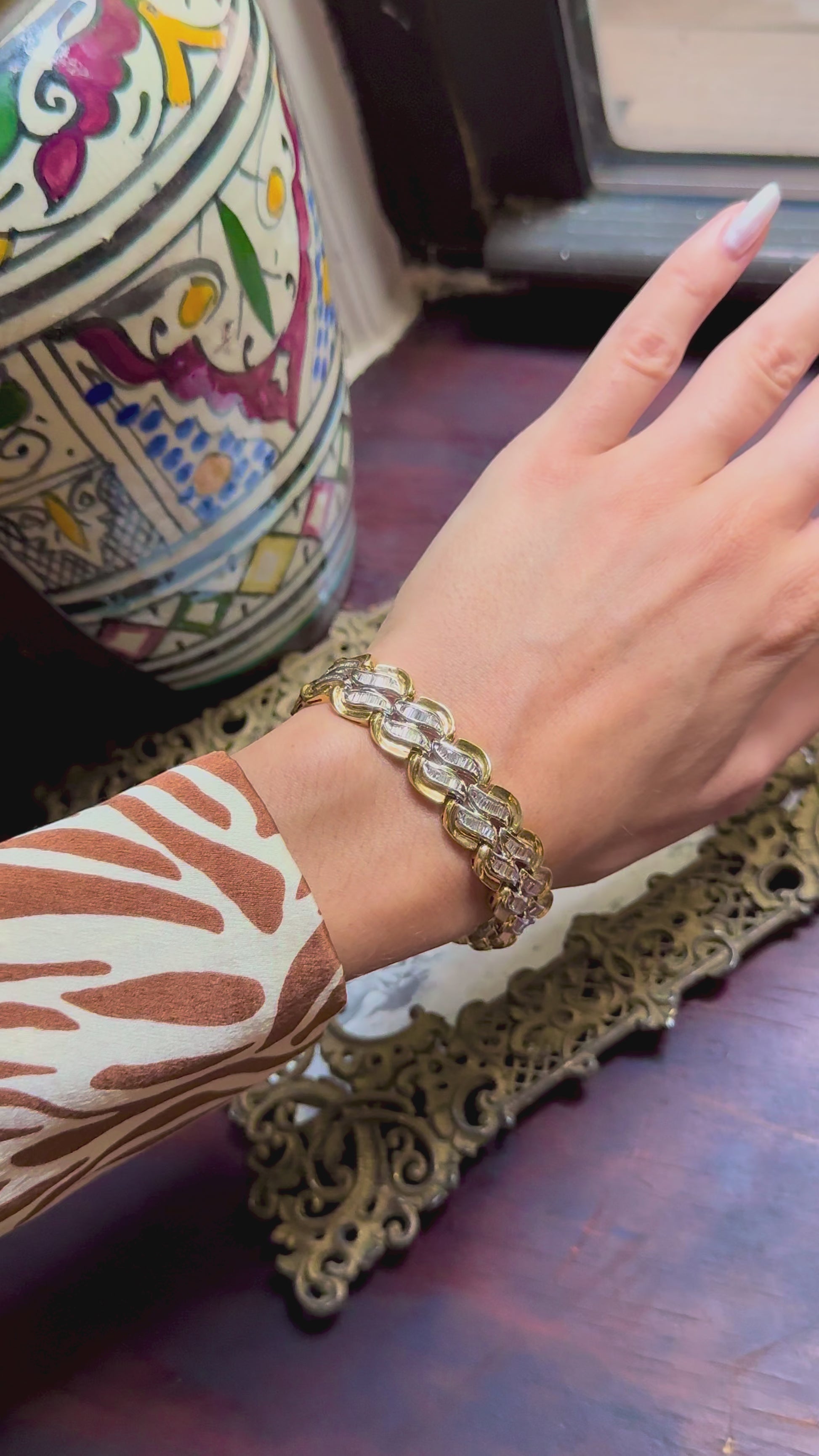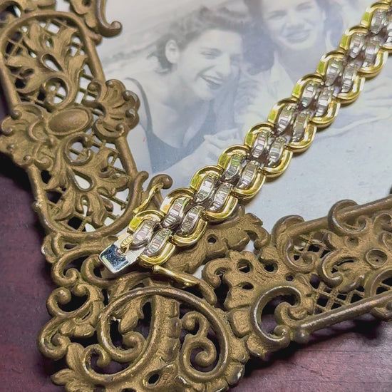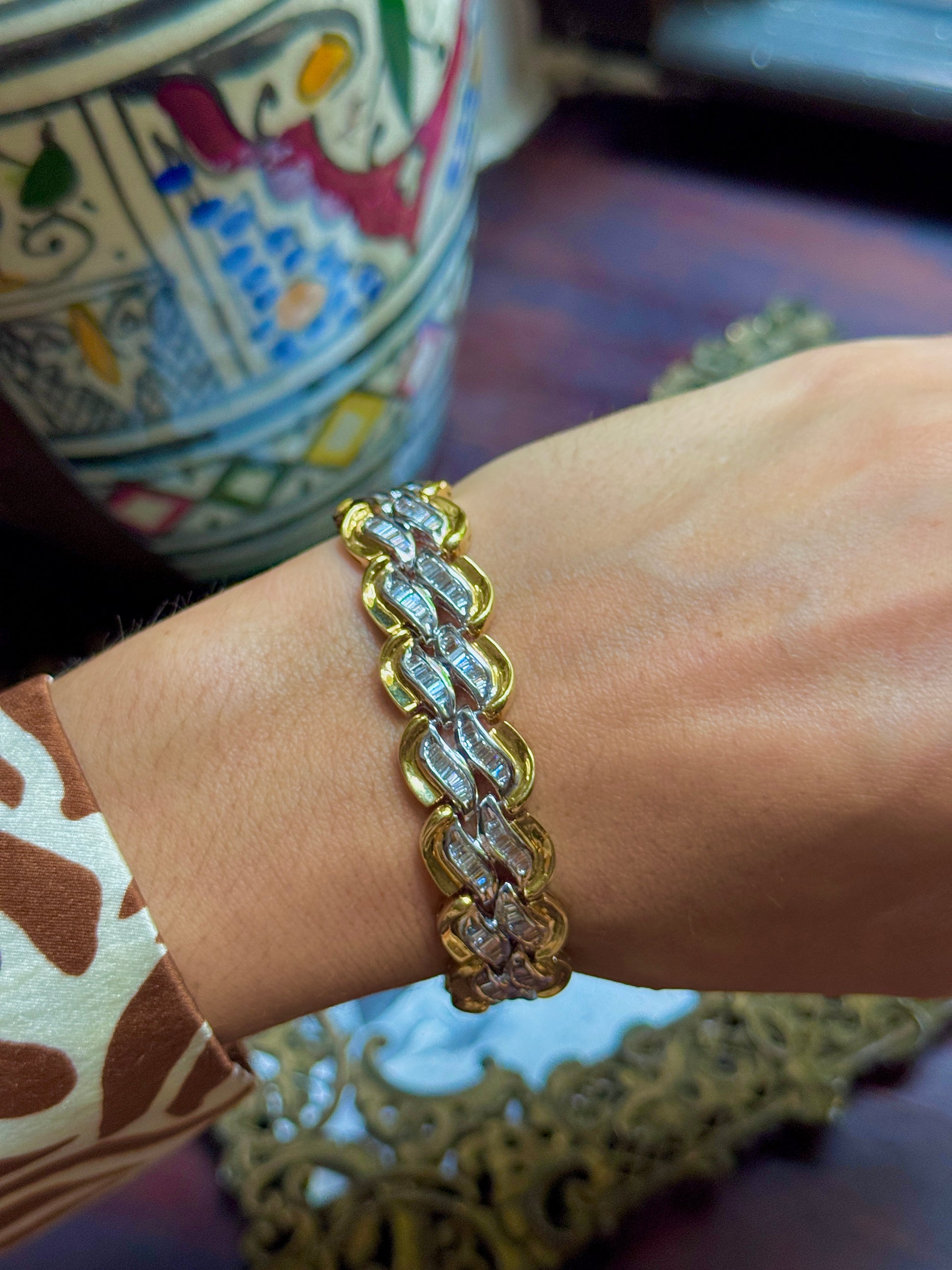 🤫 Vintage pieces like this… how can you resist!? This ridiculous bracelet has SOOOO many white, sparkly, baguette diamonds (my fav), totally about 5.5 carats (TCW). It’s a rich shade of 18K (no hallmarks but likely European), obviously very high-quality, definitely partly due to it’s heavy weight of almost 40 grams… really it’s a good financial investment 😉 7 inches long (good for a medium-sized-wrist), 15mm wide, 39.7 grams, 18k