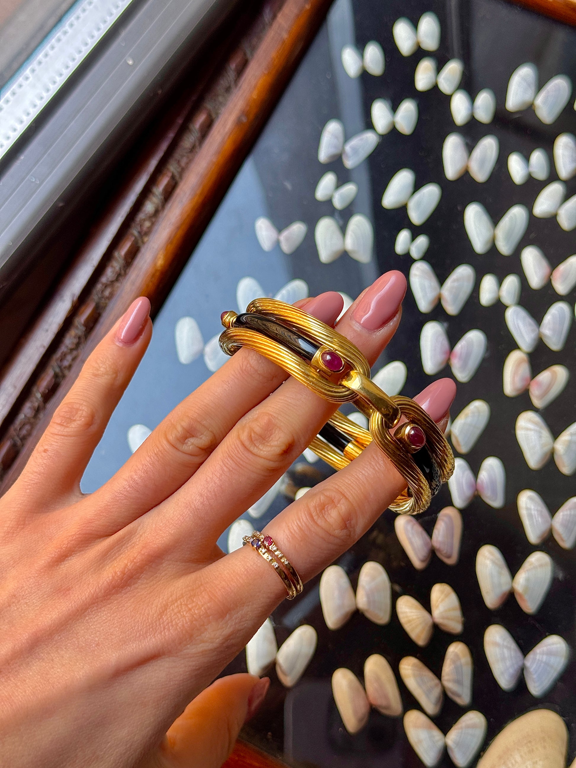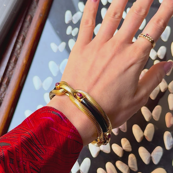 🤫 Maximalism, meet minimalism! This 1970s bracelet is so chunky that it technically only has three "links!" Each link features a large, curved piece of onyx and two natural ruby cabochons...truly a unique (and gorgeous) design. Surprised there's no hallmarks as this was obviously a high-end piece owned by a fancy ladyyyyy — interior circumference measures 6.75 inches (great for a medium sized wrist,) weighs a whopping 55.5 grams of solid 18k yellow gold