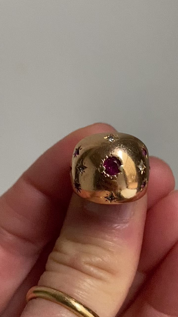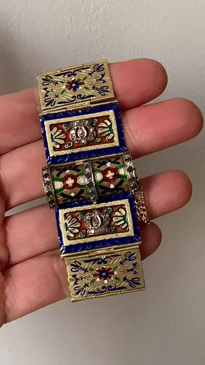 DESCRIPTION FROM ELISA:Yup, junk pile. And I've never seen anything like this bracelet! It folds perfectly into a tiny book and can be worn as a pendant. But the incredible enamel work shines when it's worn as a bracelet! The enamel is in excellent condition…oh, and look at all those natural sapphires and tons of rose cut diamonds! It has an interesting hallmark which I haven't been able to place… 585 for 14K and the number 20.