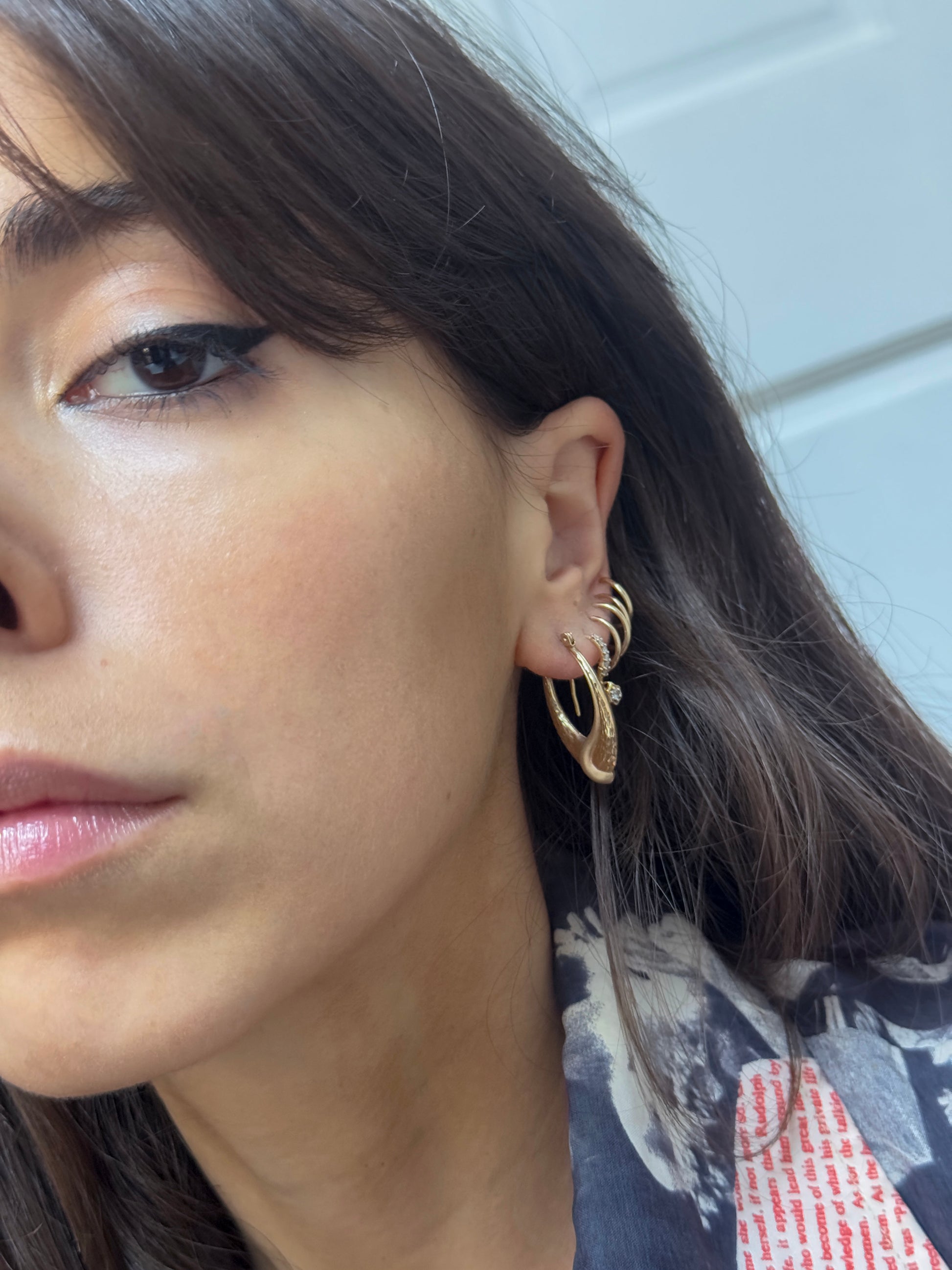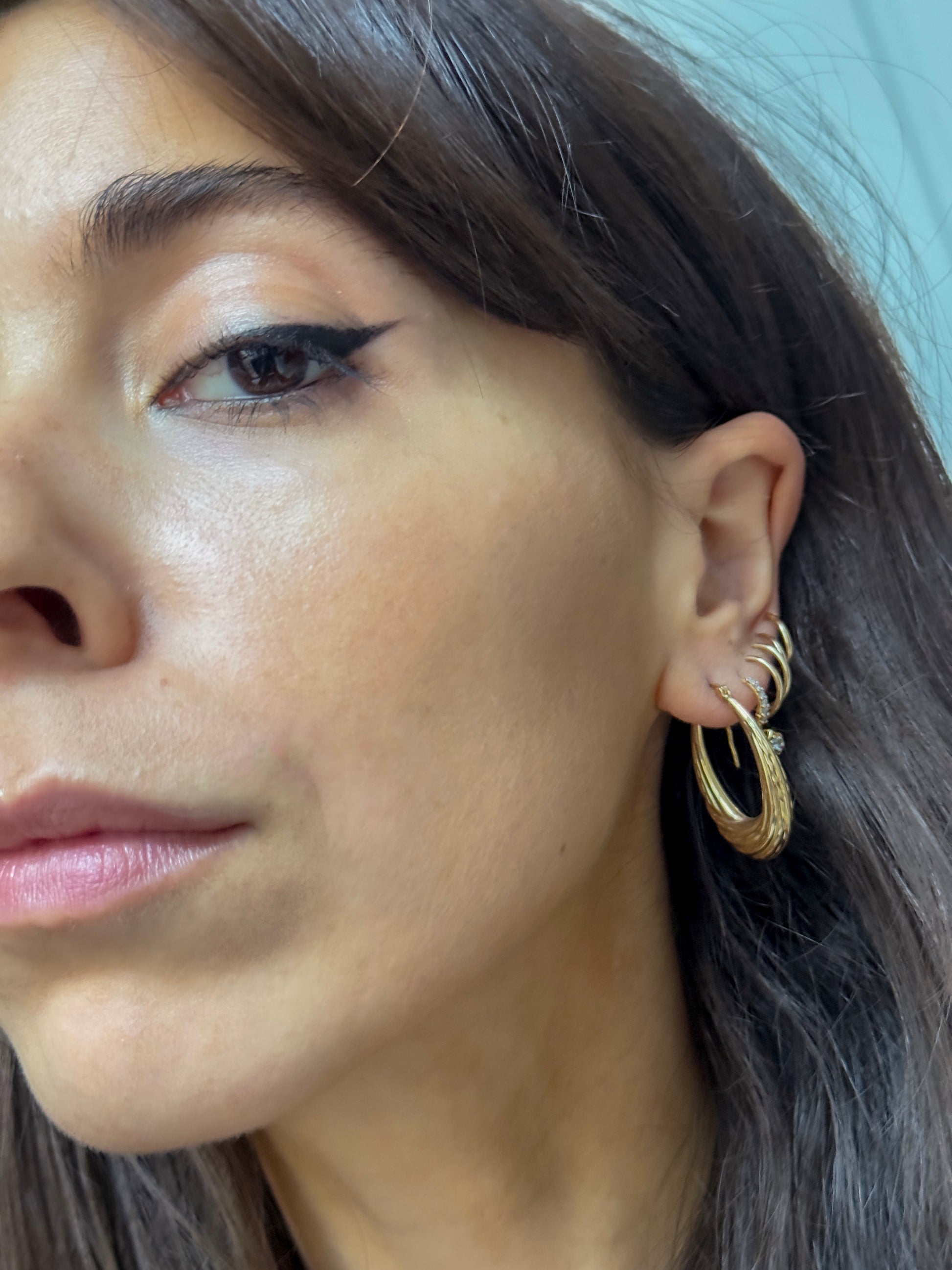 PUFFY OVAL HOOPS 2 (middle right): Graduating silhouette with pointed-ribbed texture, 30mm, 2.6 grams, 14k, $445