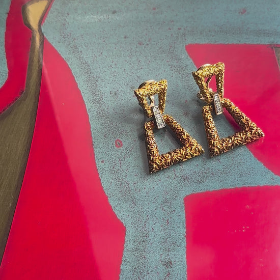 🤫 These vintage earrings check all the boxes! Geometric, textured, movement, beauty!!! Diamond details top it all off. Currently fitted for non-pierced ears, but we can convert them to pierced for free. 34mm, 16.9 grams, 18k, $2595