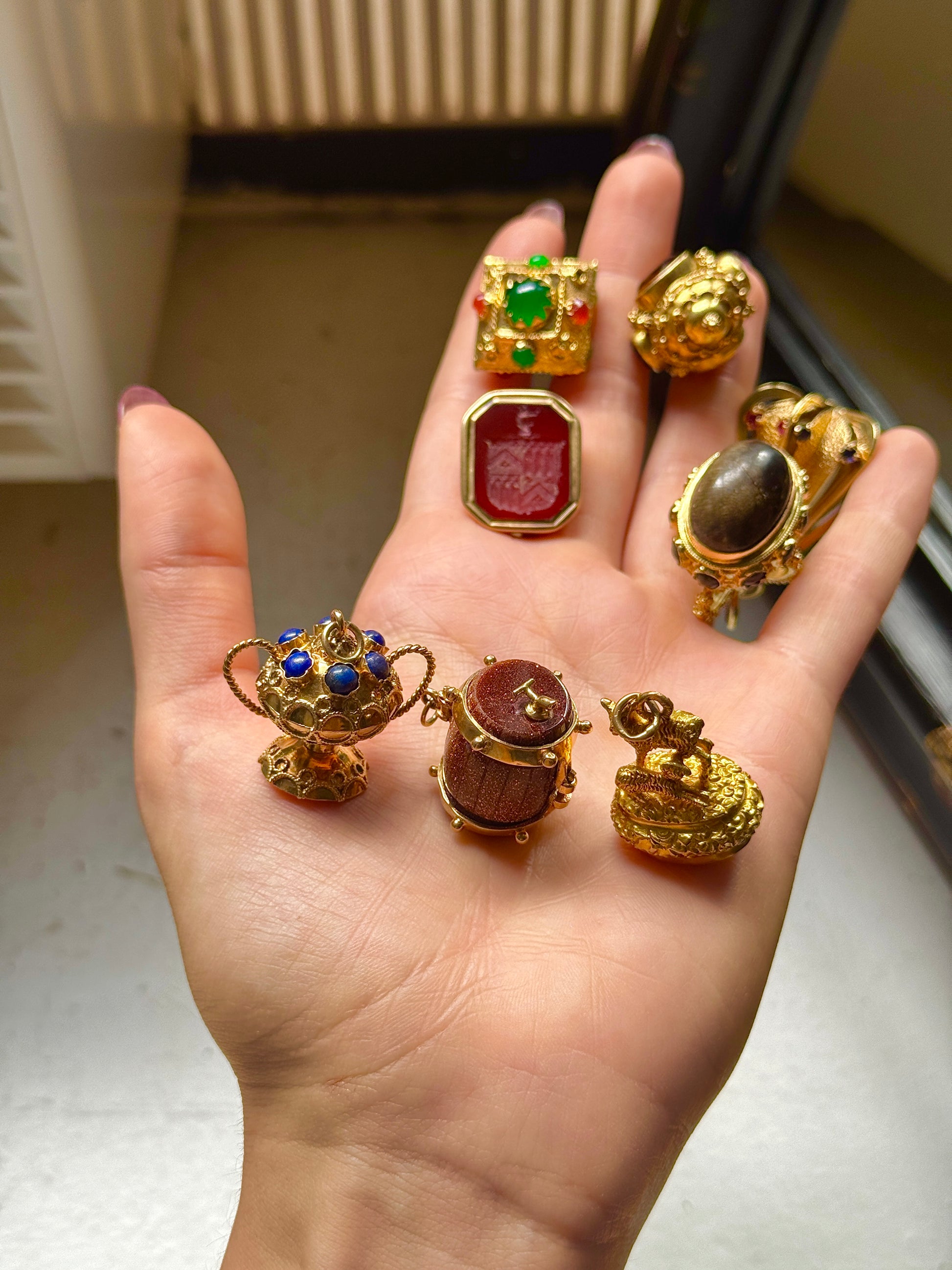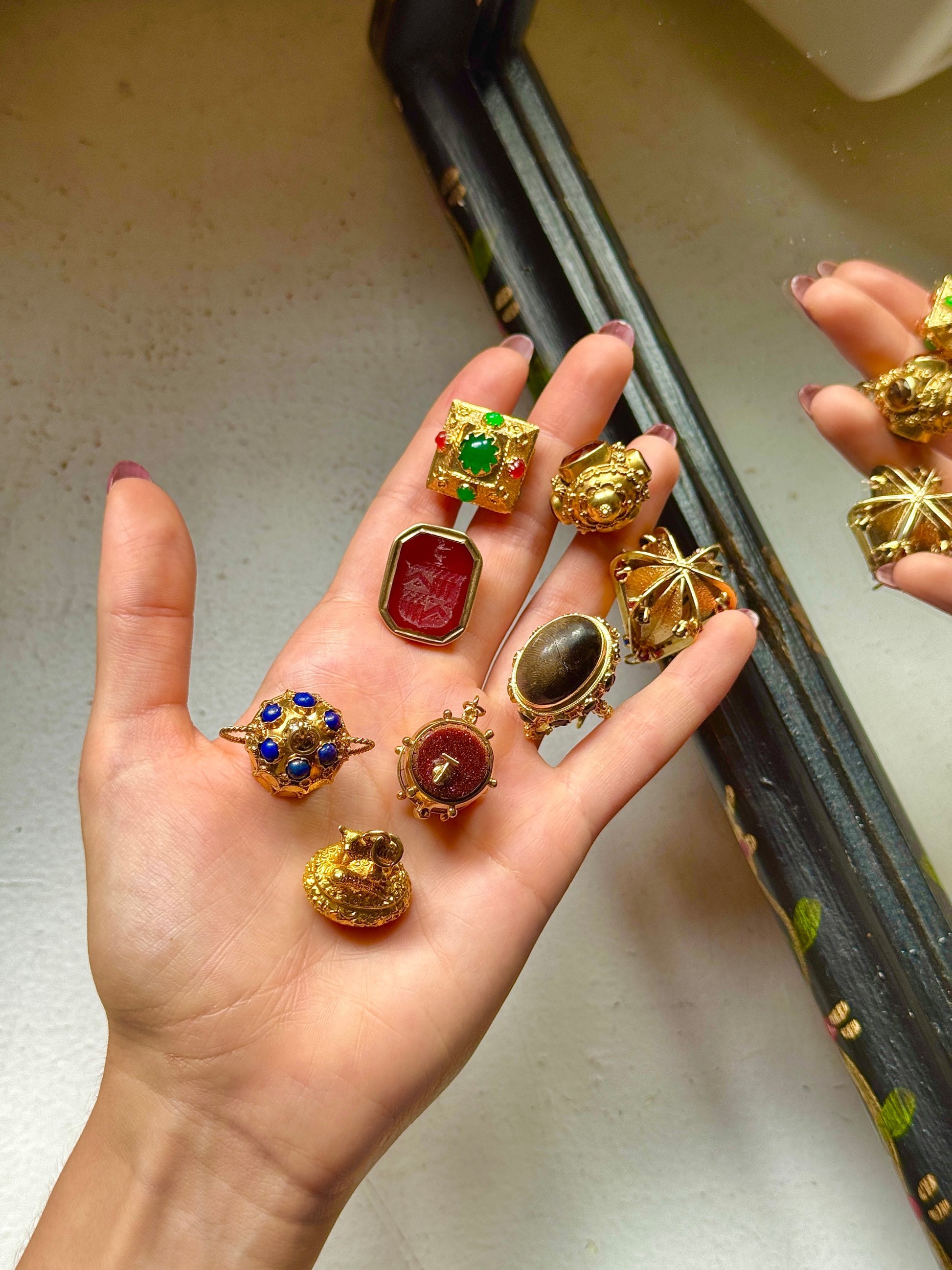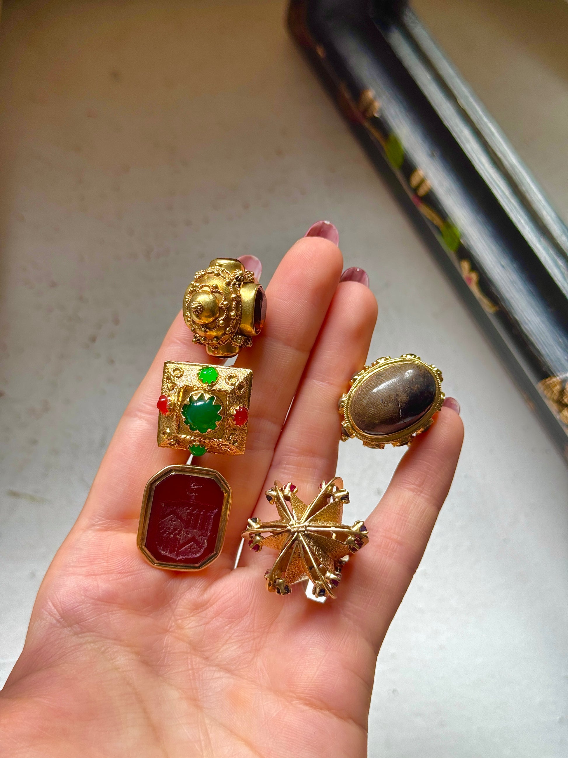 - Stones: carved carnelian with crest, stamp-able with wax as intended!
