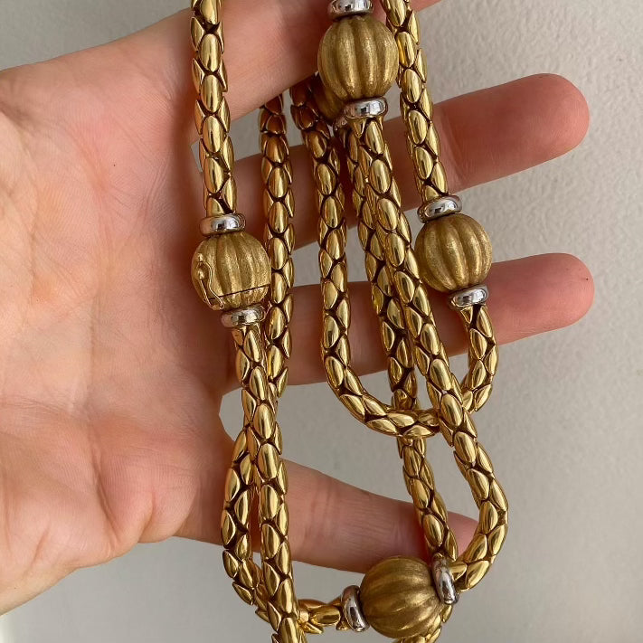 DESCRIPTION FROM ELISA: This EPIC 18K CHAIN will be very hard to part with. Richly toned, textured beads, slinky chain...and THE CLASP!!!
