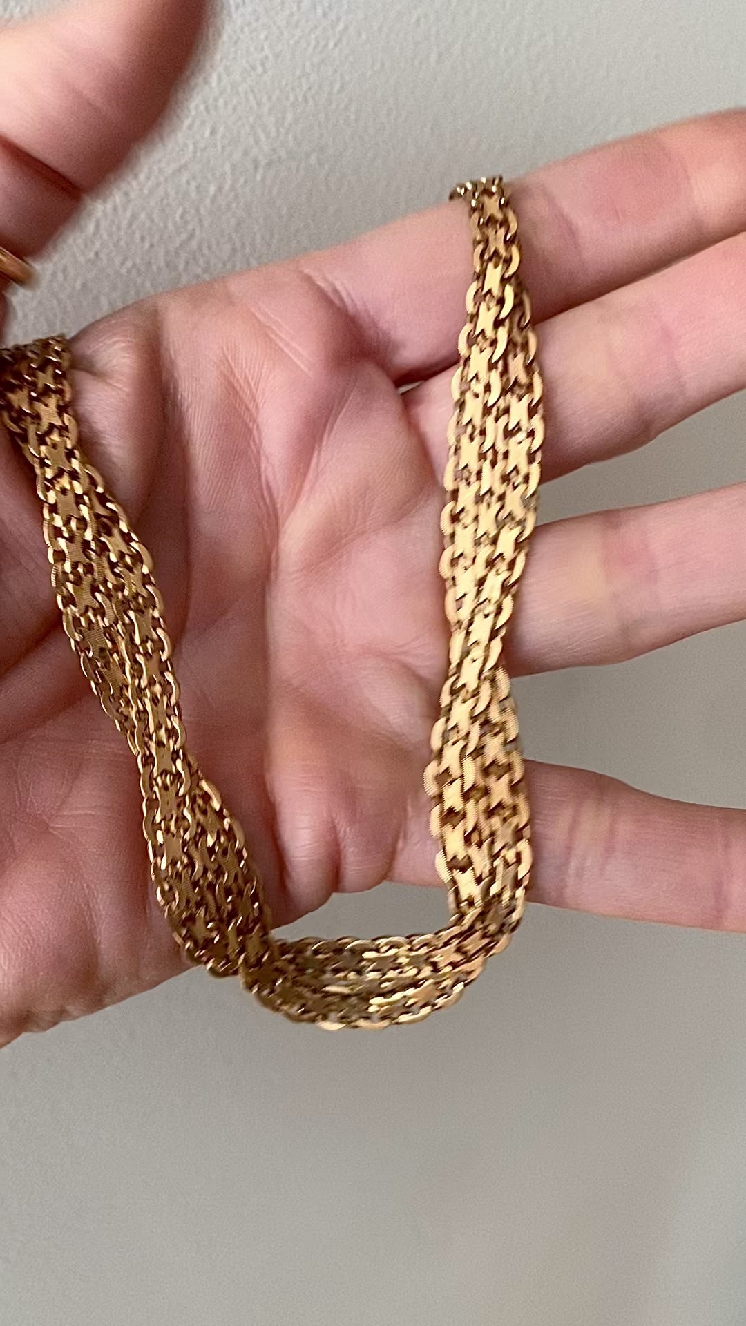 DESCRIPTION FROM ELISA: French babe time! This features two flat, textured chains twisted together. It lies flat and beautifully on the neck and radiates a deep tone of gold! Secure tongue clasp and two safety latches.