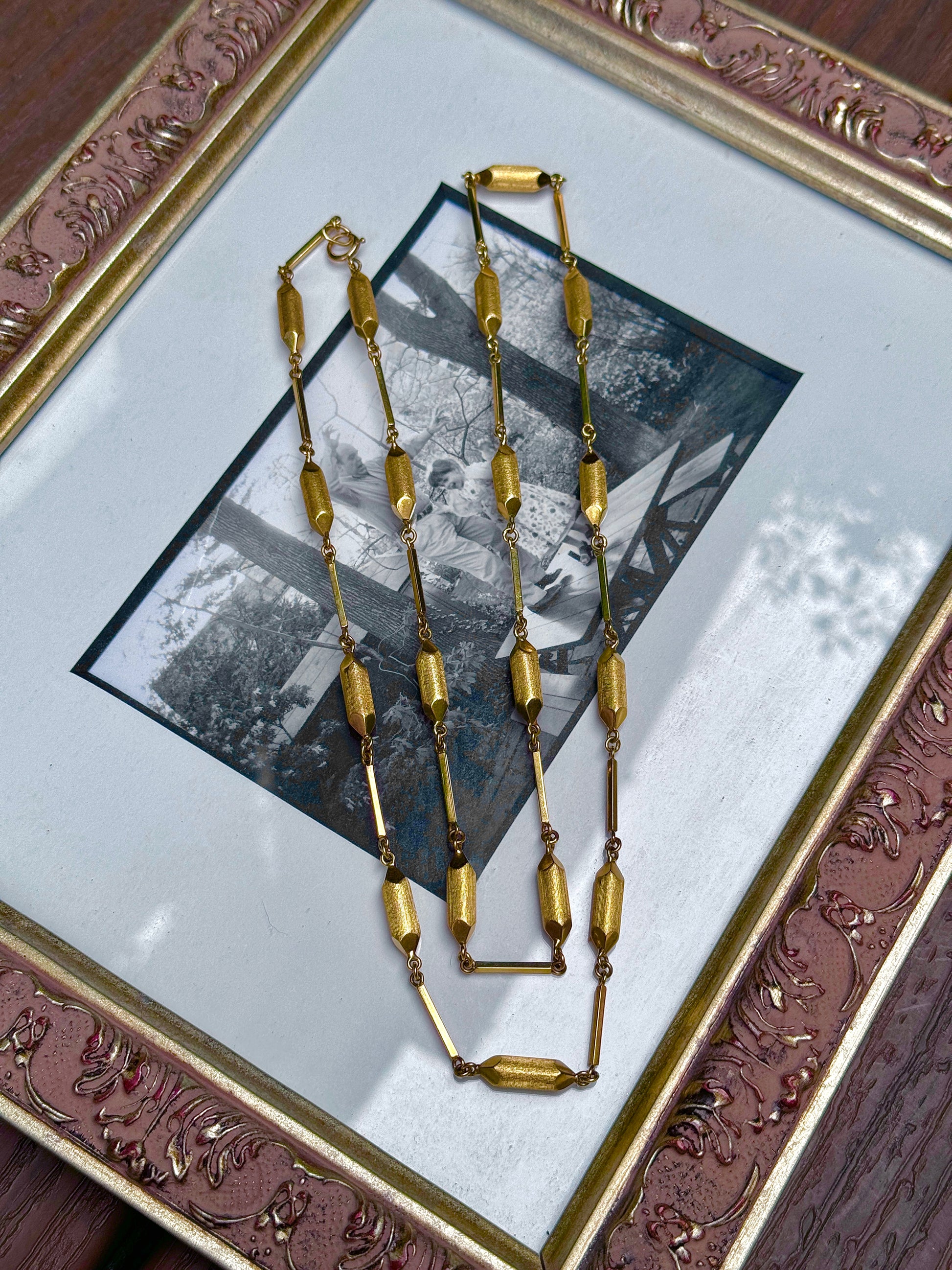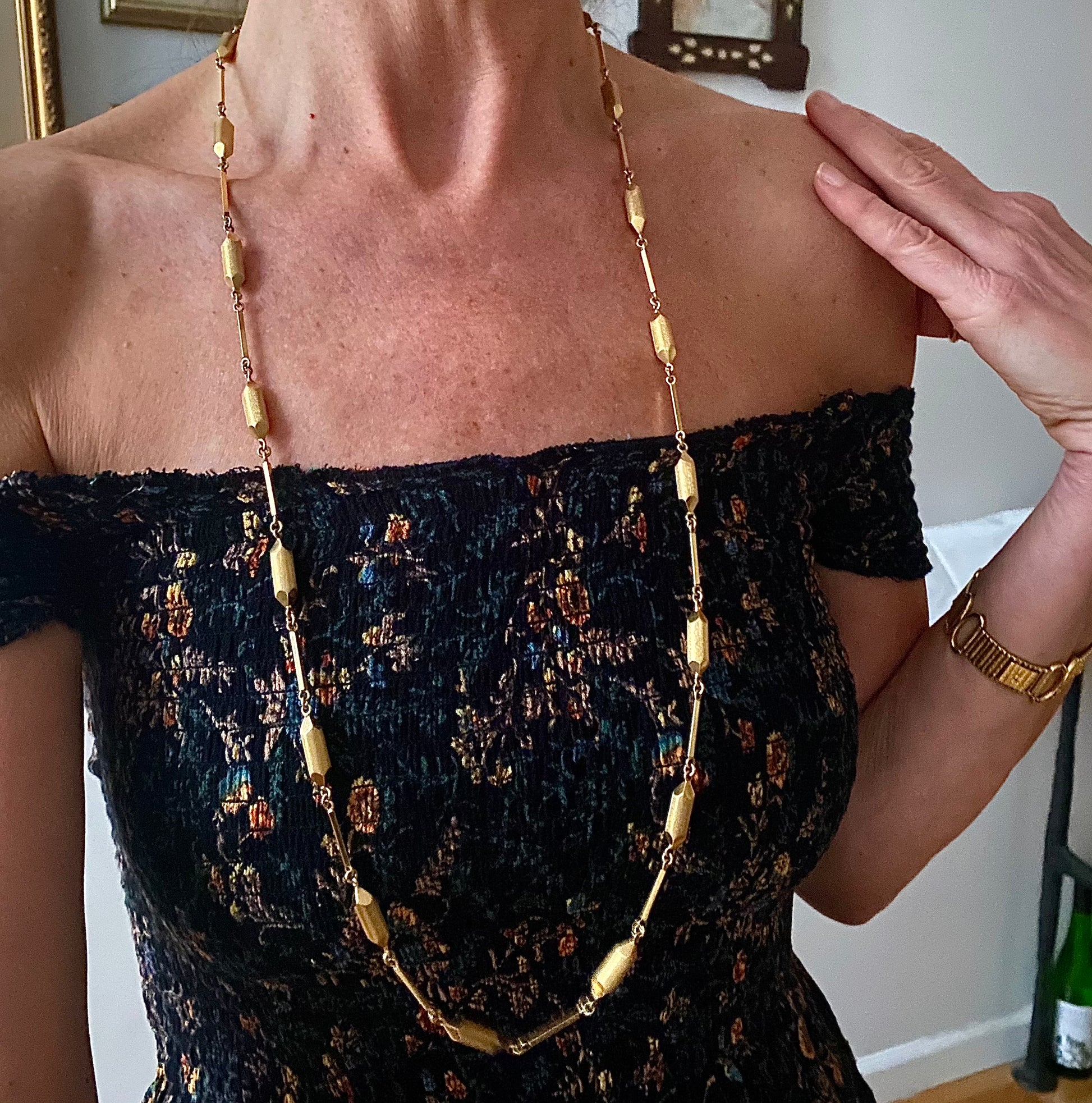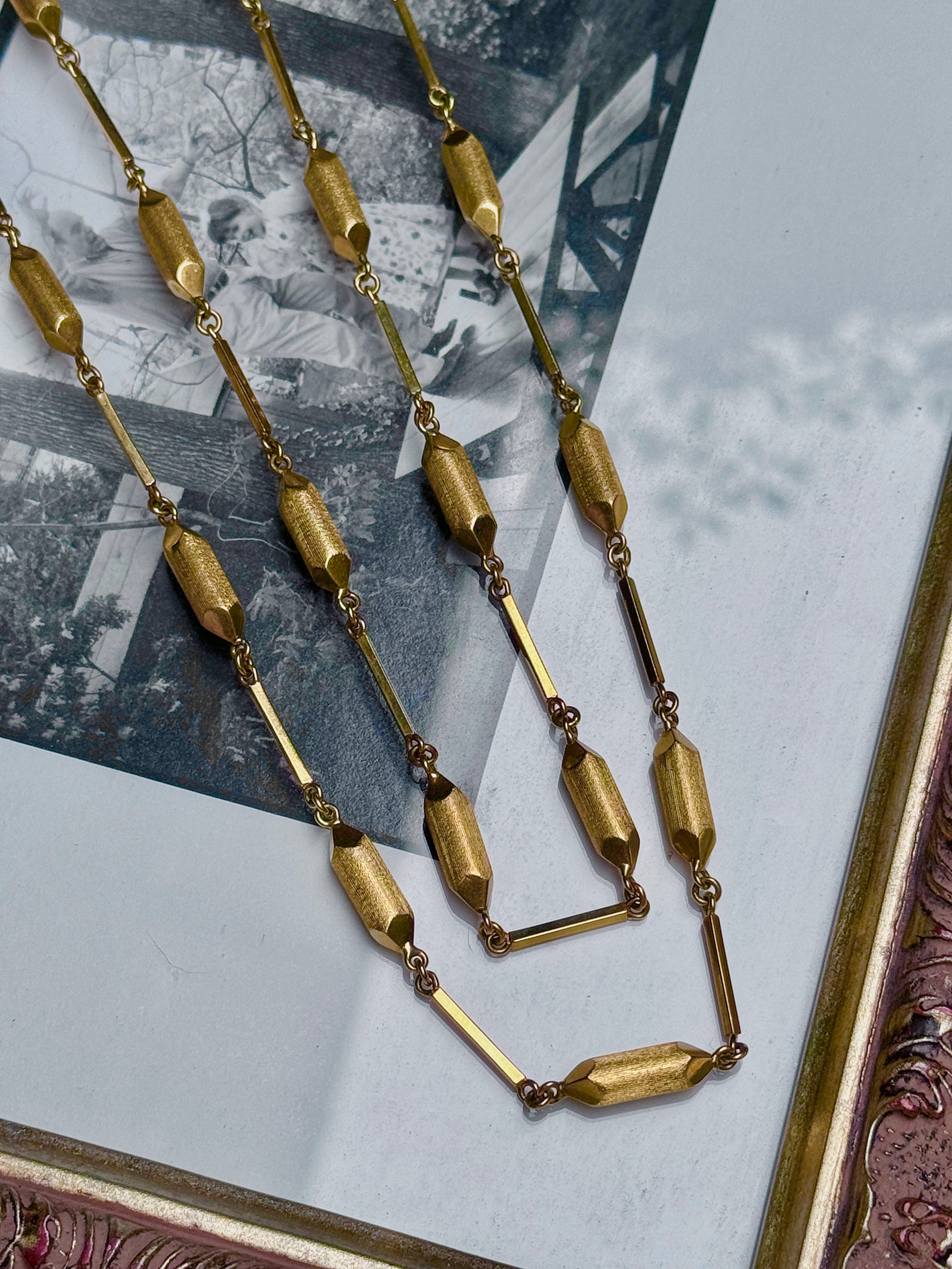 A super long 1960s chain with a very unusual link! Can be worn doubled as well.