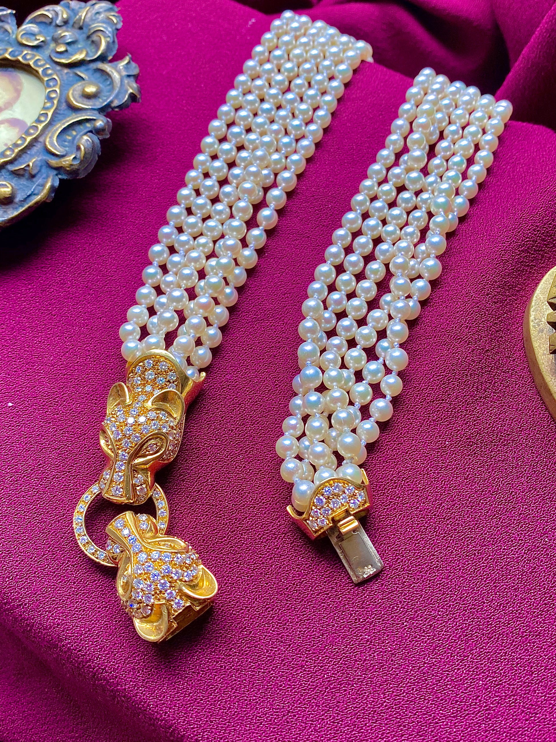 BRACE YOURSELVES! We’ve sourced this once-in-a-lifetime necklace, a true treasure waiting to be claimed... Six strands of XL pearls culminate to a 18k gold clasp, made up of two regal jaguars clenching down on a ring centerpiece (possibly inspired by a famous French designer?). The entire gold clap is completely encrusted in (large-size!) genuine and high quality diamonds. Who the hell do you think this originally belonged to? It had to be one ELEGANT lady… or maybe borrowed by celebrities for red carpet events.