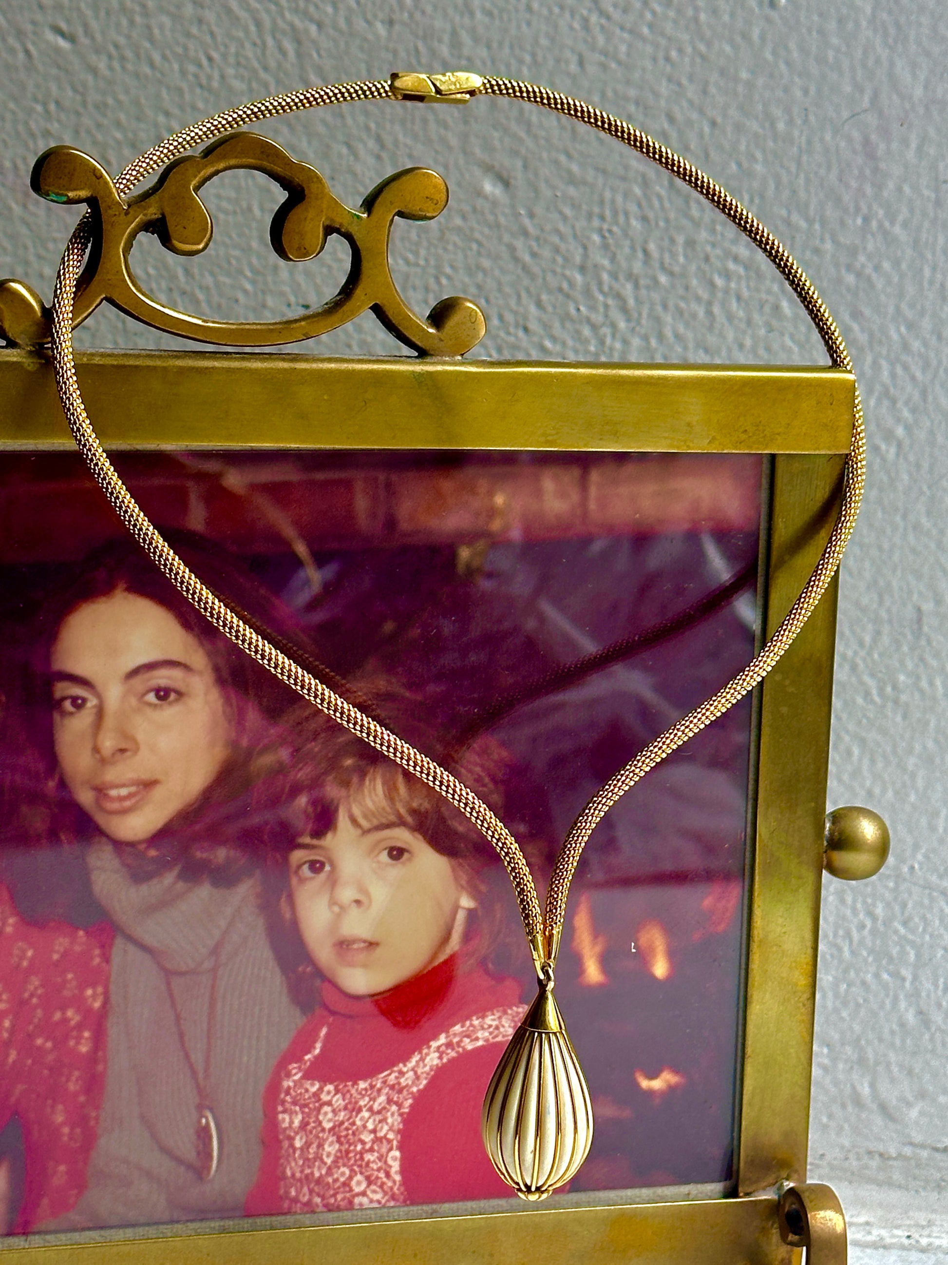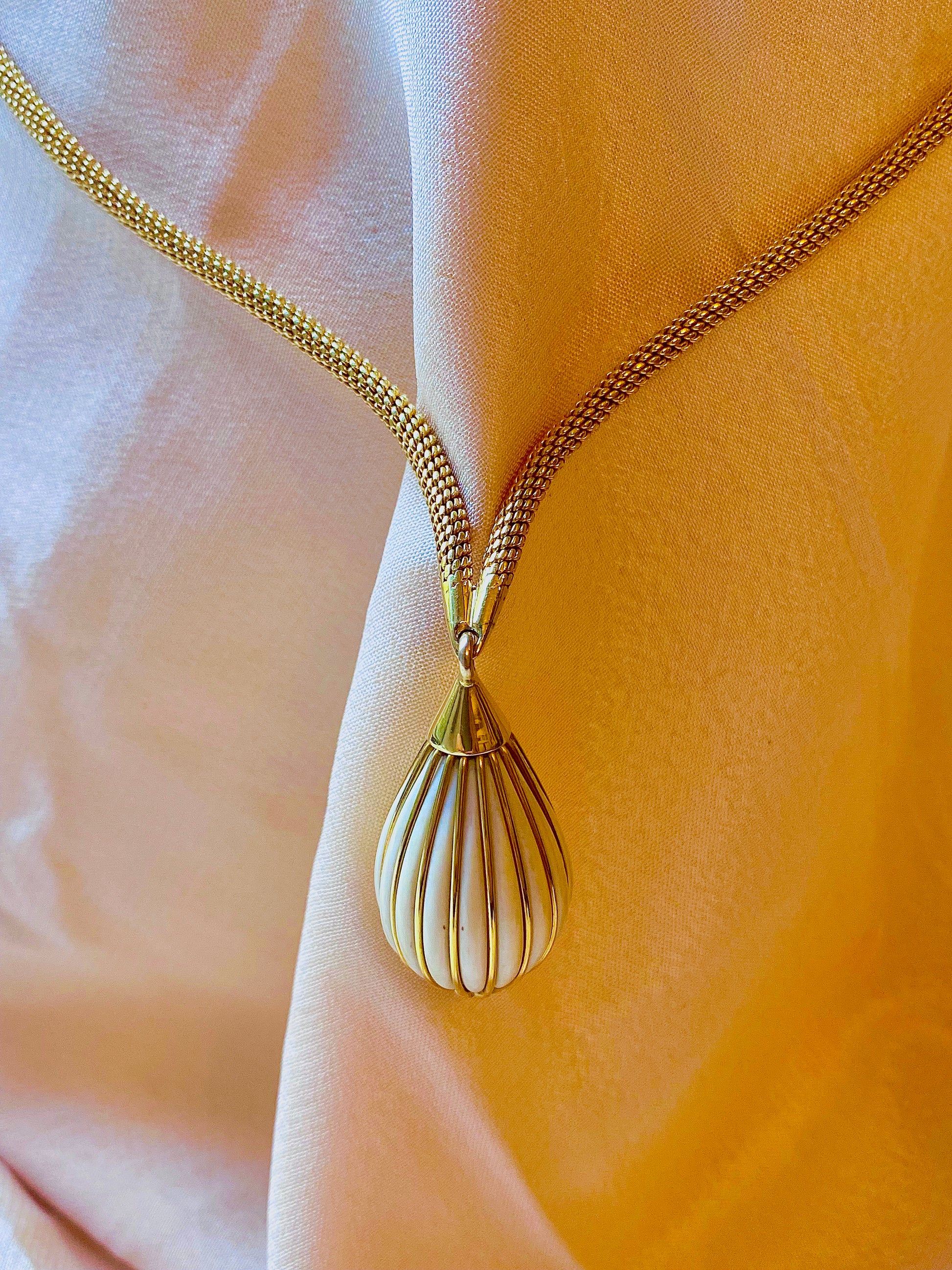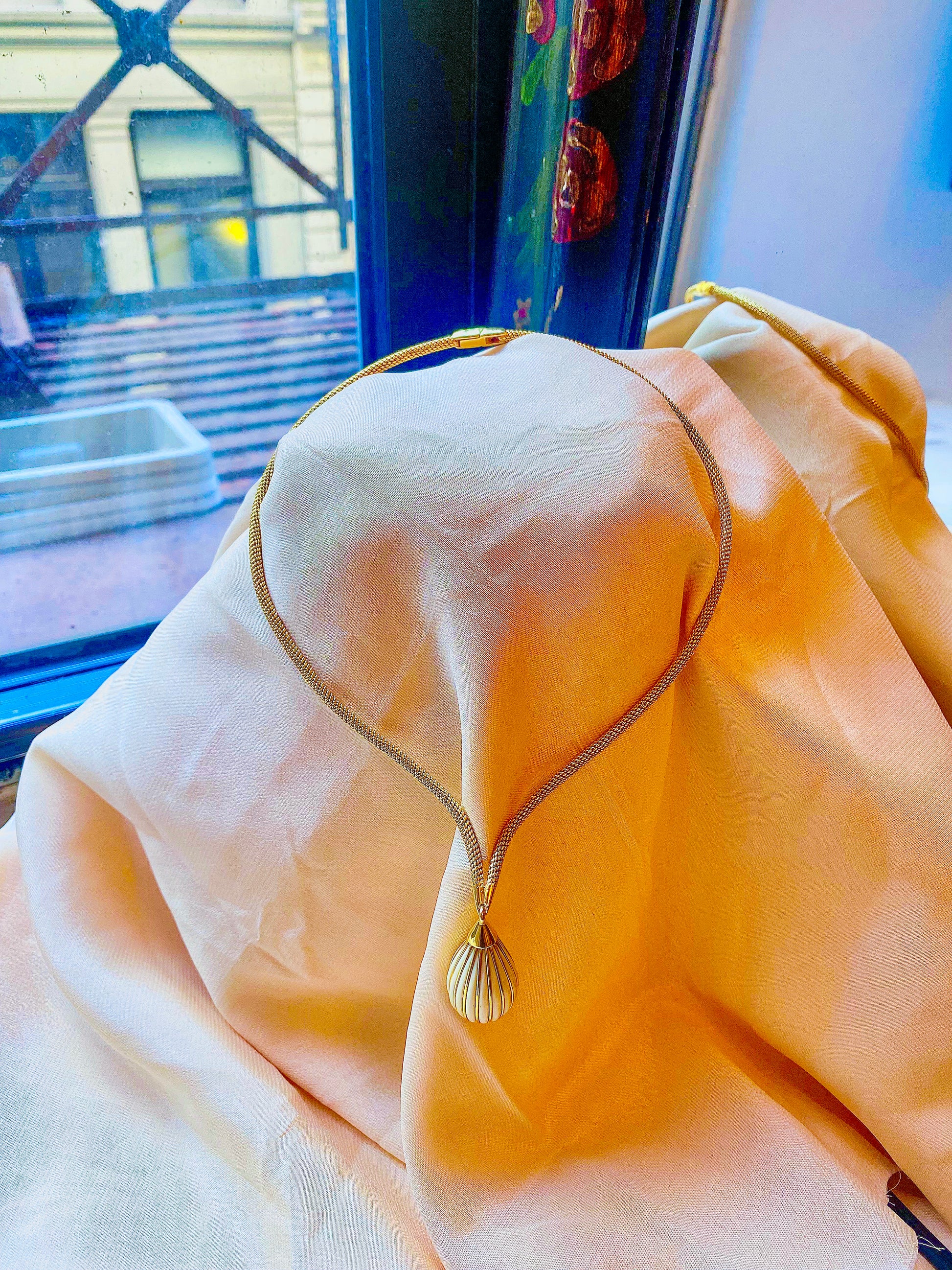 🤫 Two things you guys will love: French, and UNUSUAL. Make a statement with this unique structured necklace, made of a snake-like mesh chain, coming to a strong point and dangling a gold & white enamel striped pendant. Very Parisian and very mod, this must have been the ultimate piece back in the day. Circa 1965 with a mercury head hallmark (3x) on the clasp.
