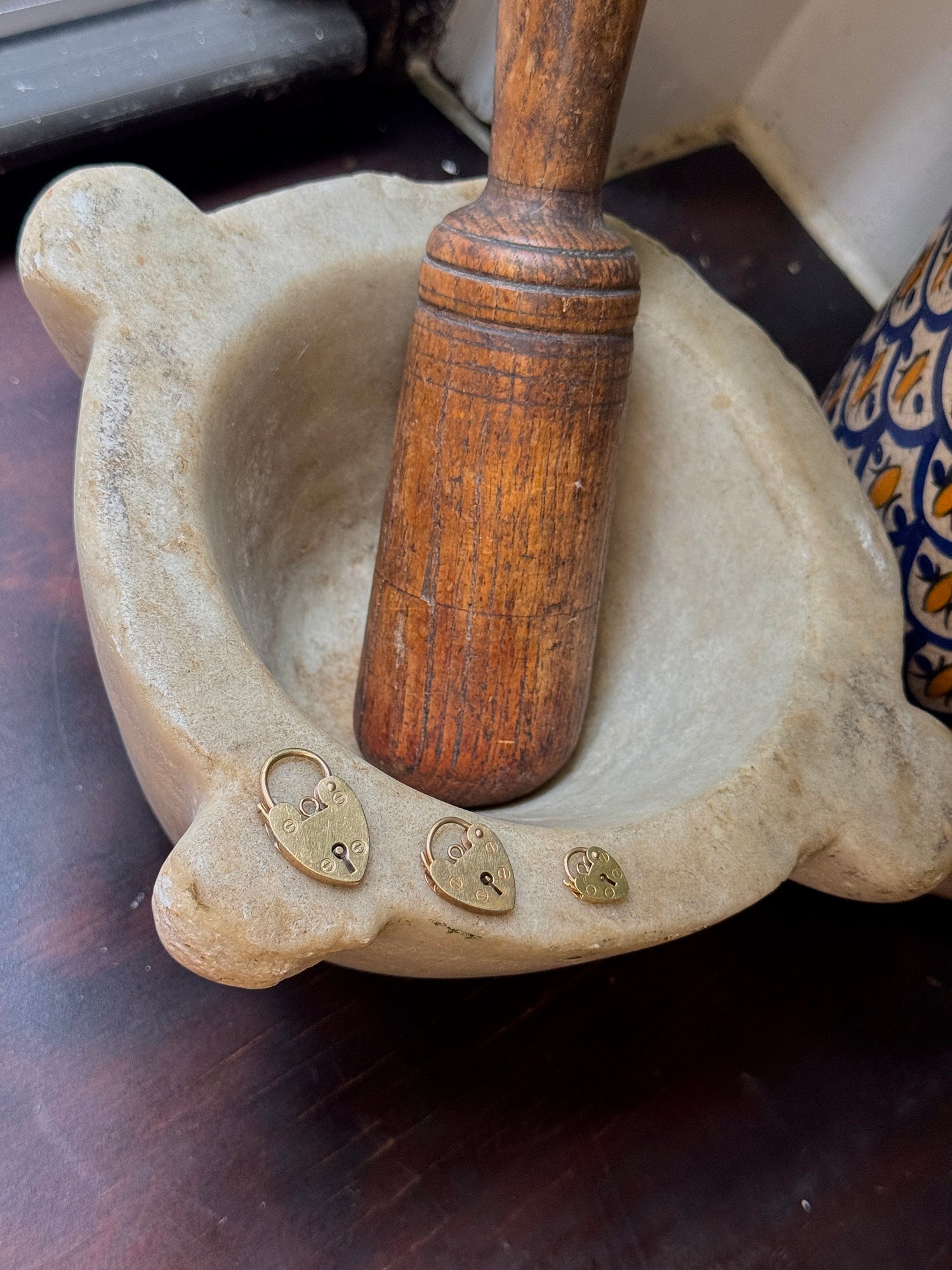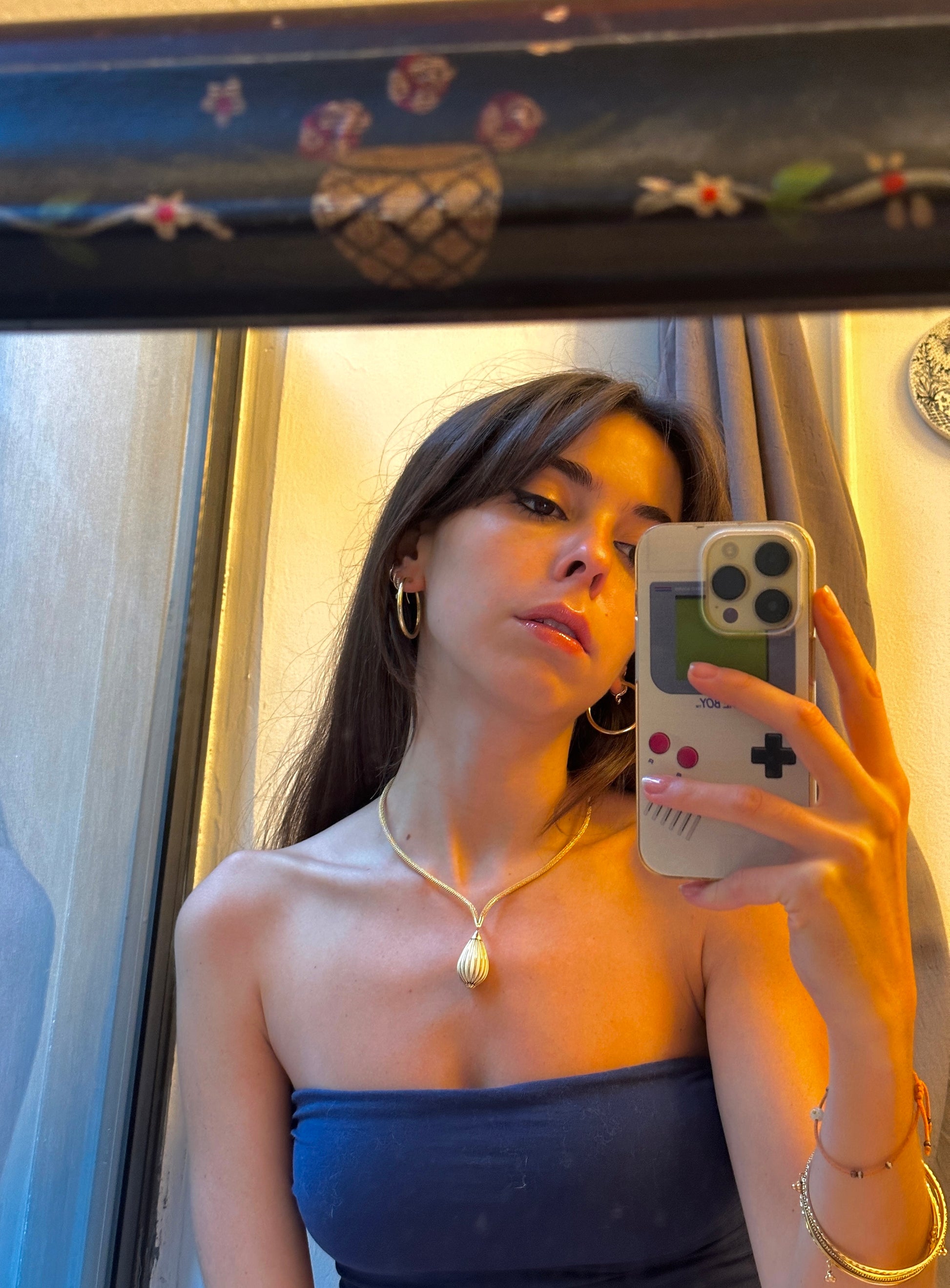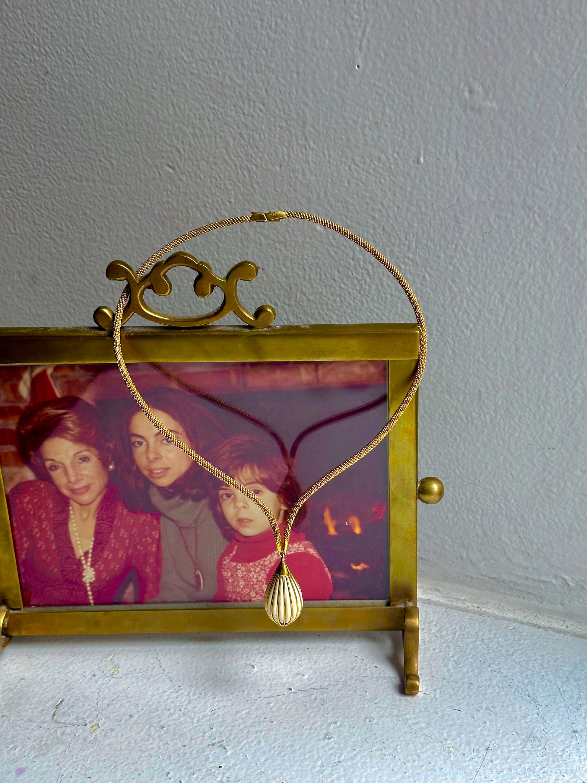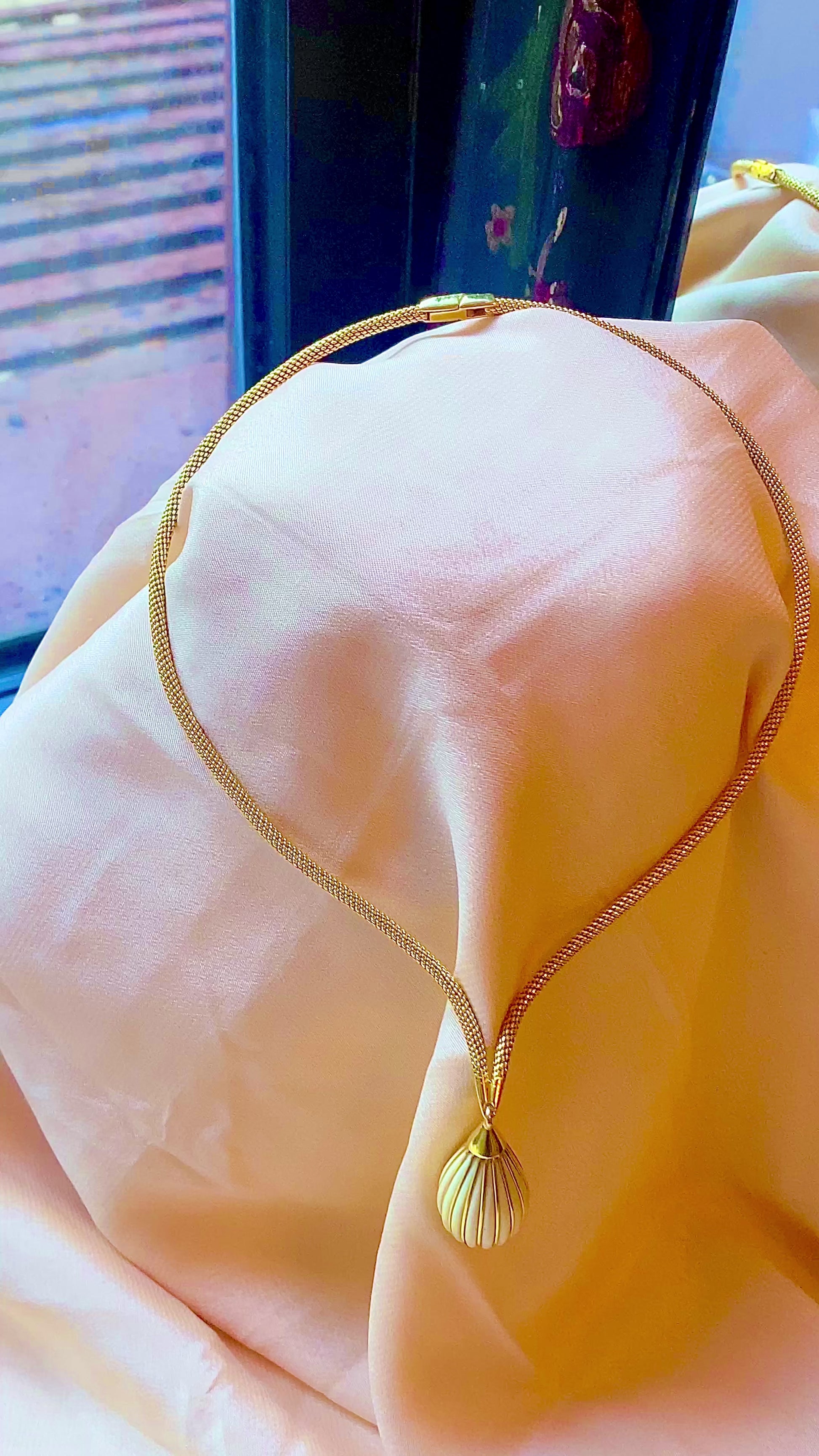 🤫 Two things you guys will love: French, and UNUSUAL. Make a statement with this unique structured necklace, made of a snake-like mesh chain, coming to a strong point and dangling a gold & white enamel striped pendant. Very Parisian and very mod, this must have been the ultimate piece back in the day. Circa 1965 with a mercury head hallmark (3x) on the clasp.