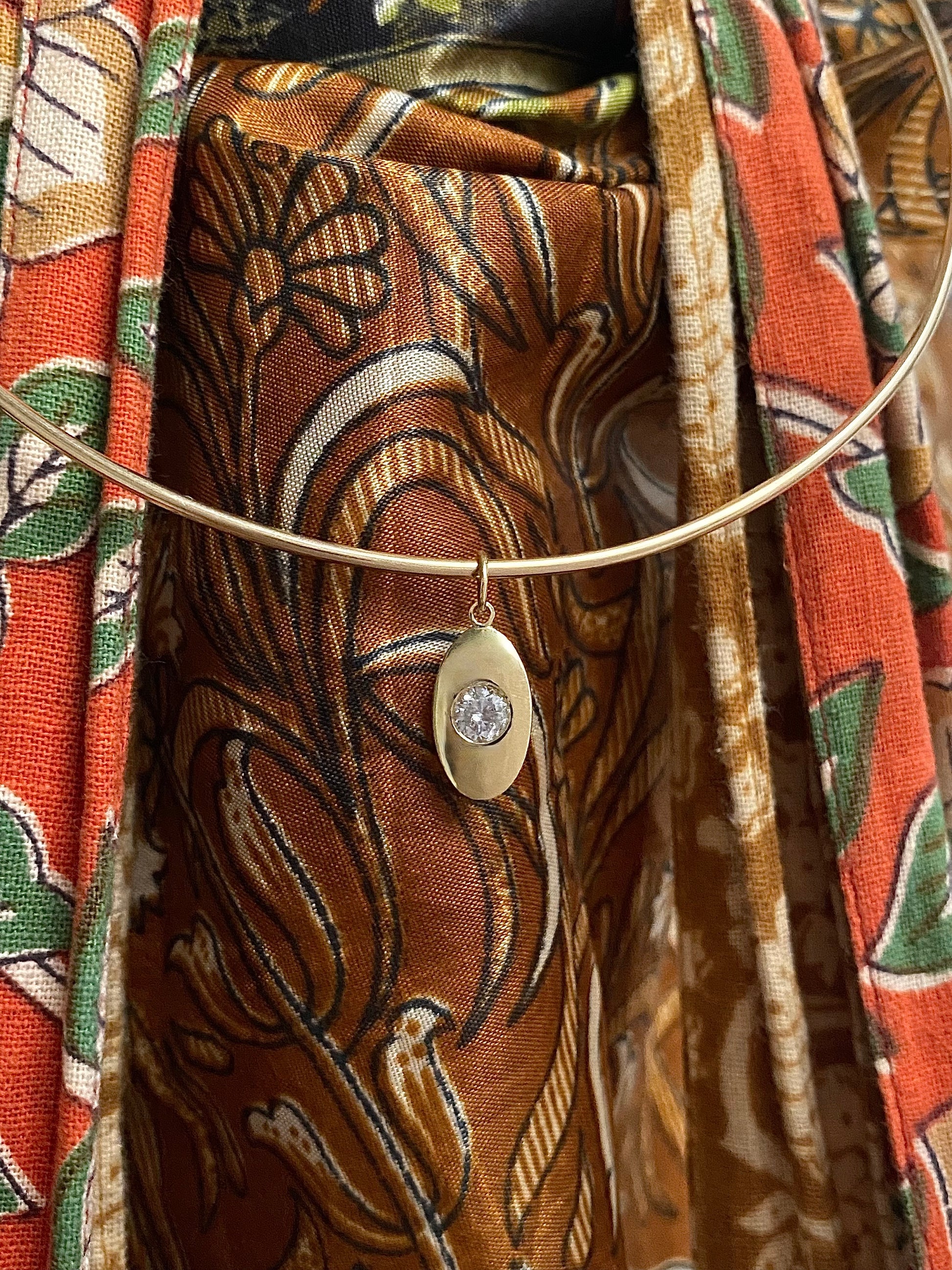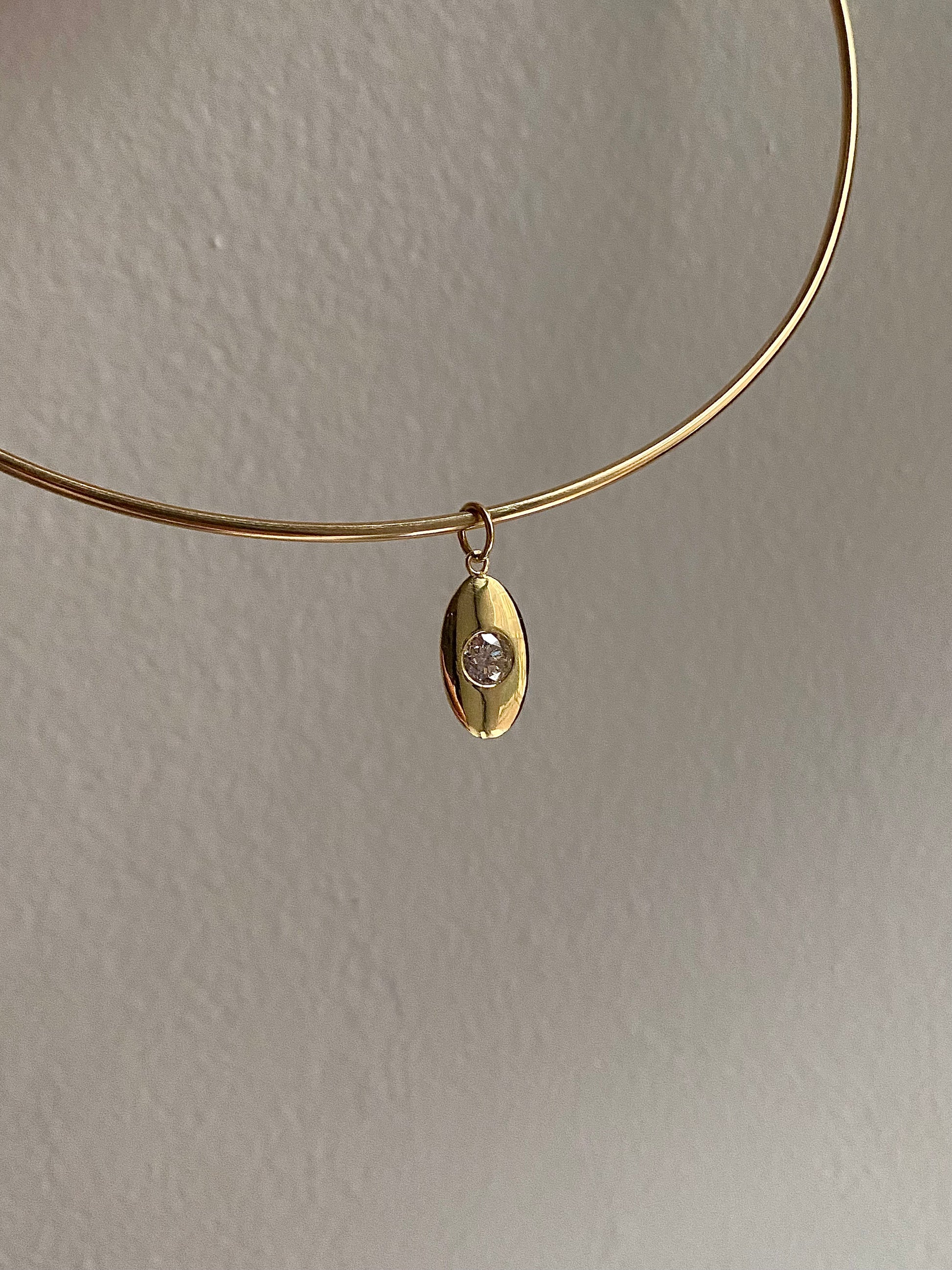 The diamond is exactly .50, set in buttery 18k (or option now for 14k). It's solid and has a nice weight of 2.3 grams and it measures 22mm including the bale. It's grand and sparkly and command presence when worn on its own, like Ruby likes to do, but it also stands out in a neck mess, the way I wear it. I love the versatility of this piece so hard! We are making these to order (ships in 10 days) but we do have limited amounts, so if you'd like to purchase one, please do so asap!