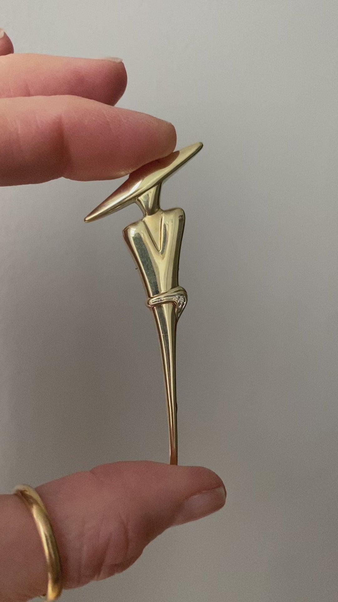 DESCRIPTION FROM ELISA: What do we all think of this skinny b&%$@#? I love her 70s vibe! She was a brooch, but I added a link in the back so she can be worn on a chain. And her belt has a tiny diamond! Chain not included.