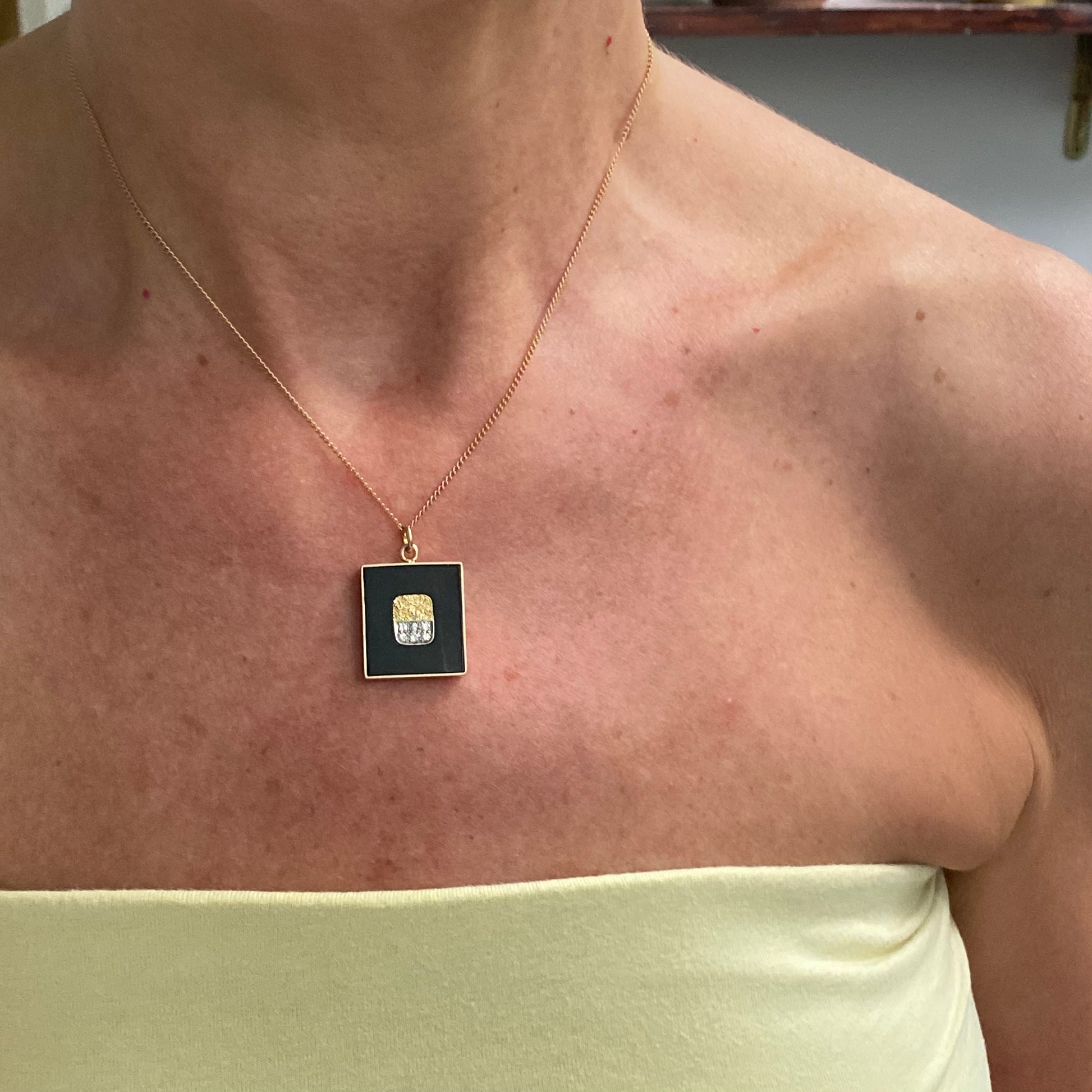 DESCRIPTION FROM ELISA: A spectacular onyx and diamond pendant with a favorite theme: "70s does 20s." There was a big retro-deco movement in the 70s and my daughter and I LOVE IT ALL! Chain not included.