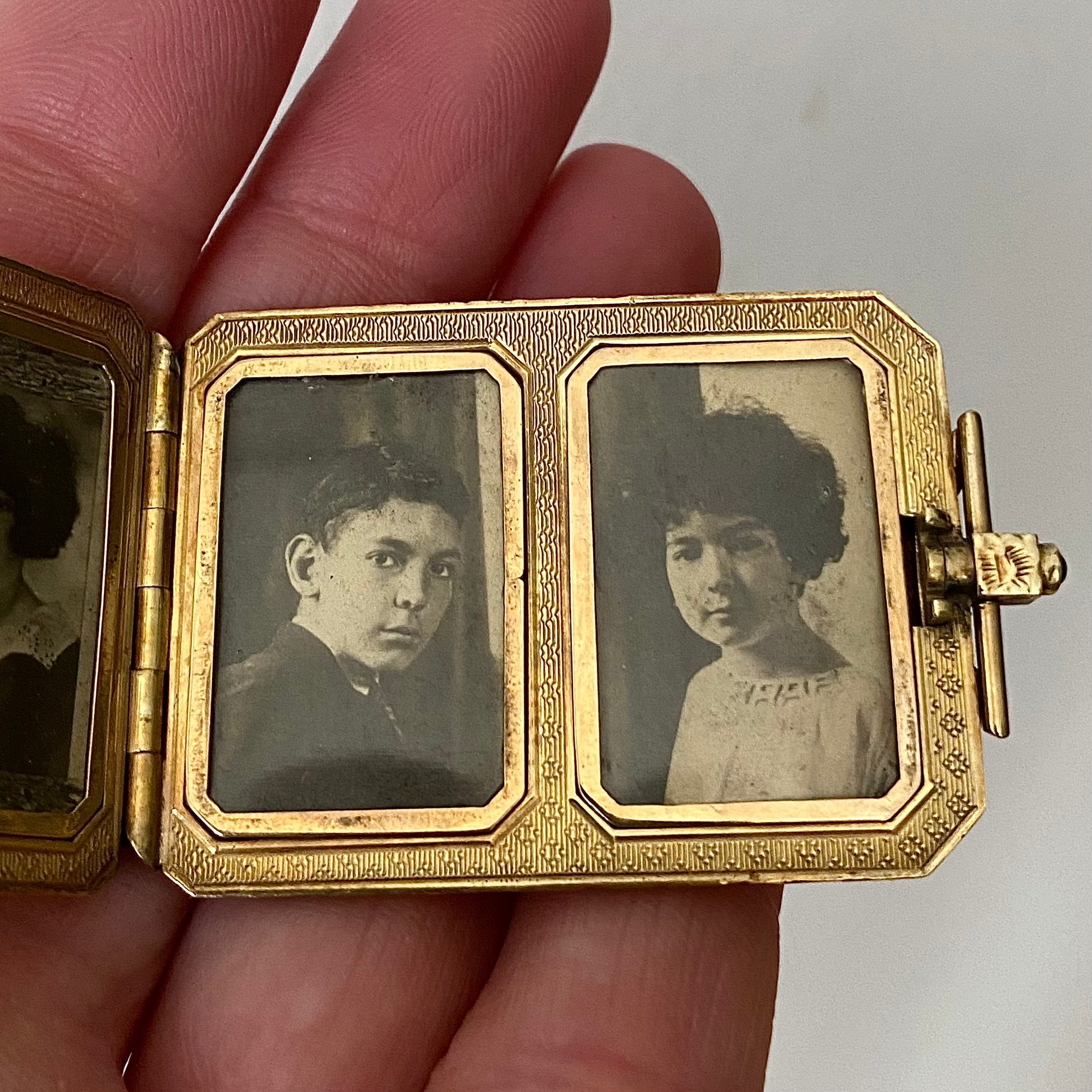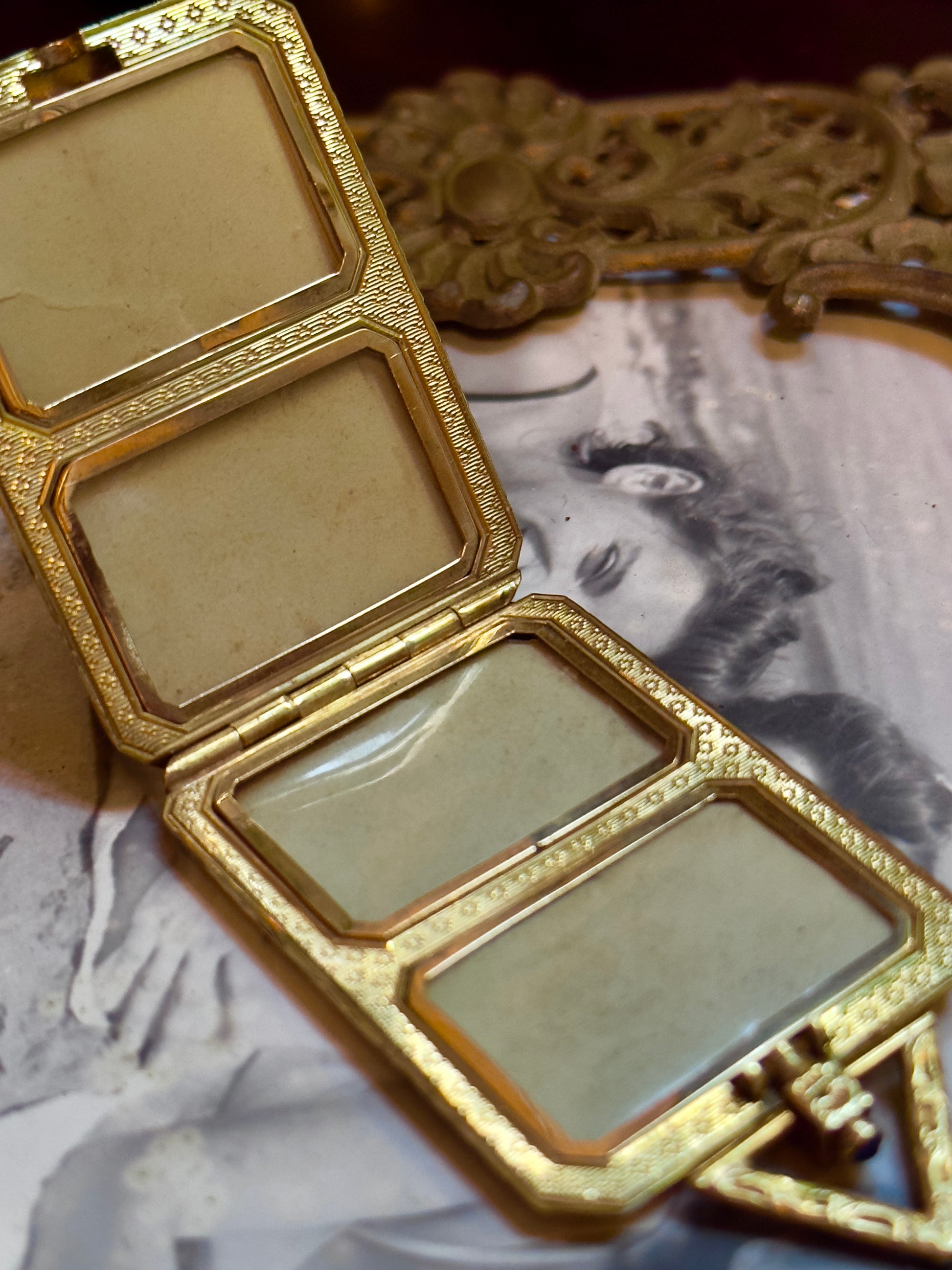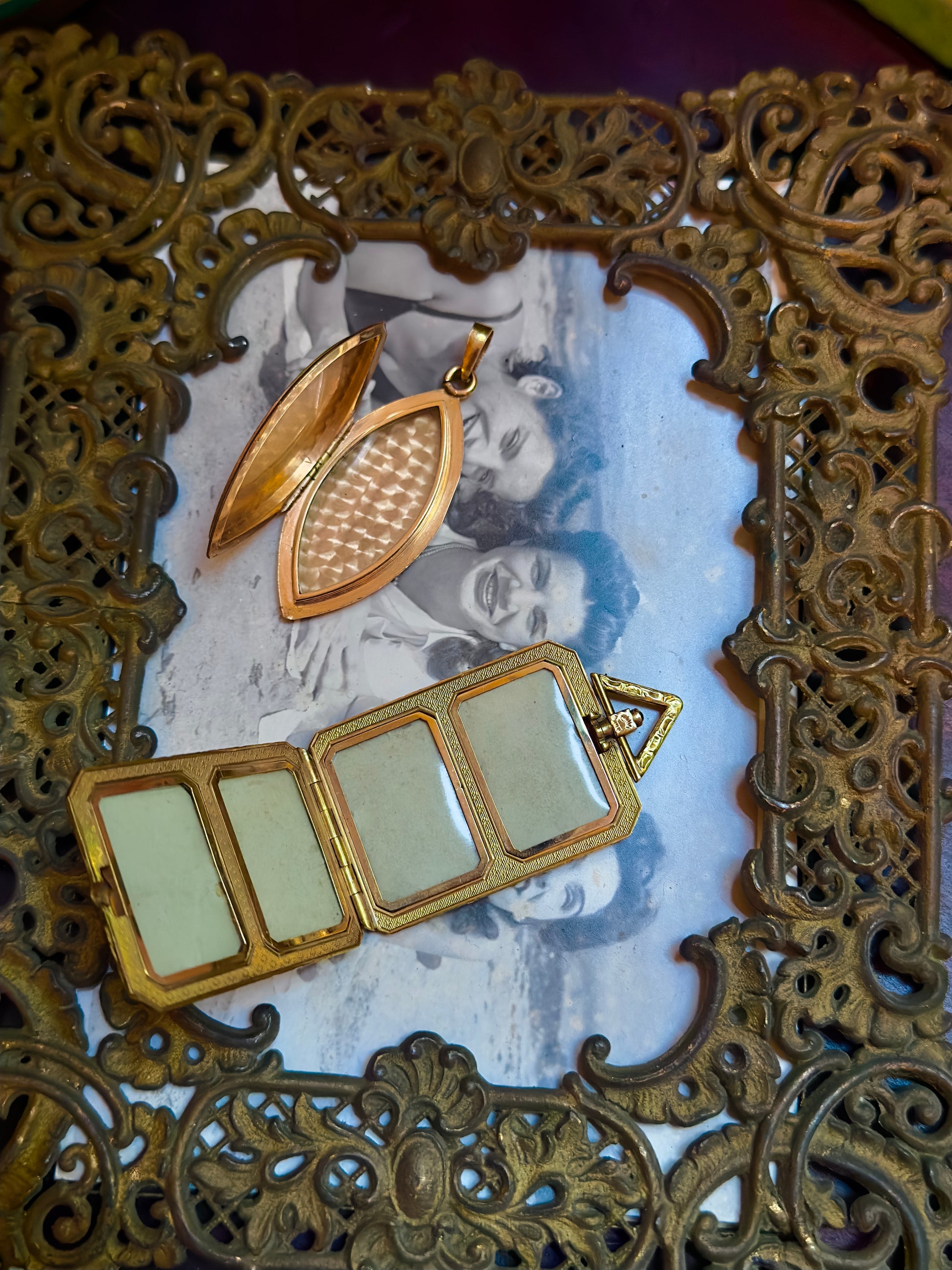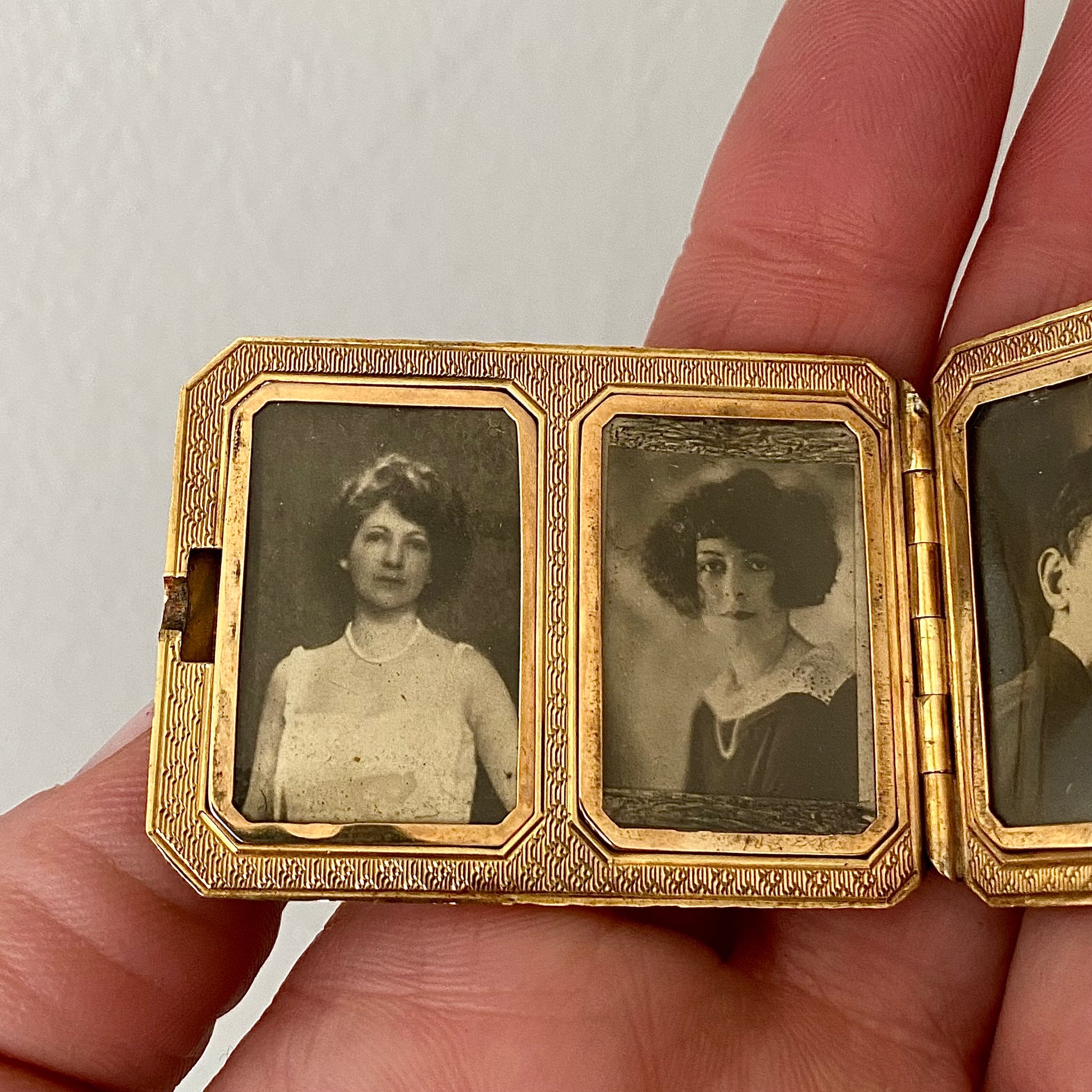 A rare, large Art Deco locket with its original 1920s photos. I'm gutted that somebody scrapped this amazing time capsule, but honored that I was able to rescue it. Initialed ADL. Would look super on a long chain. A couple of discolored areas would probably polish out, I like the original patina.