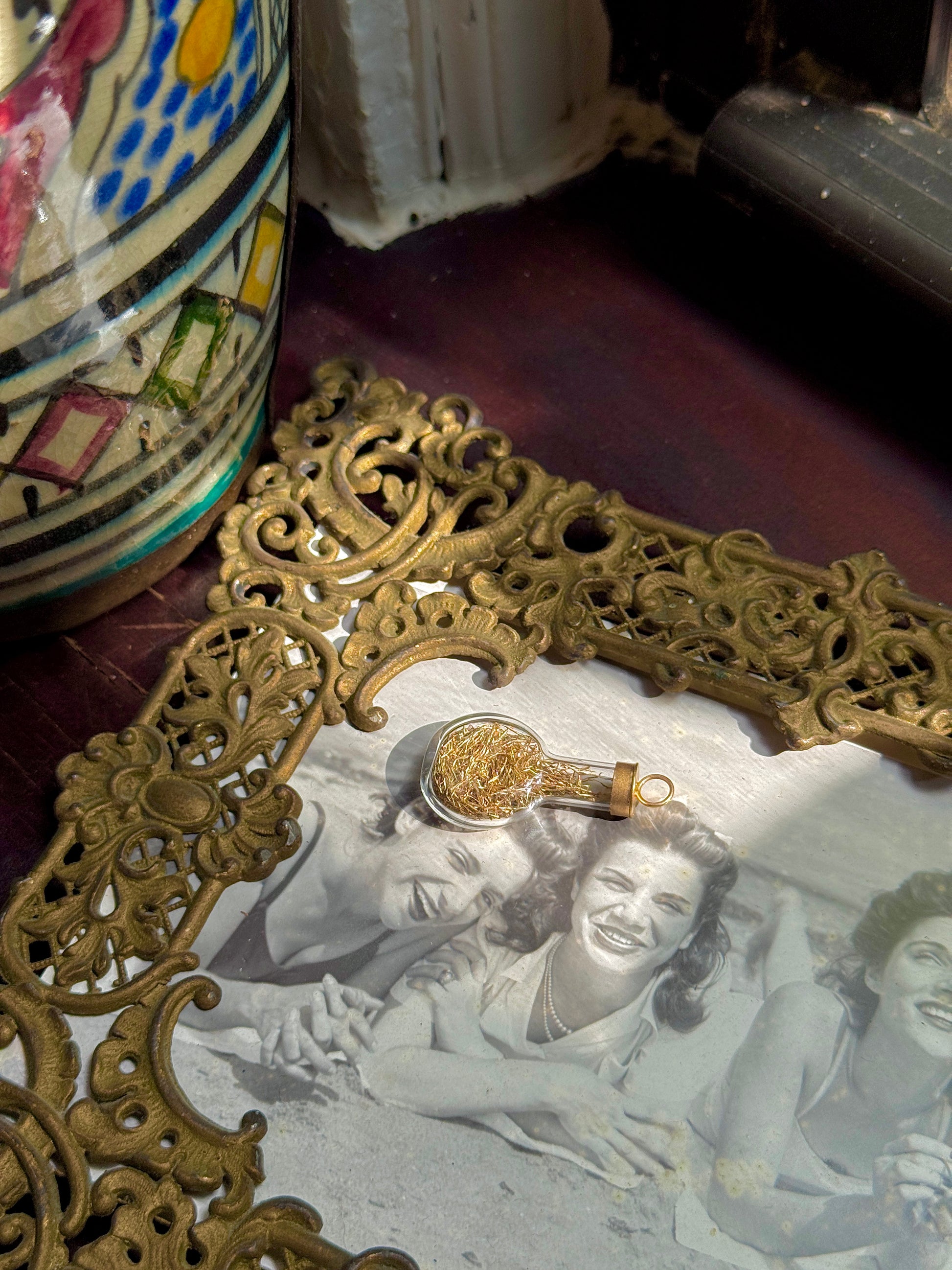 🤫 We like offering more affordable pieces… and this one is simply financially responsible. You’re keeping your gold exactly where you can see it!!! It's a bottle pendant full of real gold flecks. This silhouette was super popular throughout the 1970s. 35mm, 3.4 grams, 14k, $495