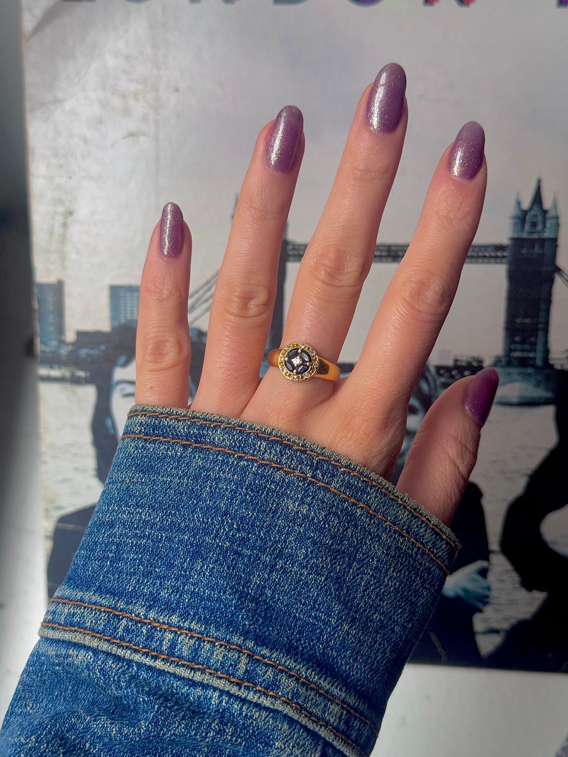 Top left: French ring with diamonds and sapphires, almost looks like a stain glass window (perhaps Notre Dame?)... size 7.5 (sizeable), 3.5 grams, 18k, $895