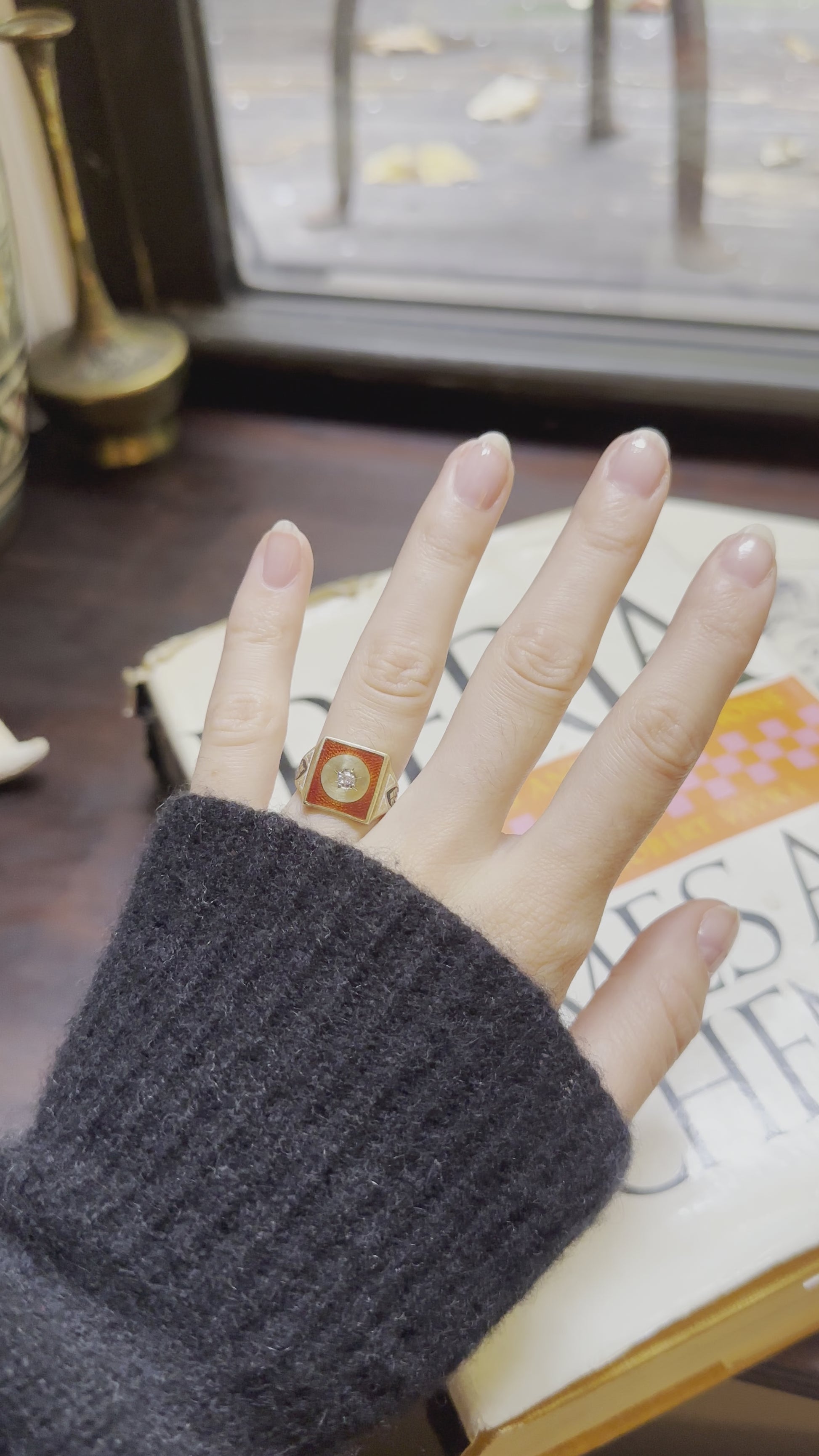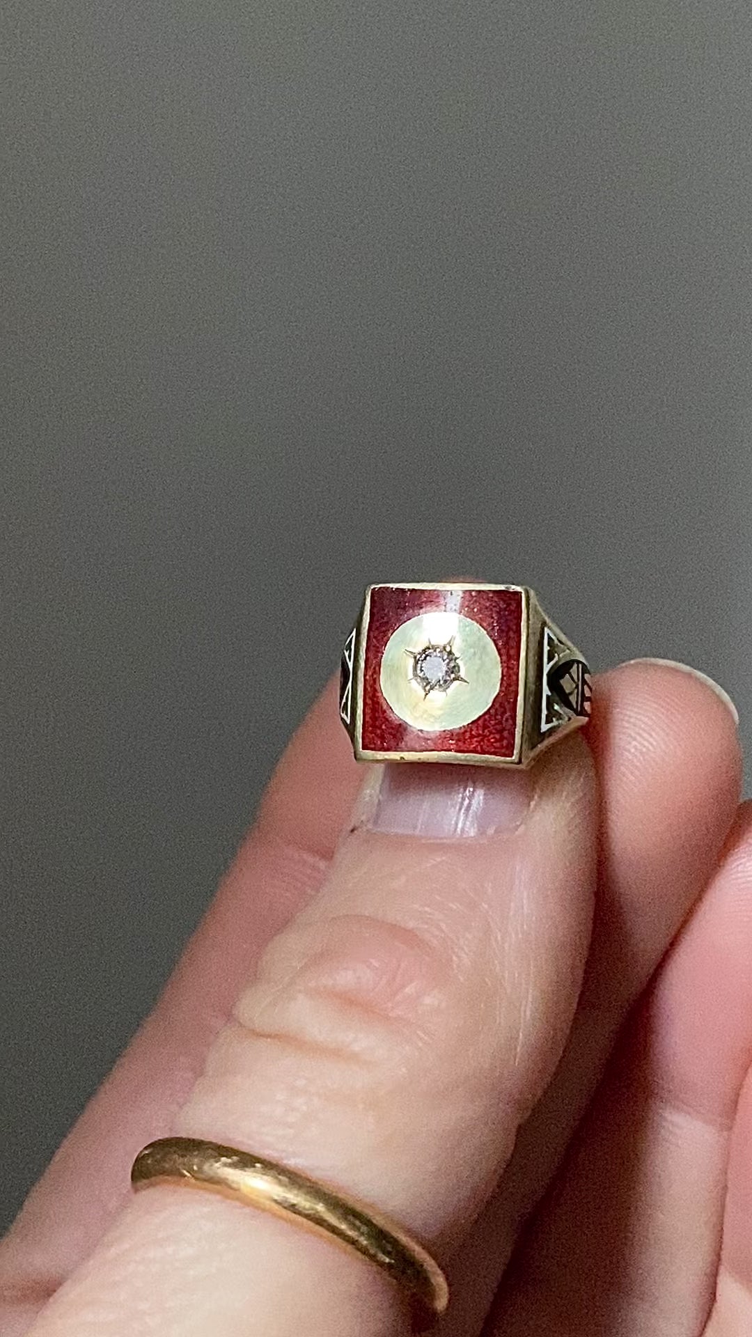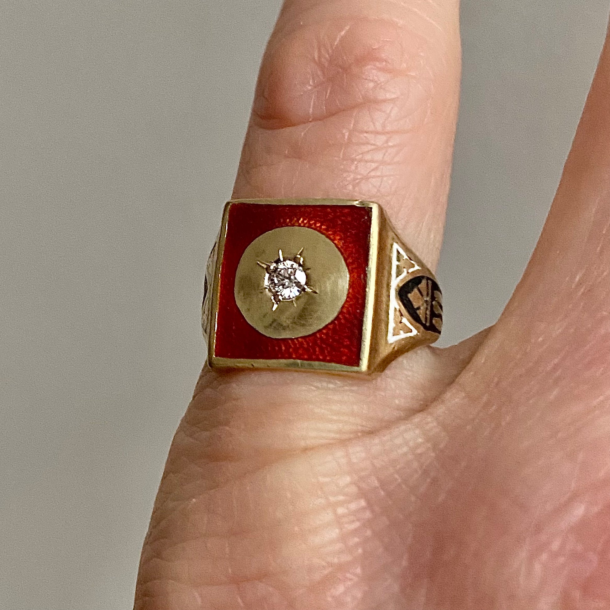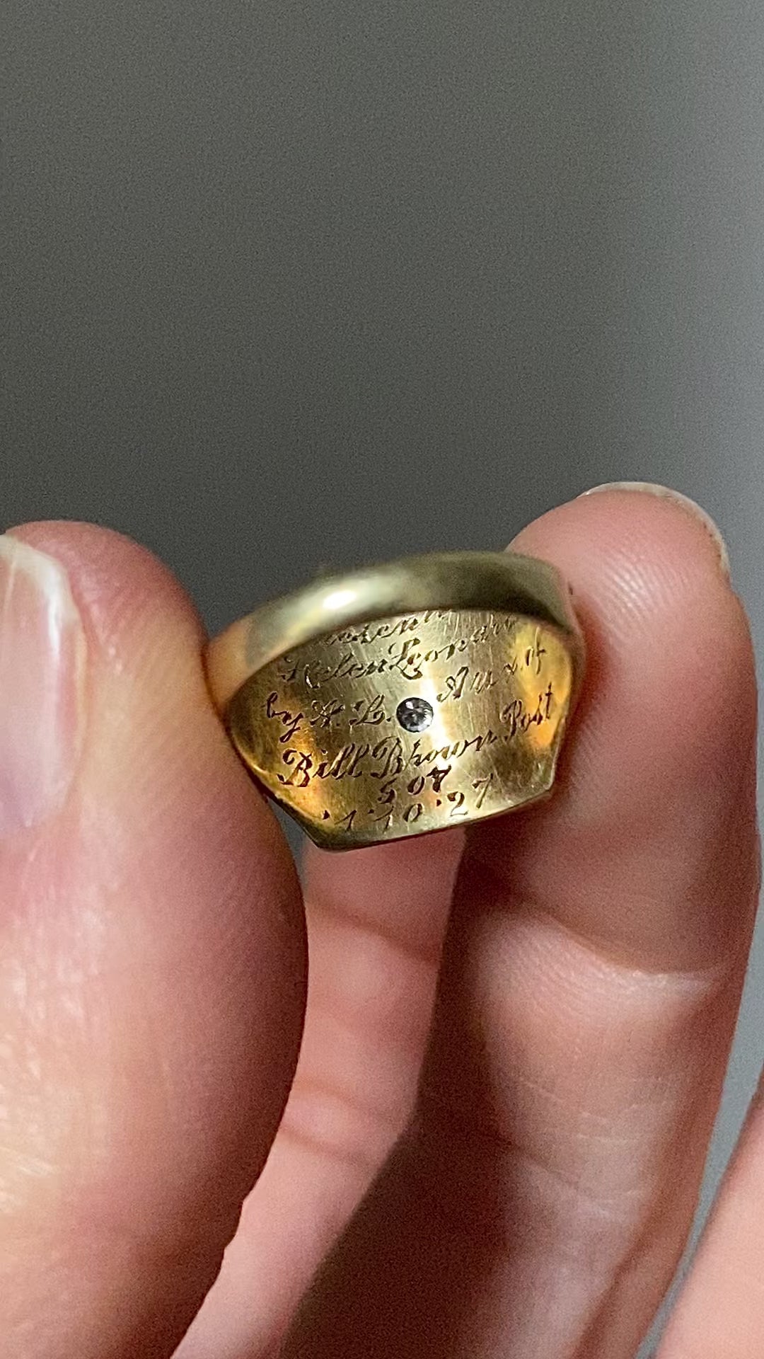 DESCRIPTION FROM ELISA: This enamel ring from 1927 was a complete mystery. The inscription on the awesome ring butt reads, "Presented to Helen Leonard by AL Aux of Bill Brown Post 507 1-10-27" (swipe.) Thanks to Google, I was able to determine that Bill was in the American Legion (unit 507) and Helen was president of the auxiliary. I had the diamond set...the ring may have had a shield or something else at one time.