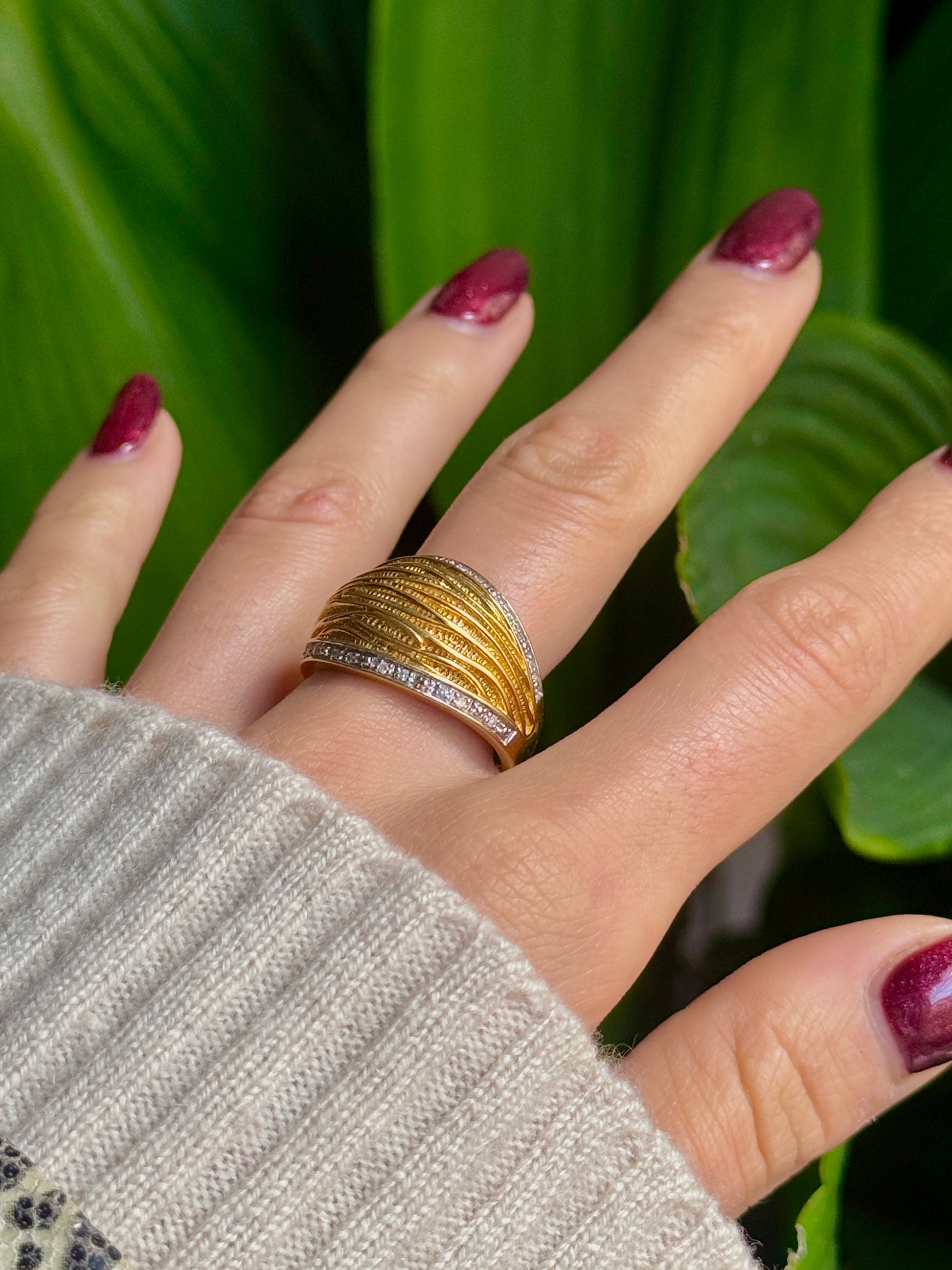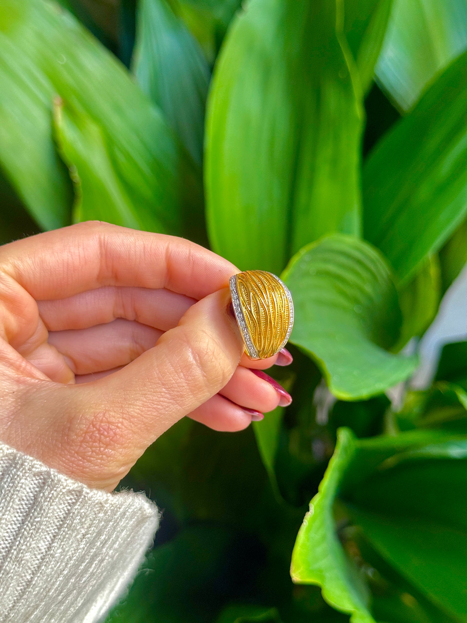 A fab bombé ring with a great texture and bordering line of diamonds on the top and bottom 💗