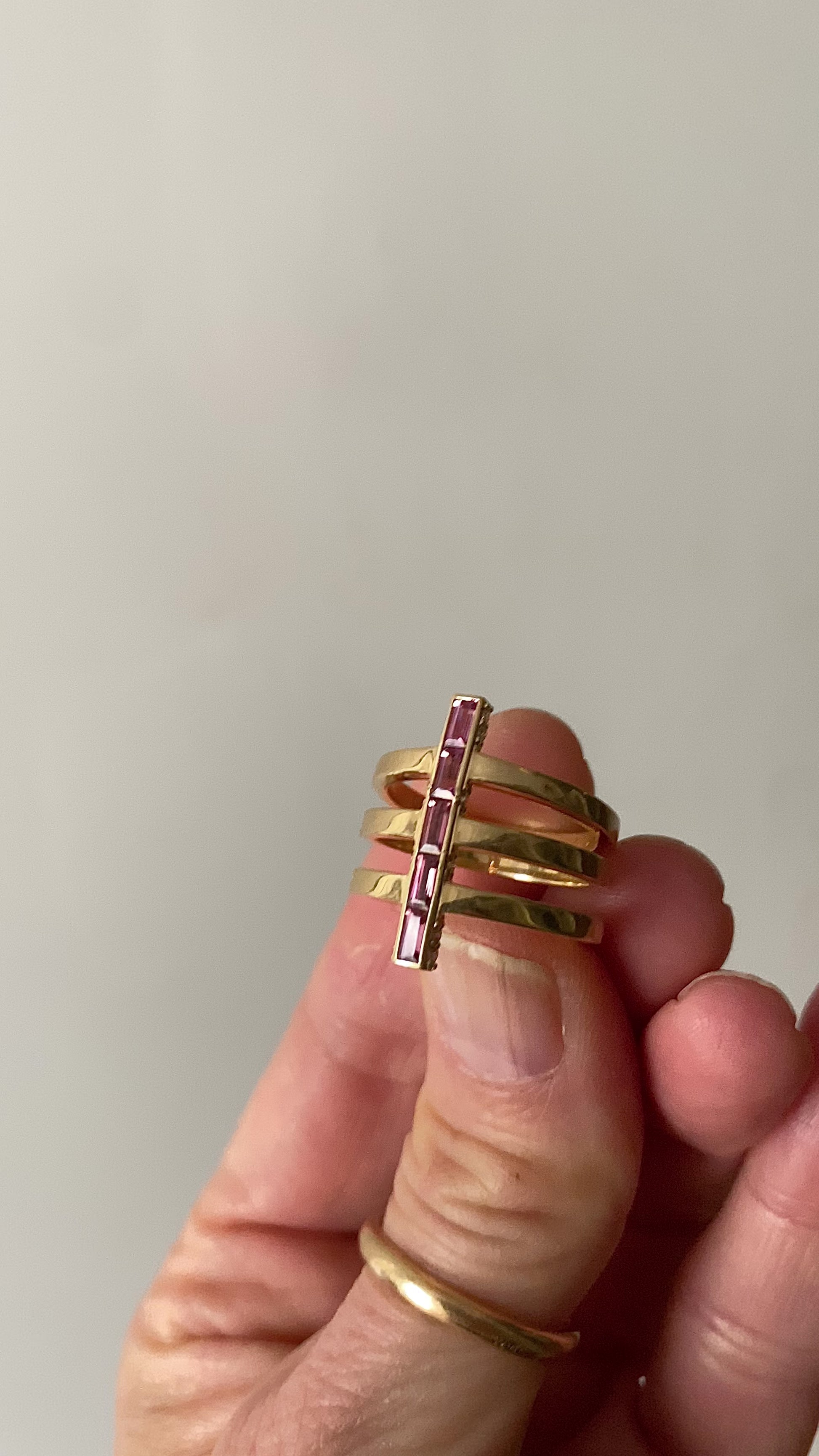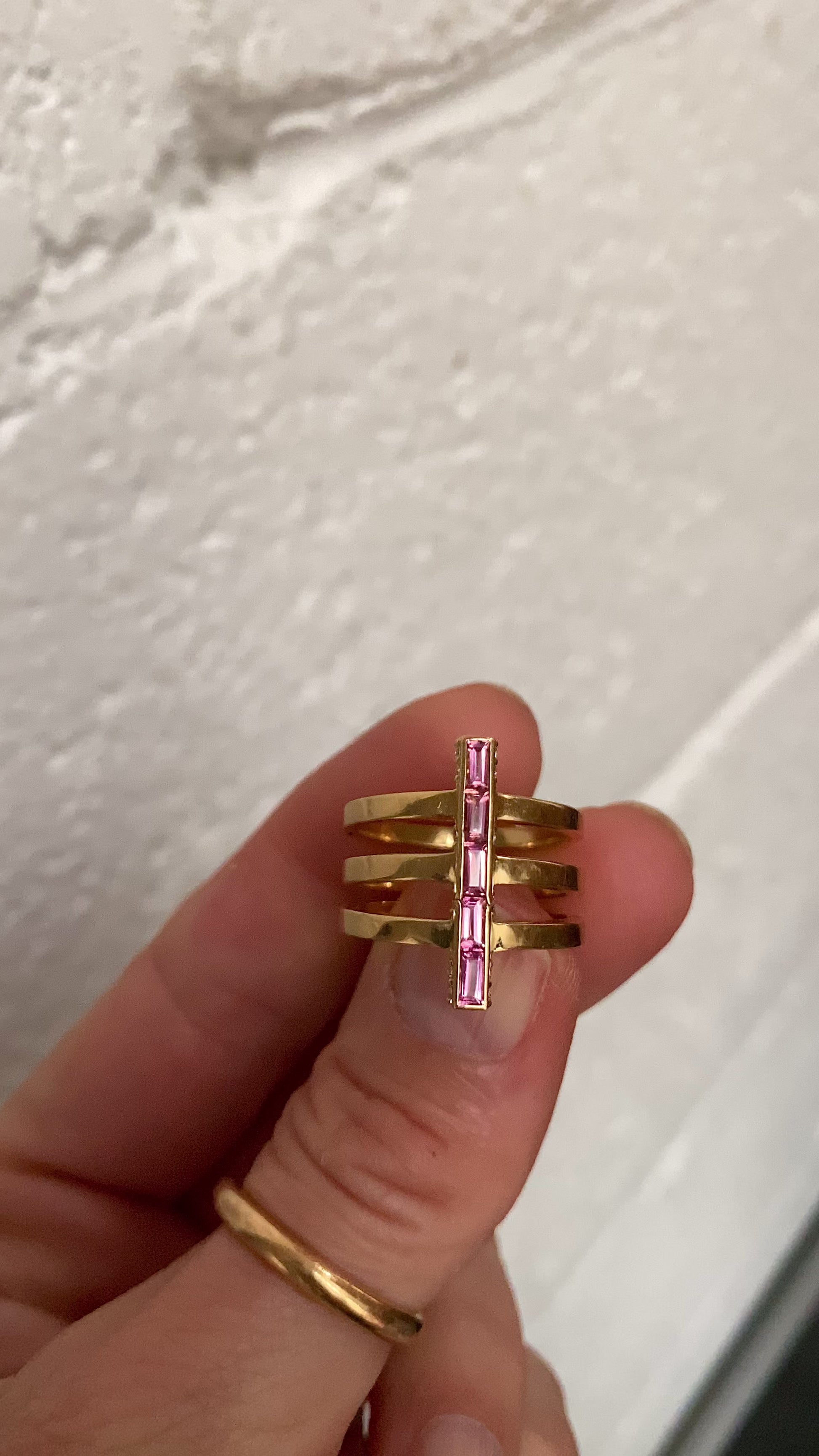 DESCRIPTION FROM ELISA: A ring with a unique design! The pink baguettes (probably topaz) are beautiful, and the bonus is the tiny diamonds on either side!