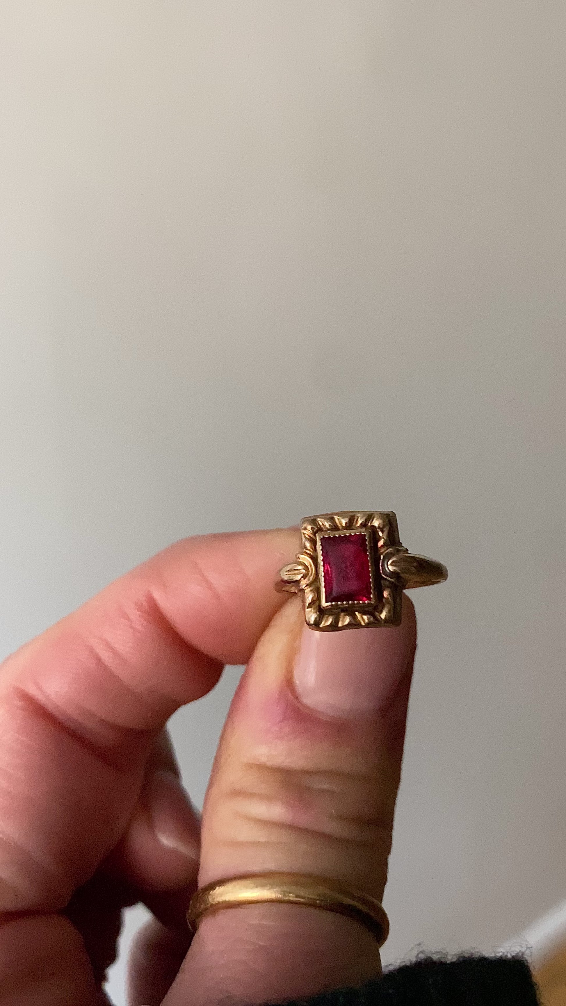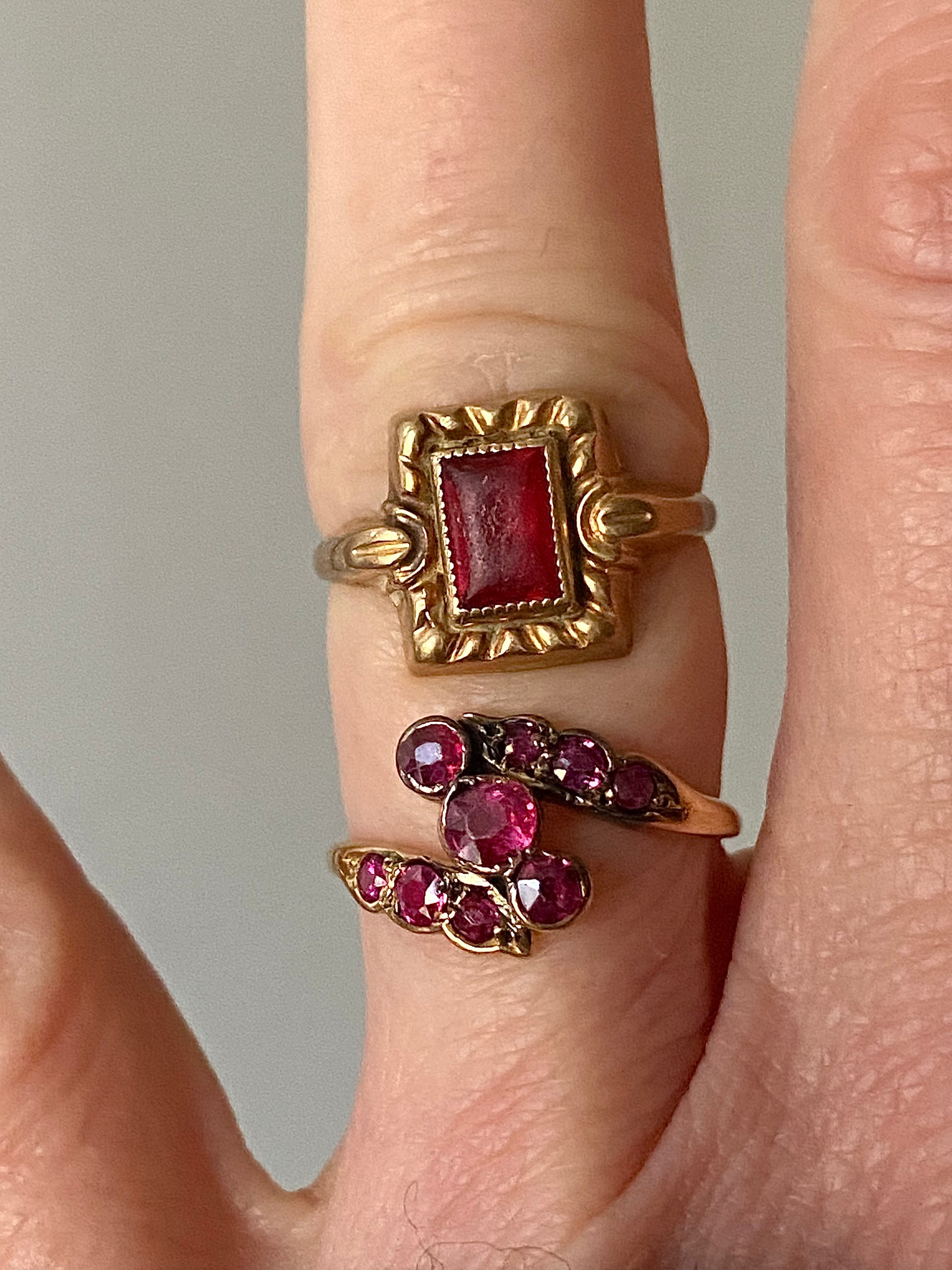 BOTTOM: A Victorian bypass ring features super sparkly natural old cut rubies