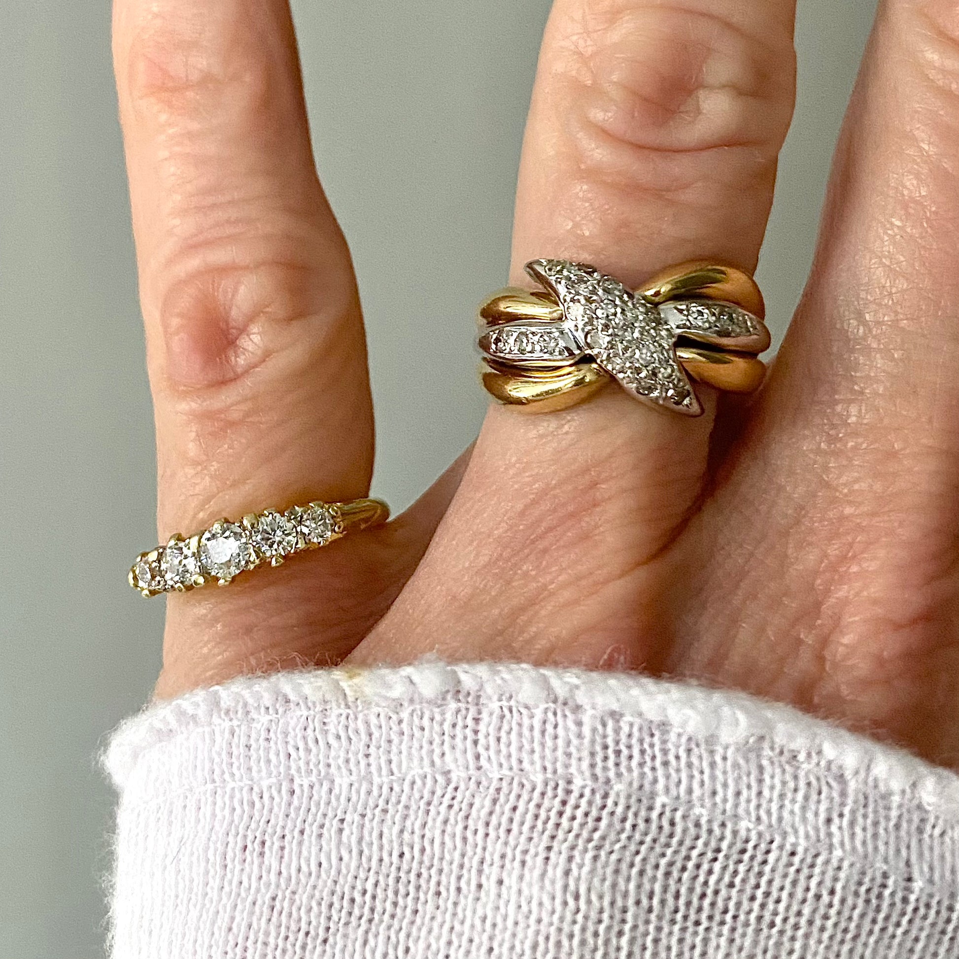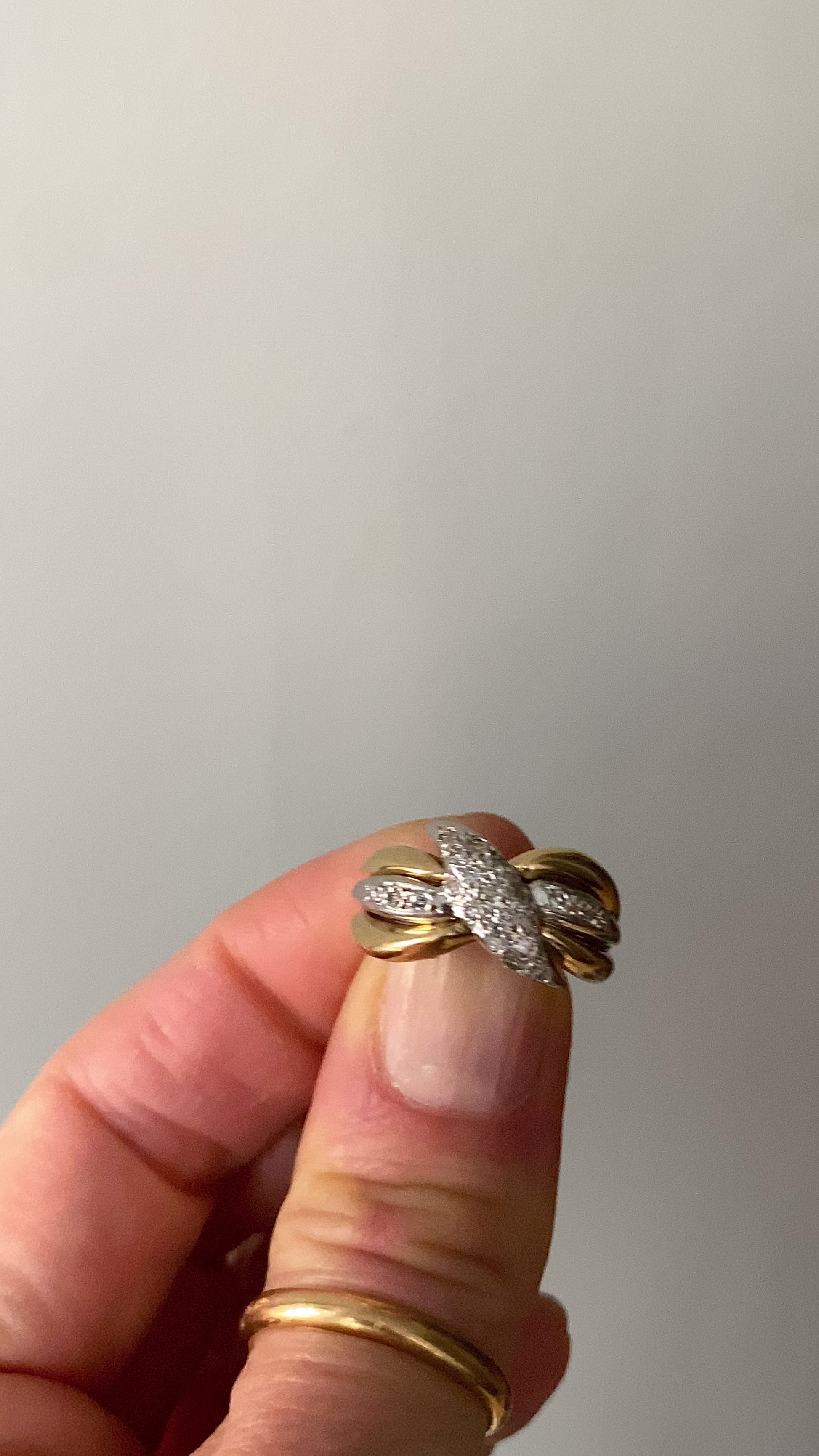 DESCRIPTION FROM ELISA: More bread and butter! (everyday GOLD). This one is a sweet bow ring with pave diamonds. Pictured on the right.