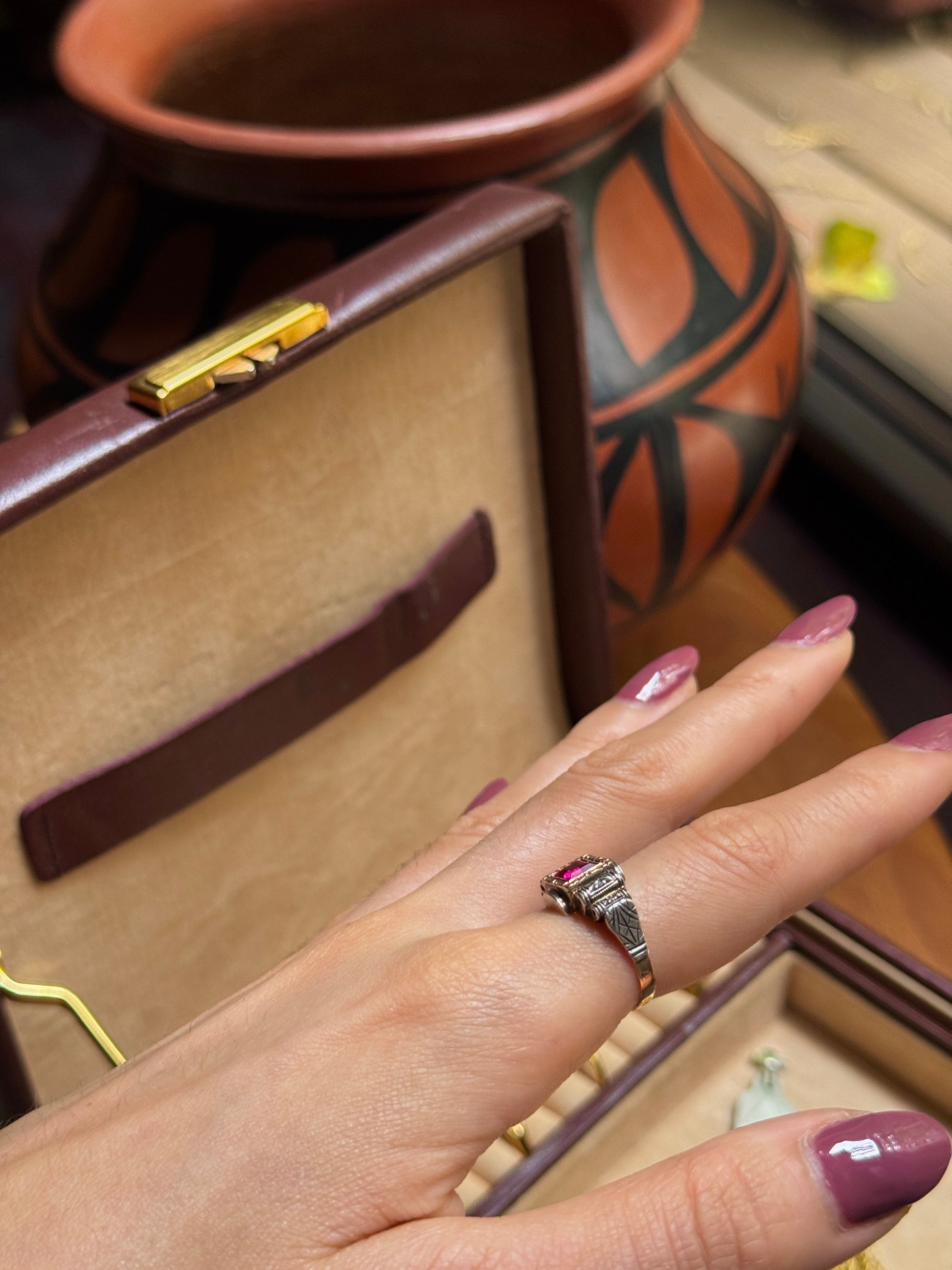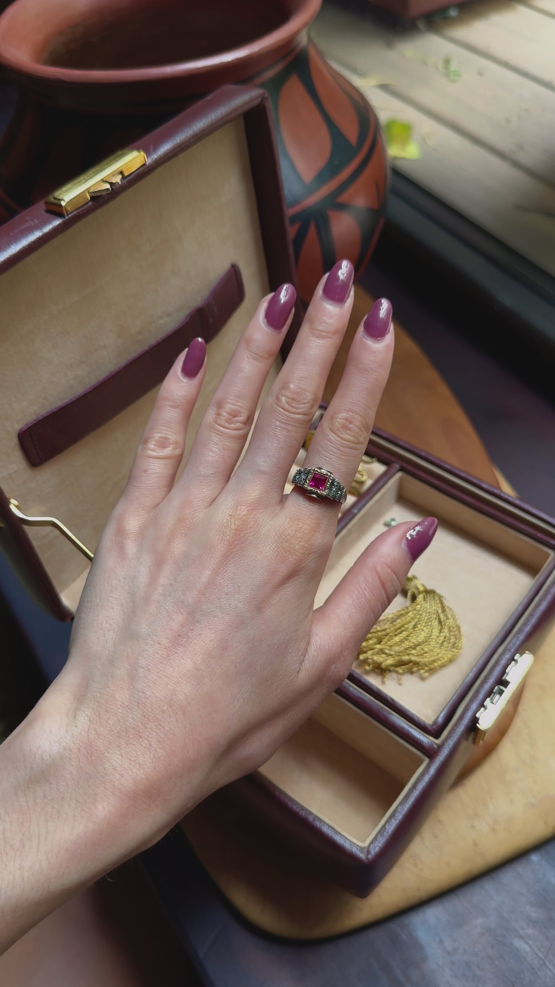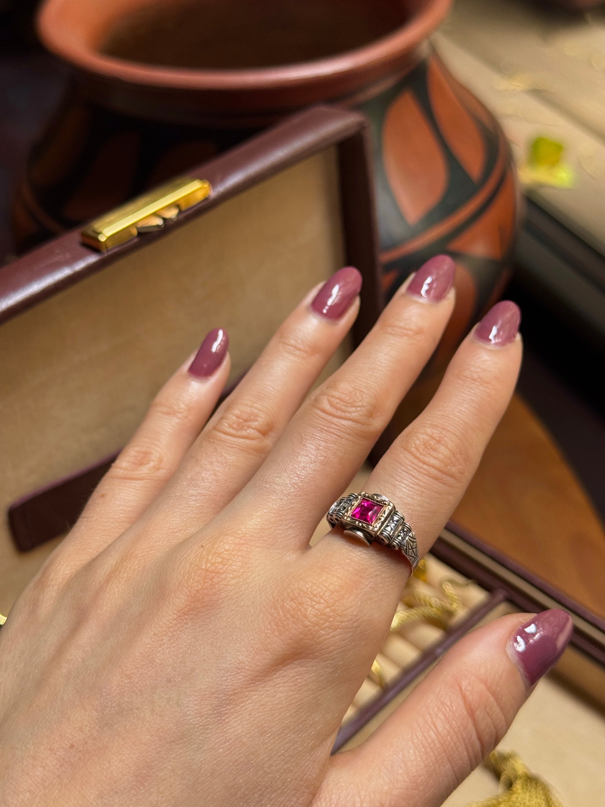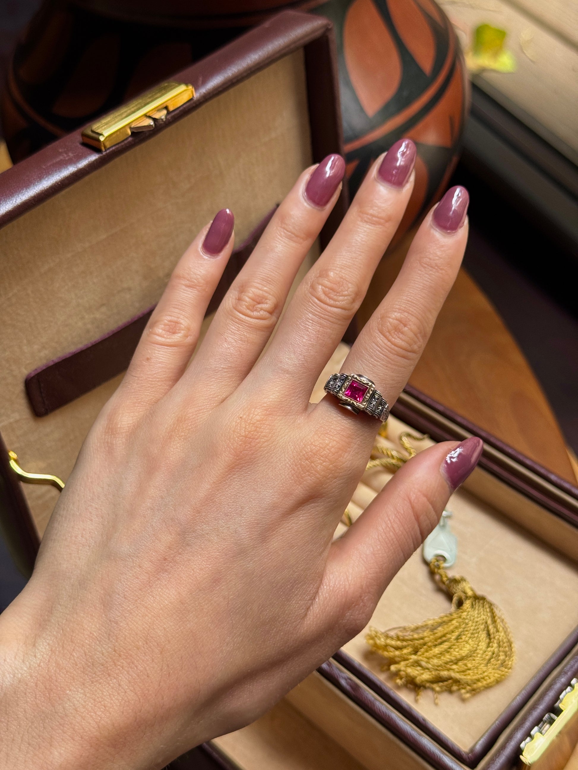 This is an antique white gold ring featuring a large centered geometric pink synthetic ruby (which despite being likely synthetic still very high quality) plus genuine diamonds surrounding it. Back in Victorian times this combination was common!