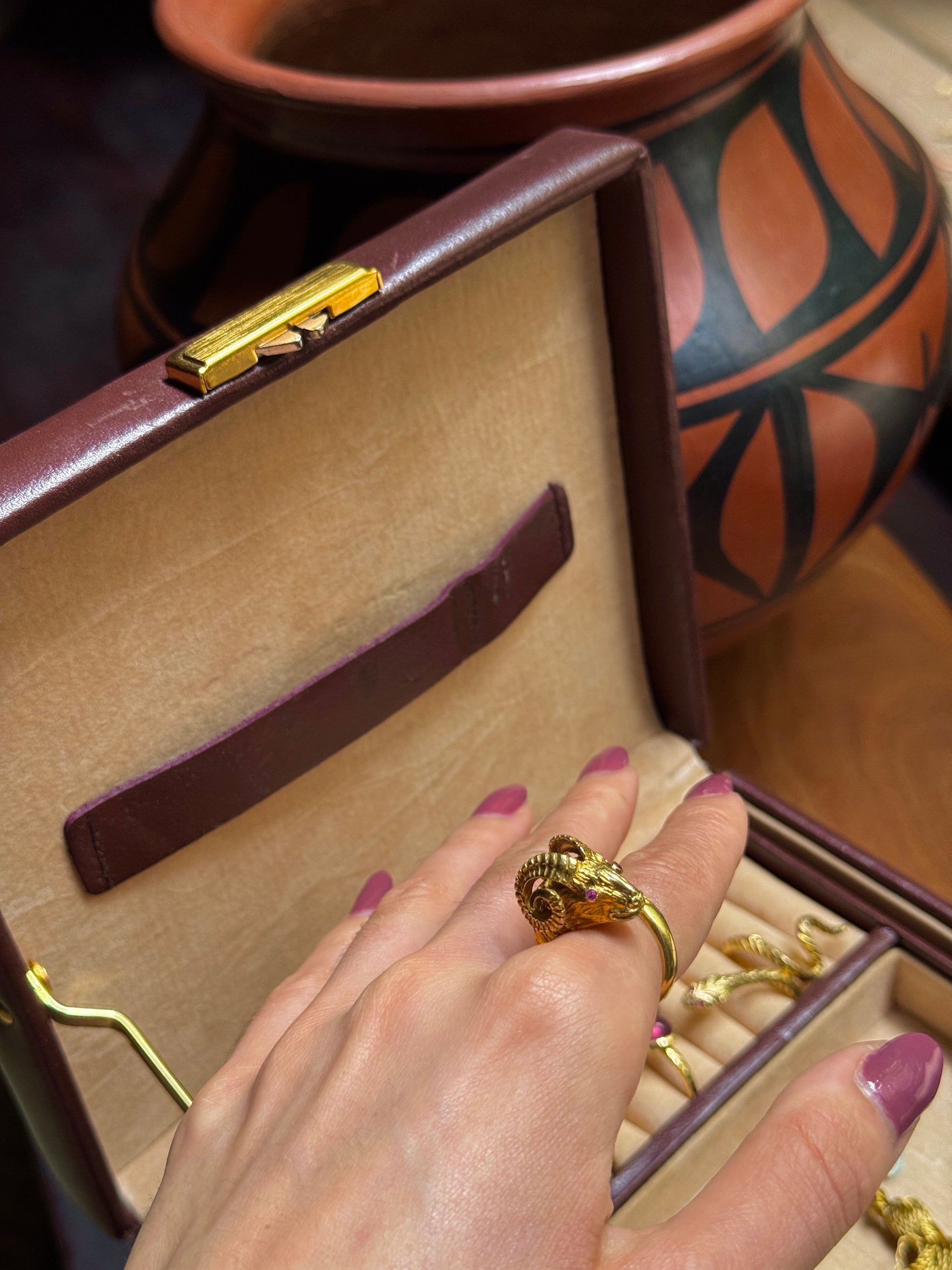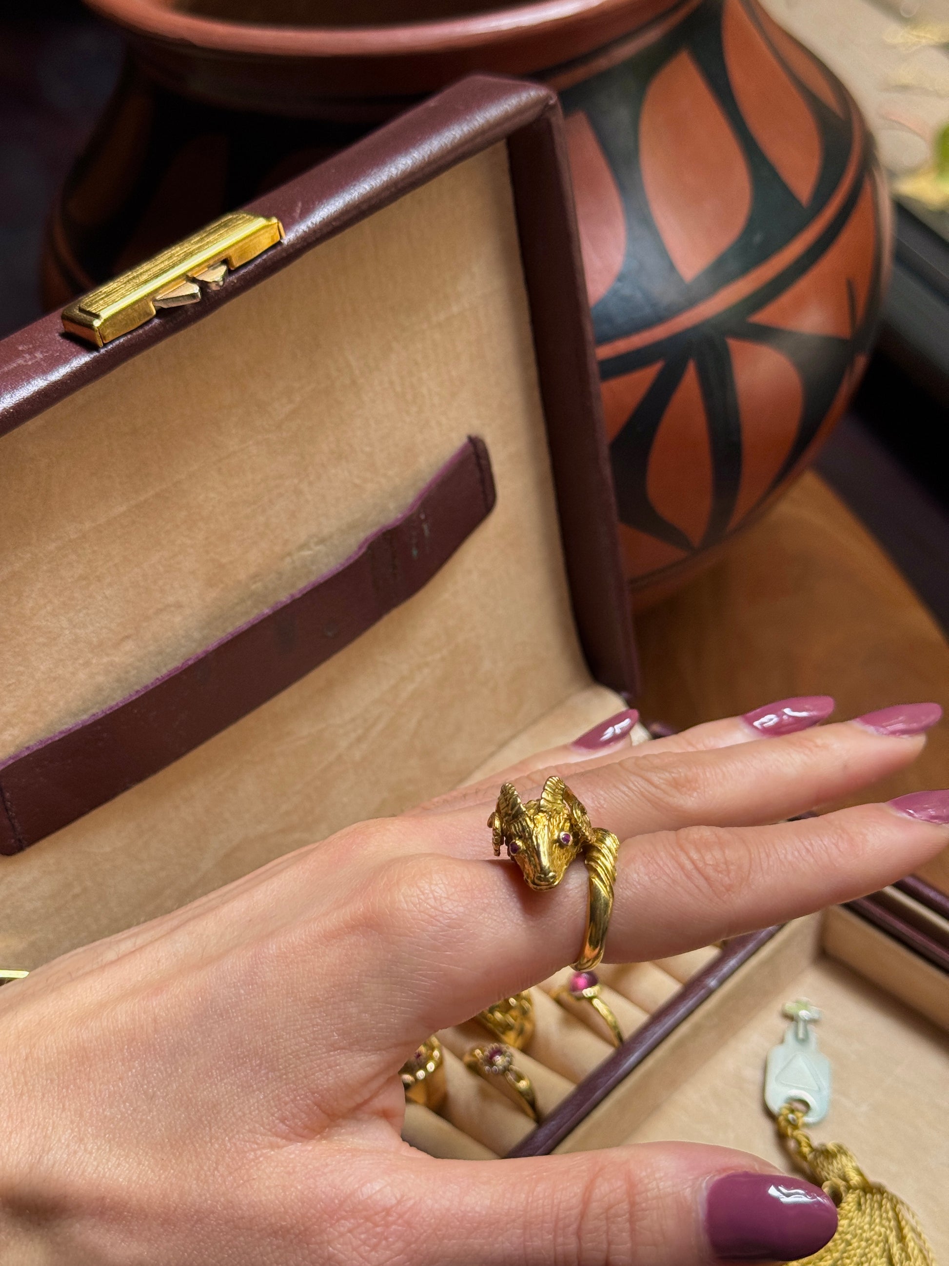 This little guy is like a mascot! Could be capricorn or aries, as the ring depicts a beautiful ram.