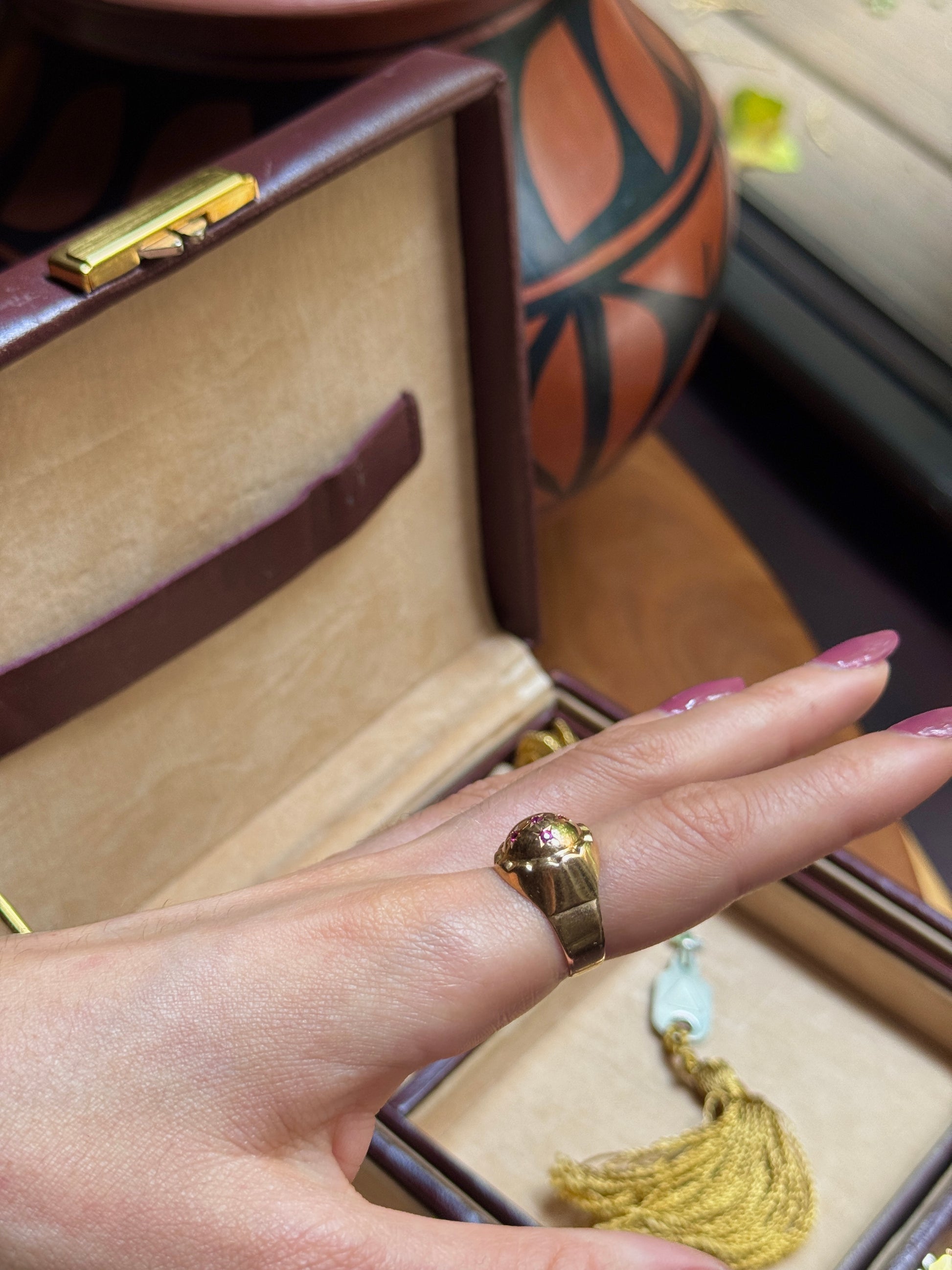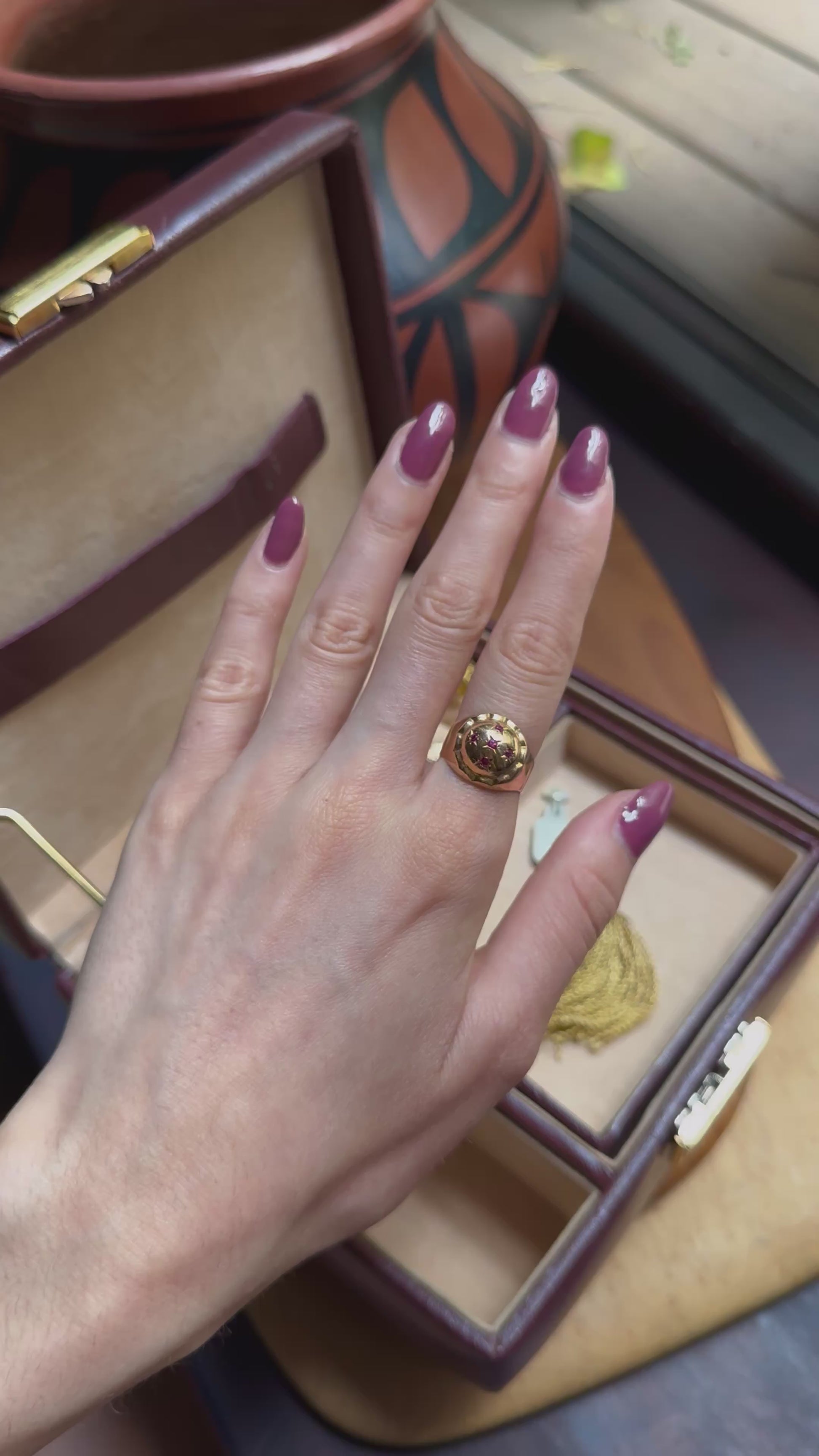 A dome featuring genuine rubies speckled throughout the globe silhouette! Such a perfect everyday piece with some color...