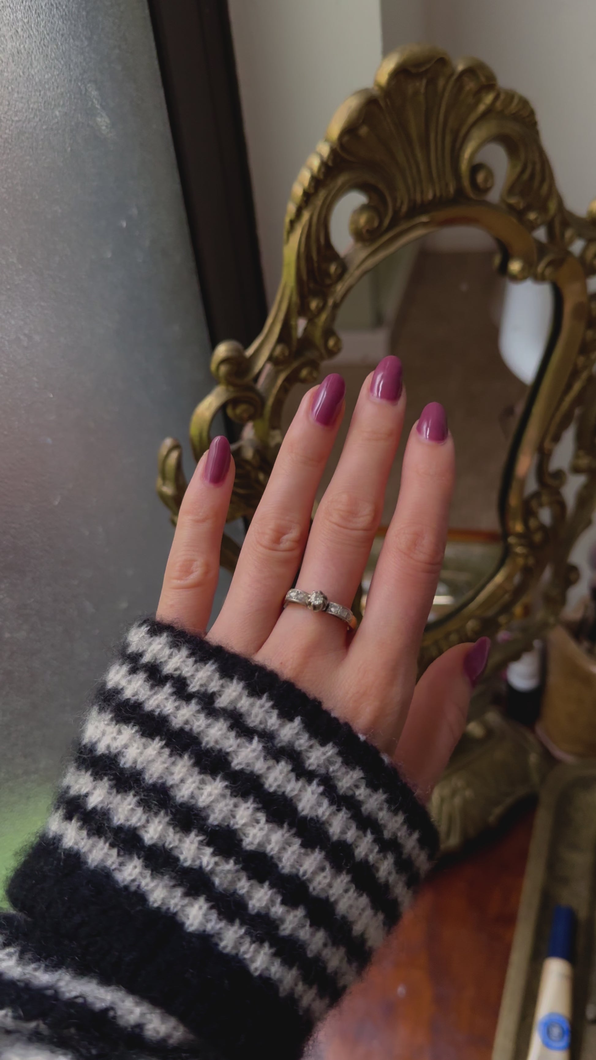 Sweet bow ring with beautiful old diamonds! The center diamond is an old mine cut, about .20, flanked by 6 rose cuts. The diamonds are set in platinum and the sturdy shank is 18k yellow gold. No hallmarks, but my instincts (and the setting) tell me that the ring is French.