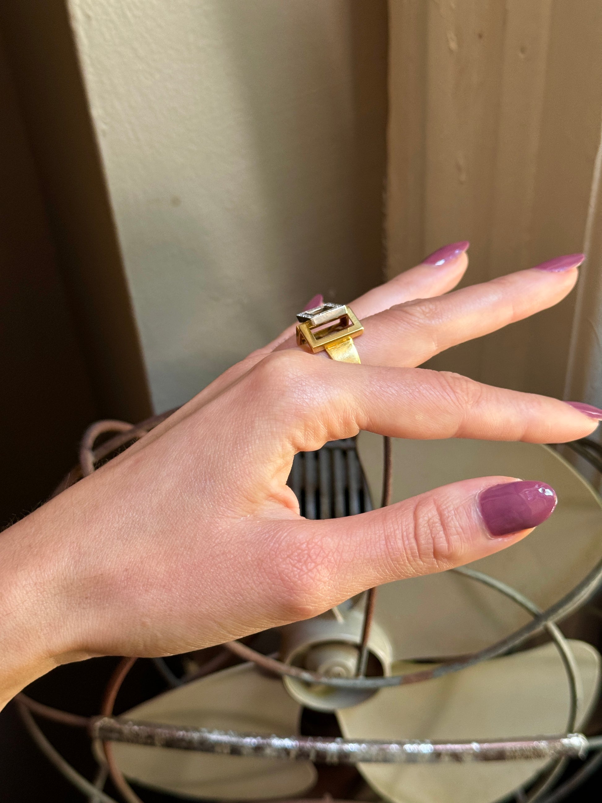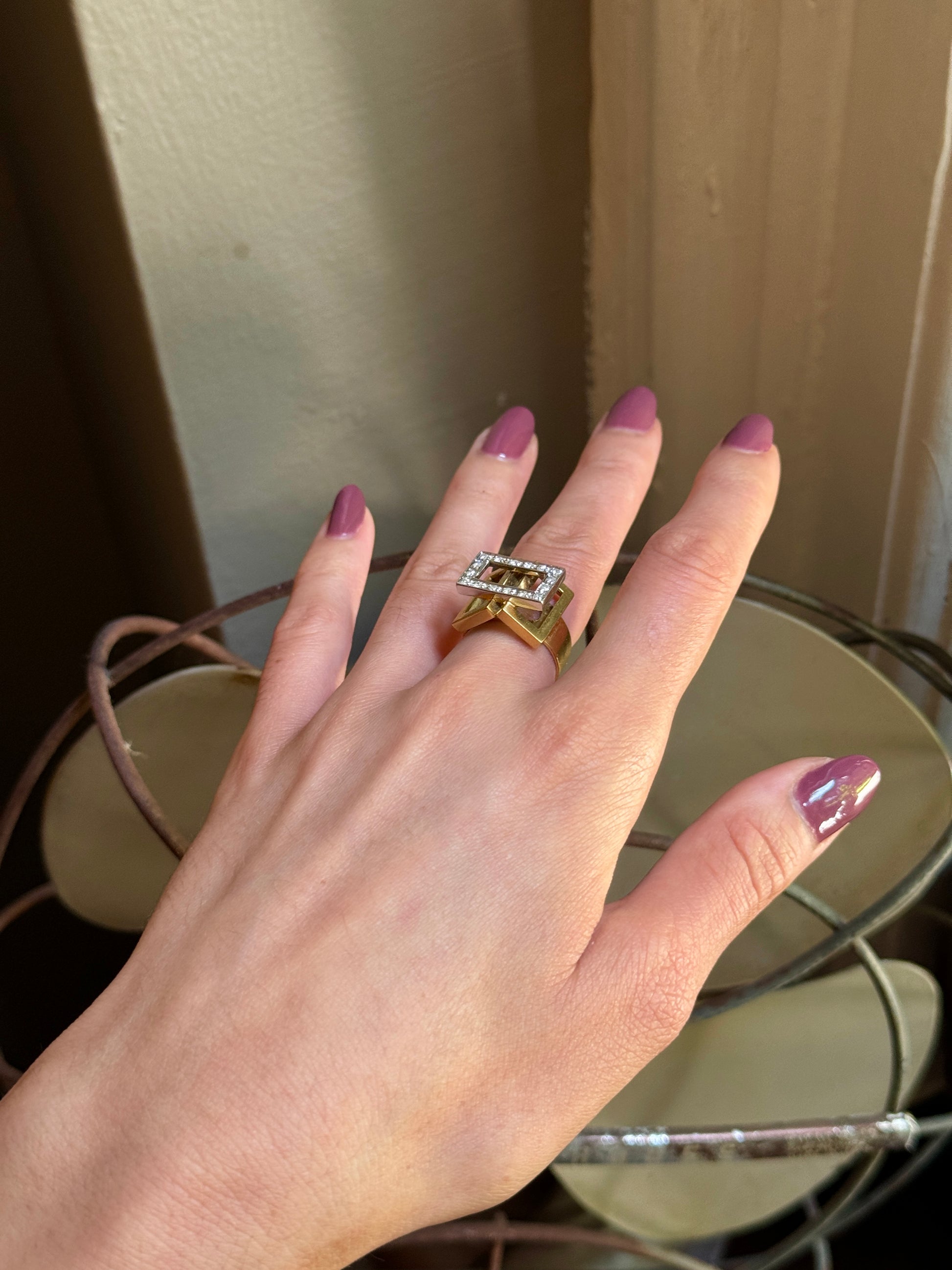 An architectural, sculptural, STUNNING piece. Personally I think this bold ring is better categorised as wear-able art rather than jewelry, featuring structured geometric frames stacked on the top that create a really unique sense of depth. The last square is entirely lined in diamonds for a sparkling grand finale.