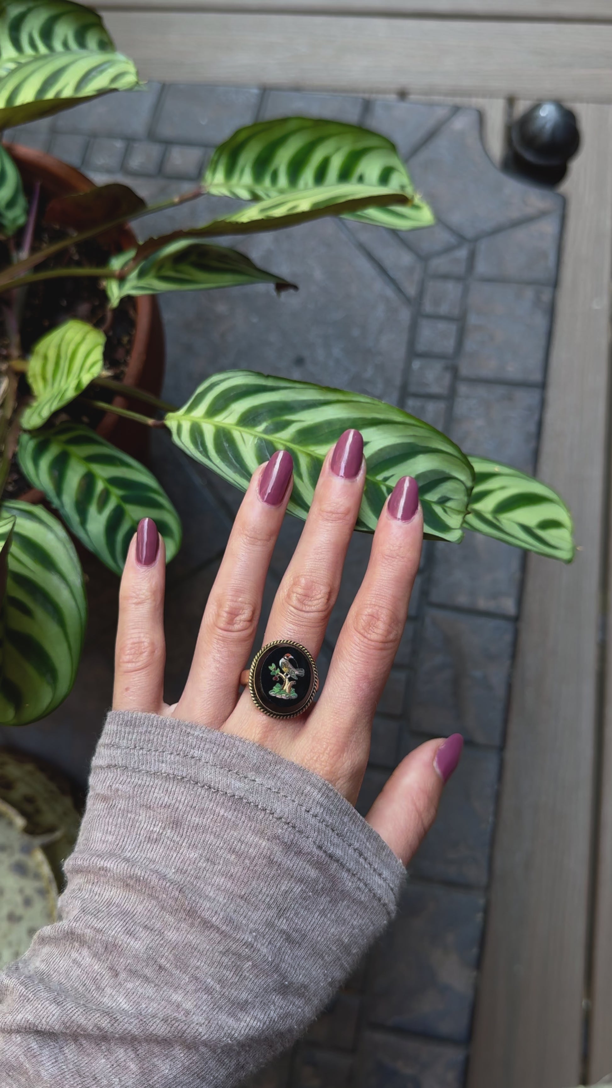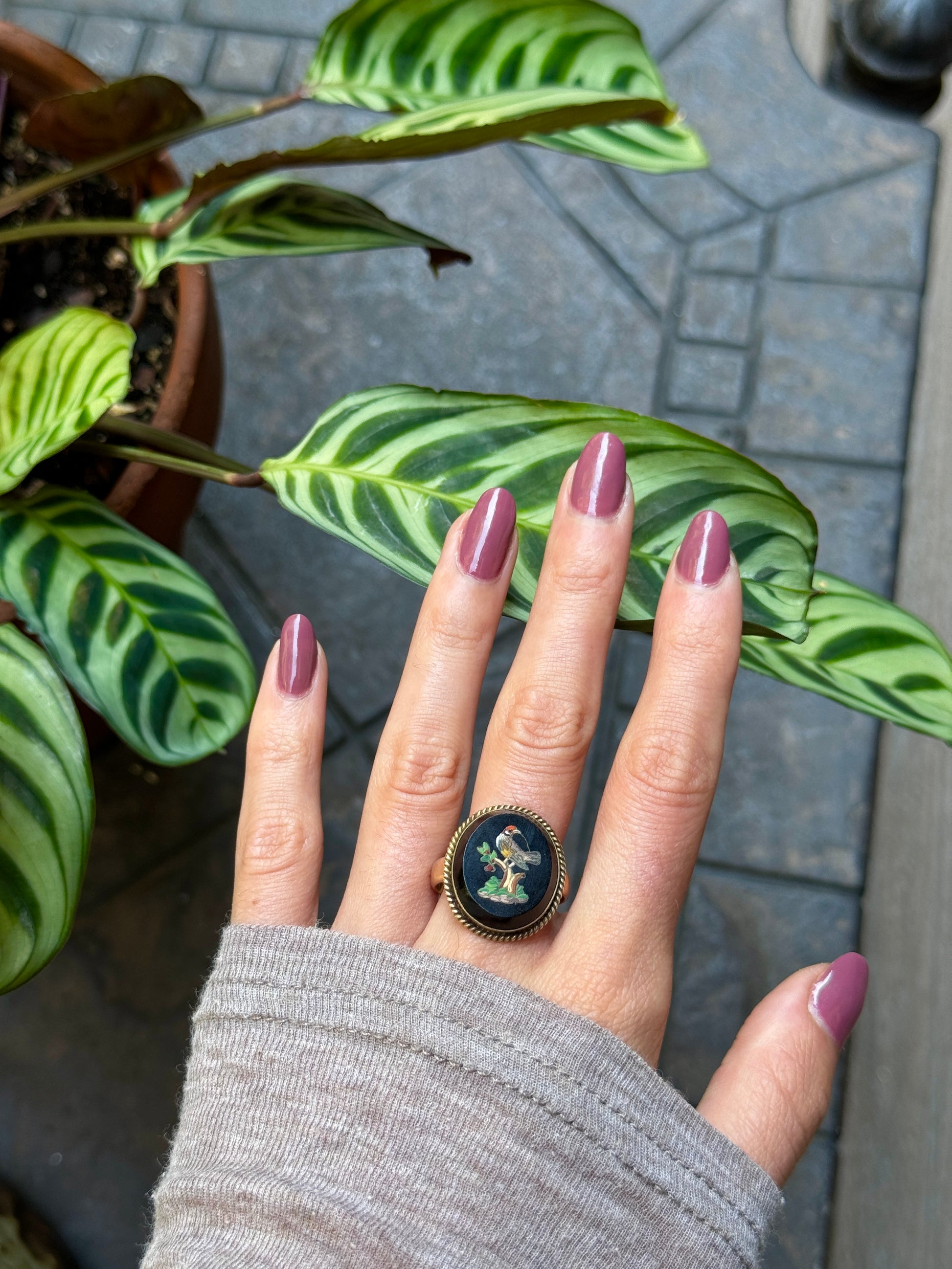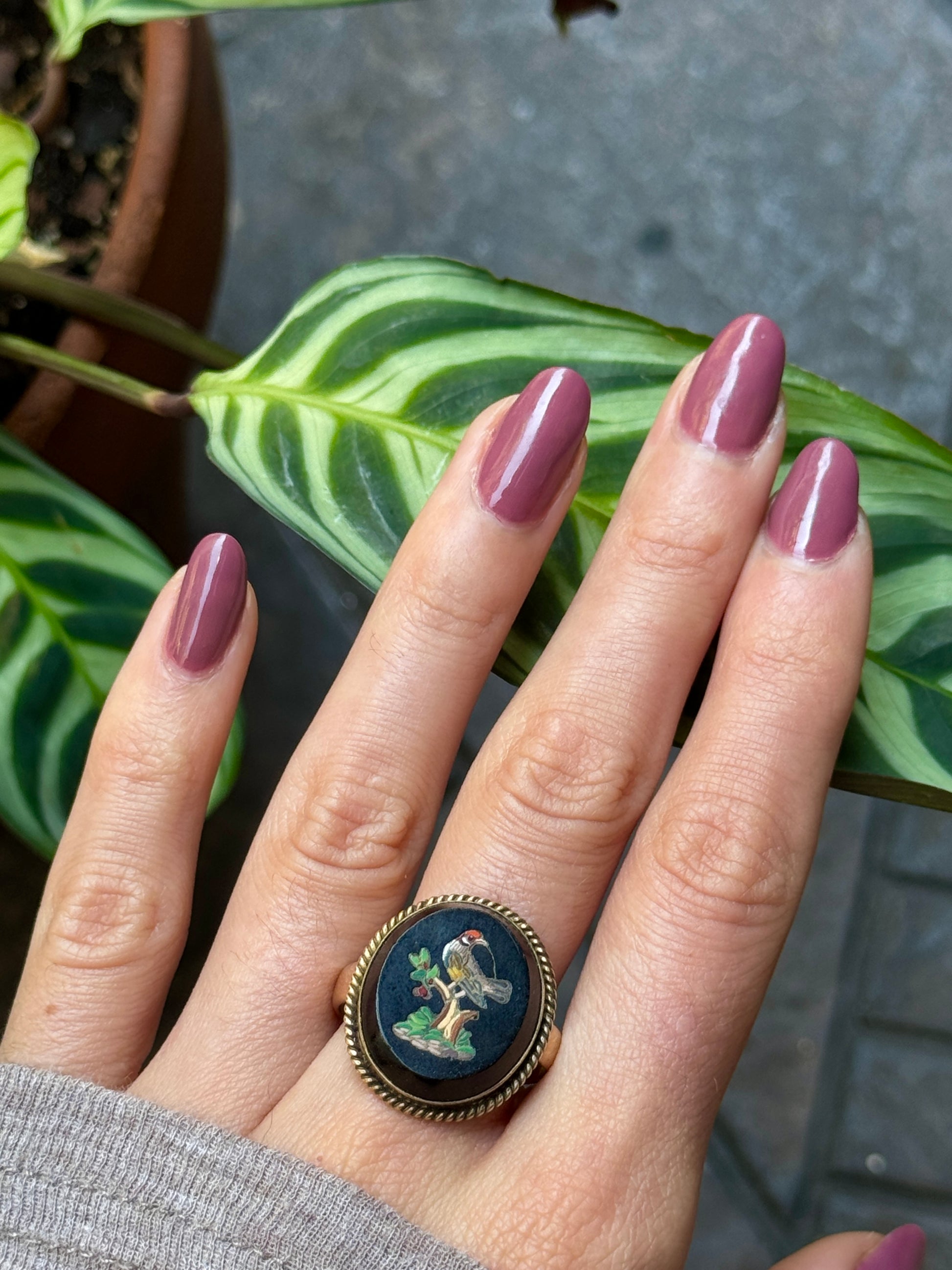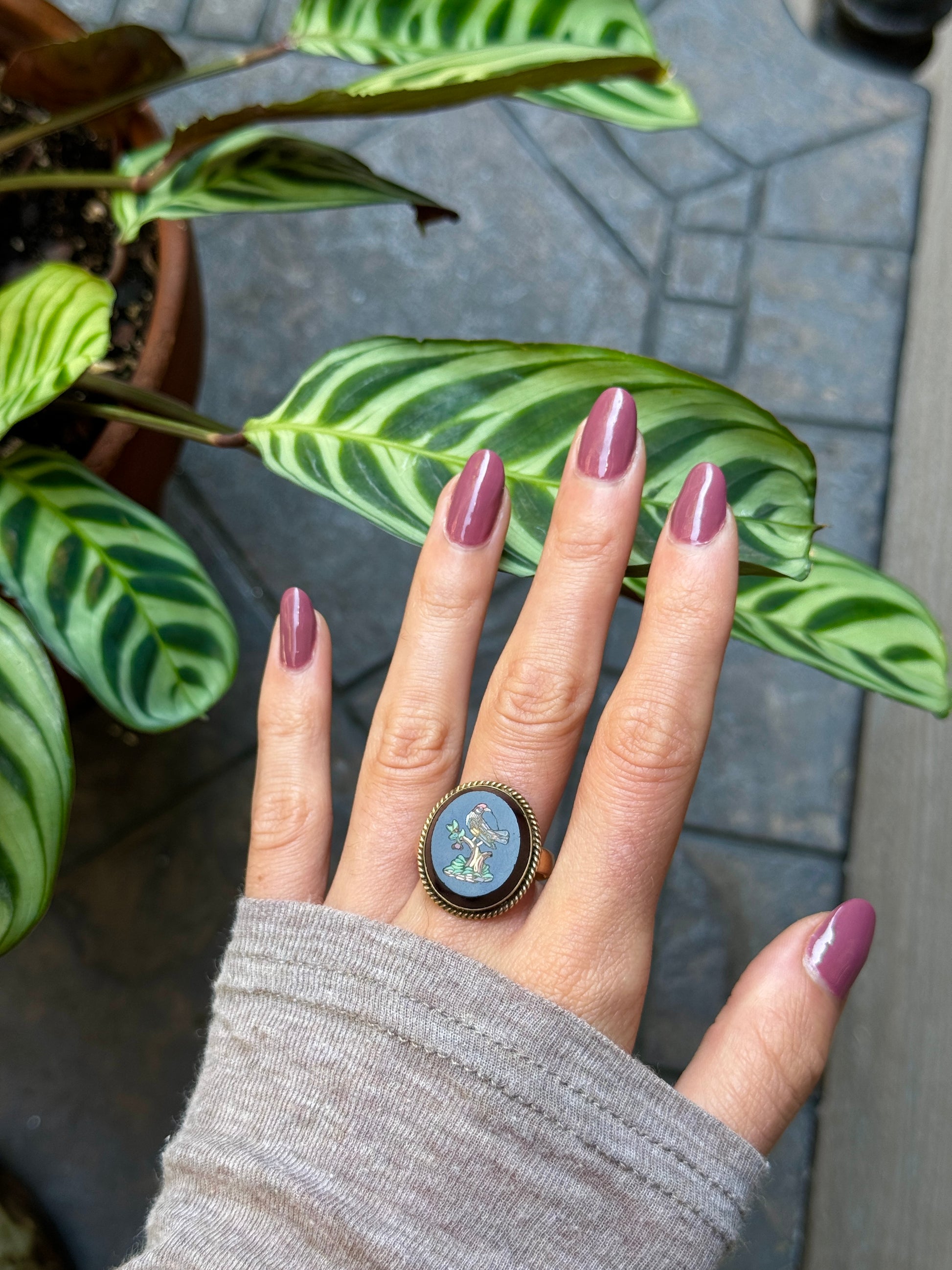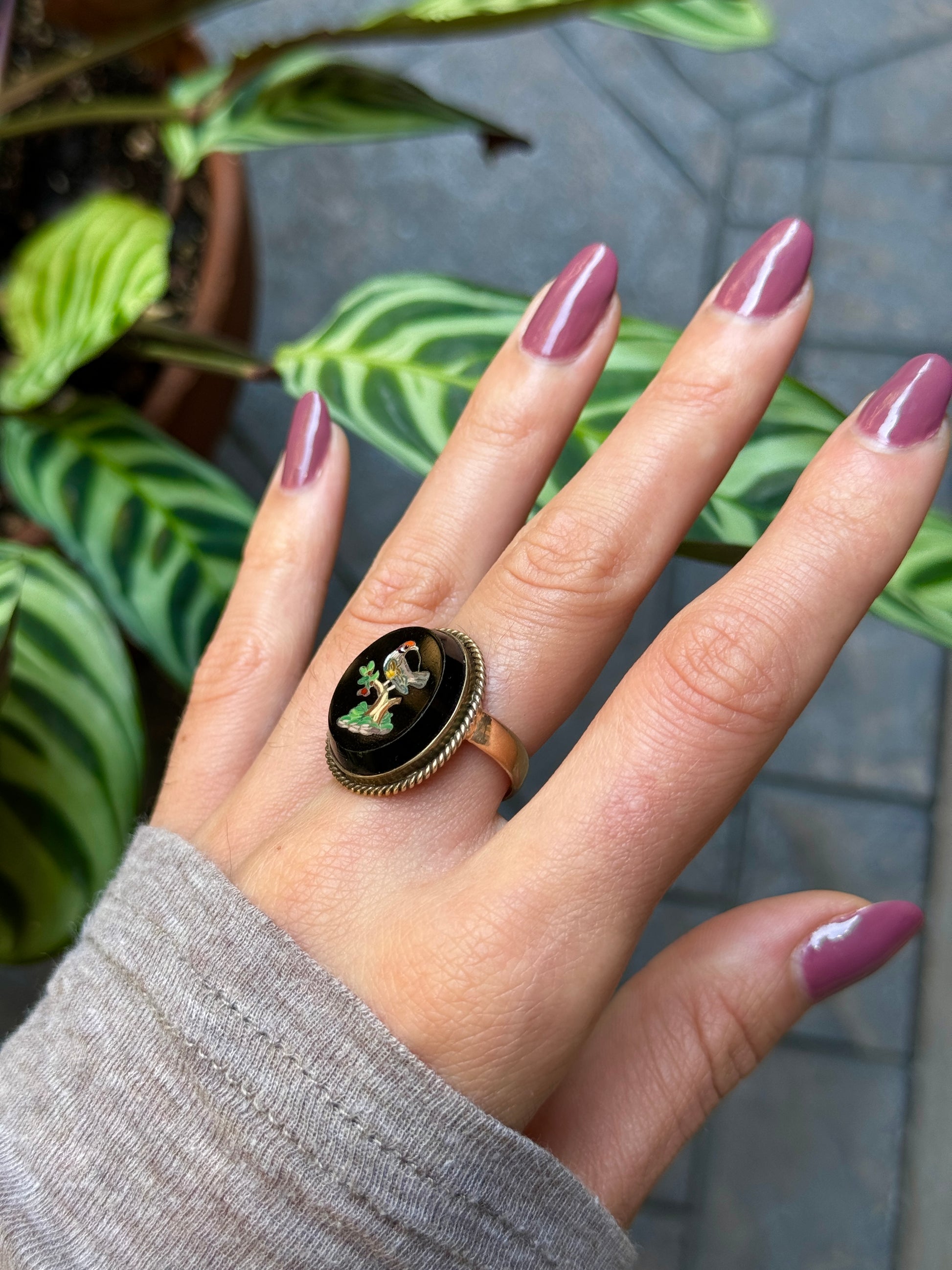 This stunner is RARE! It's a ring with onyx mosaic... Minor superficial crack (unnoticeable from birds beak), but is stable.