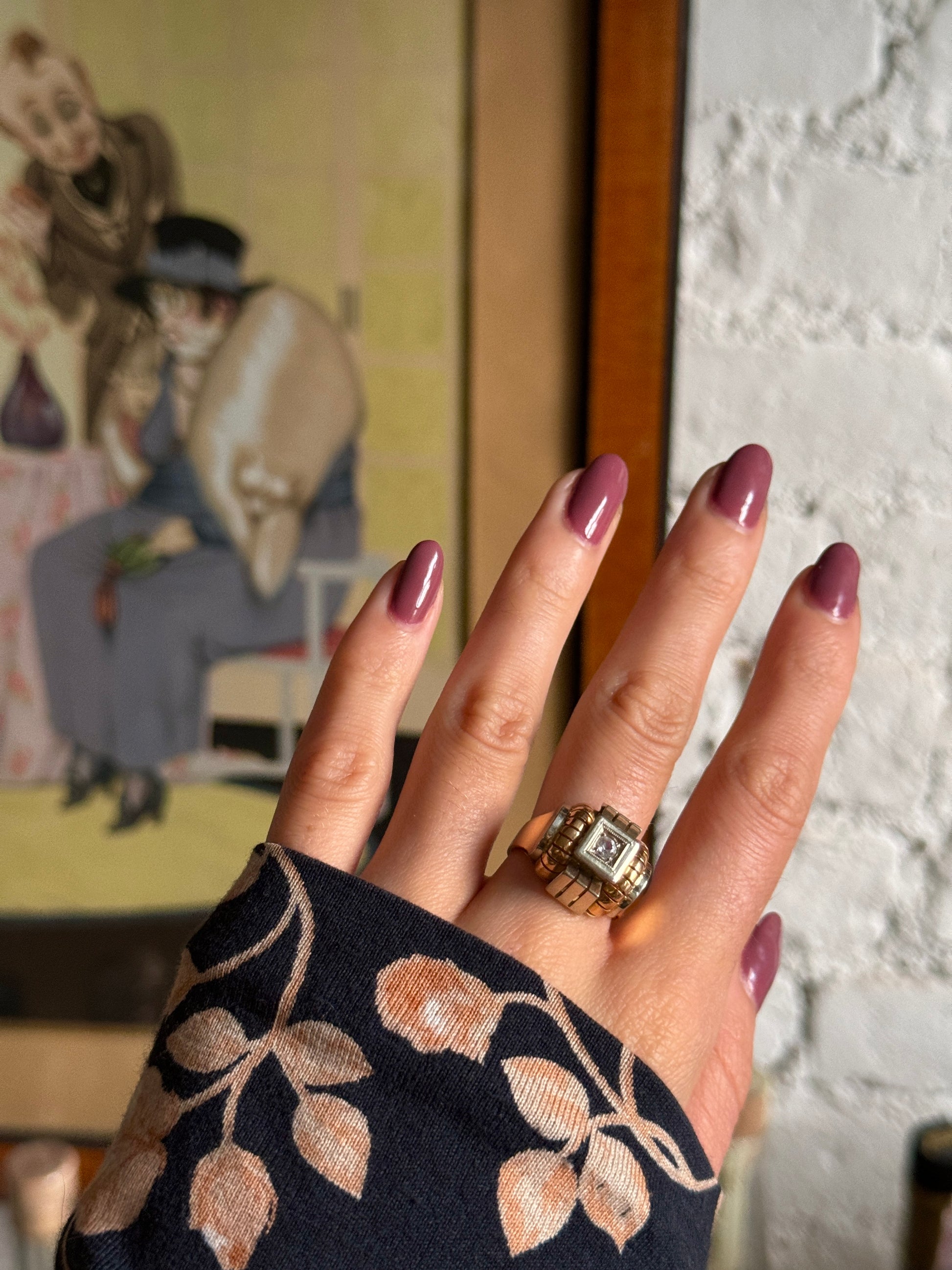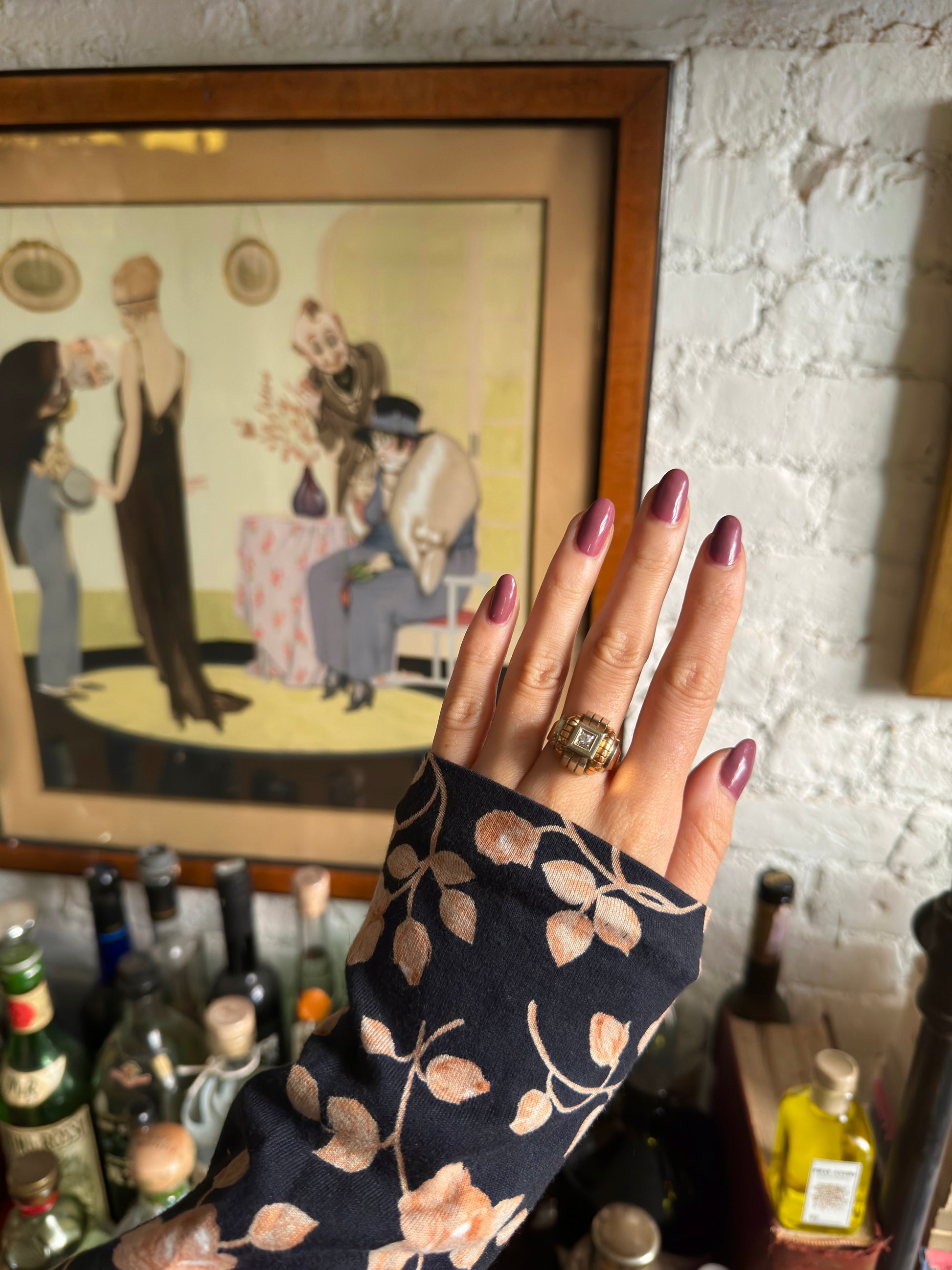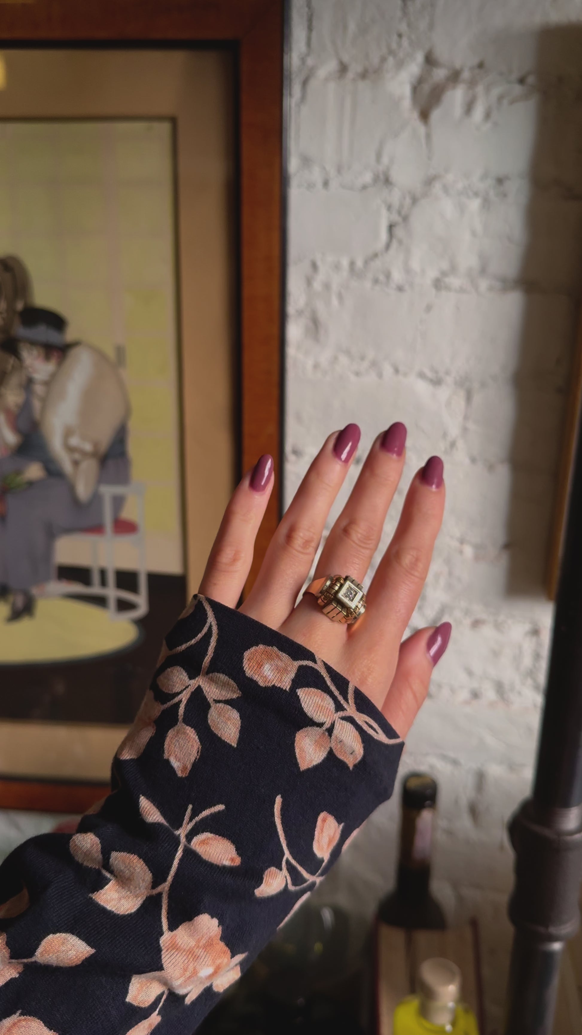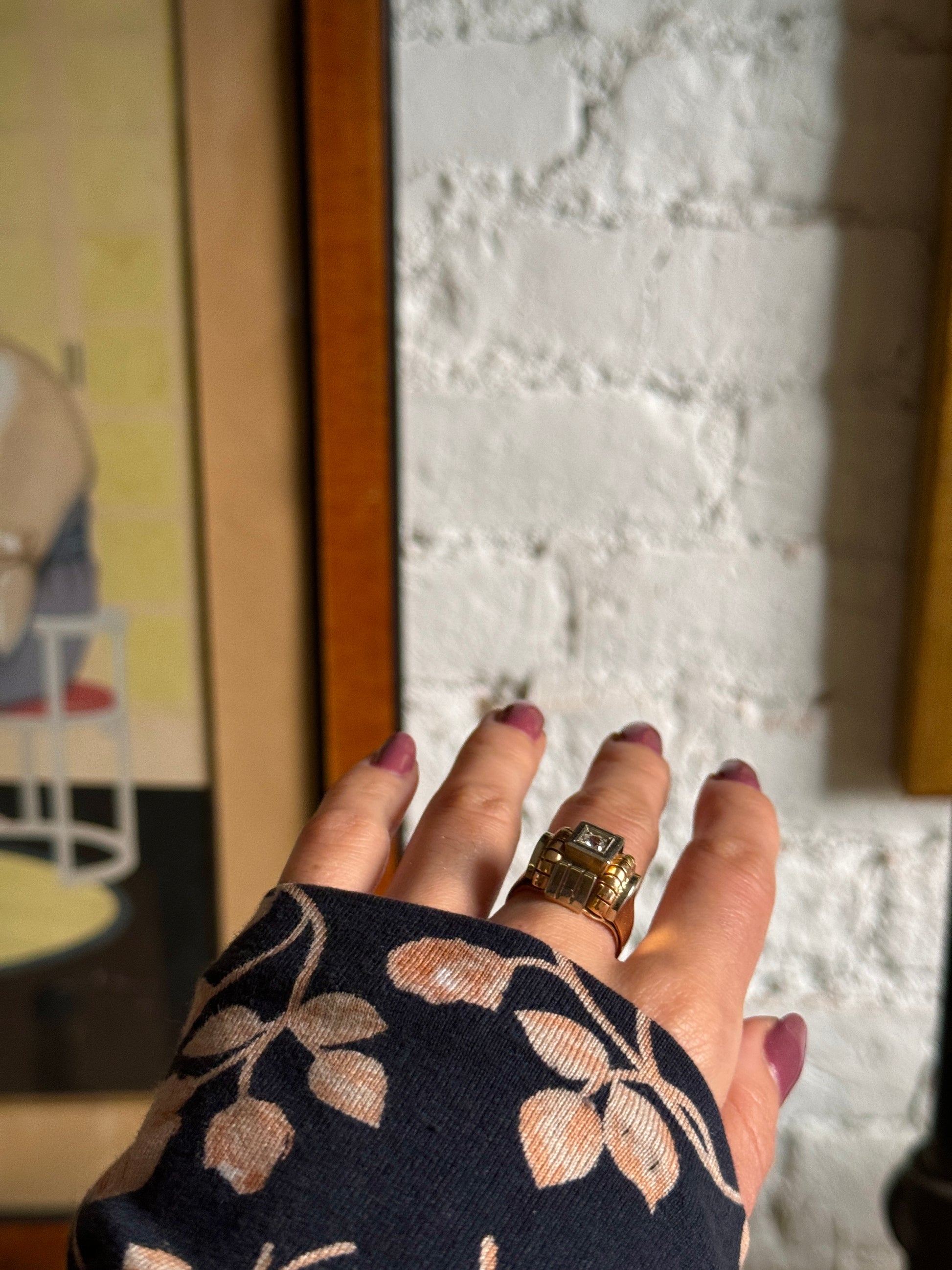 This ring is a classic retro era (30s/40s) tank ring that is delicately ornate yet strong and bold.