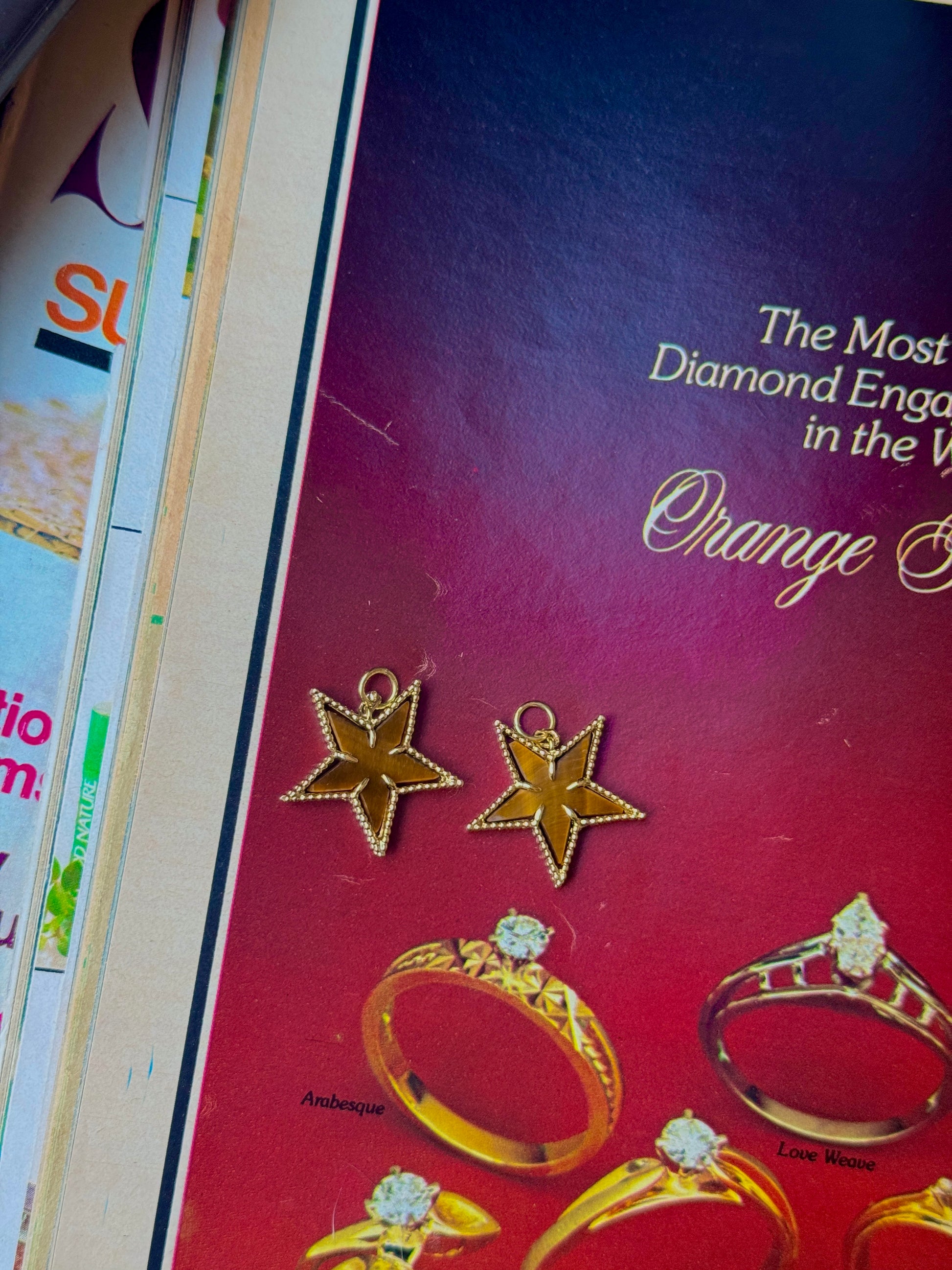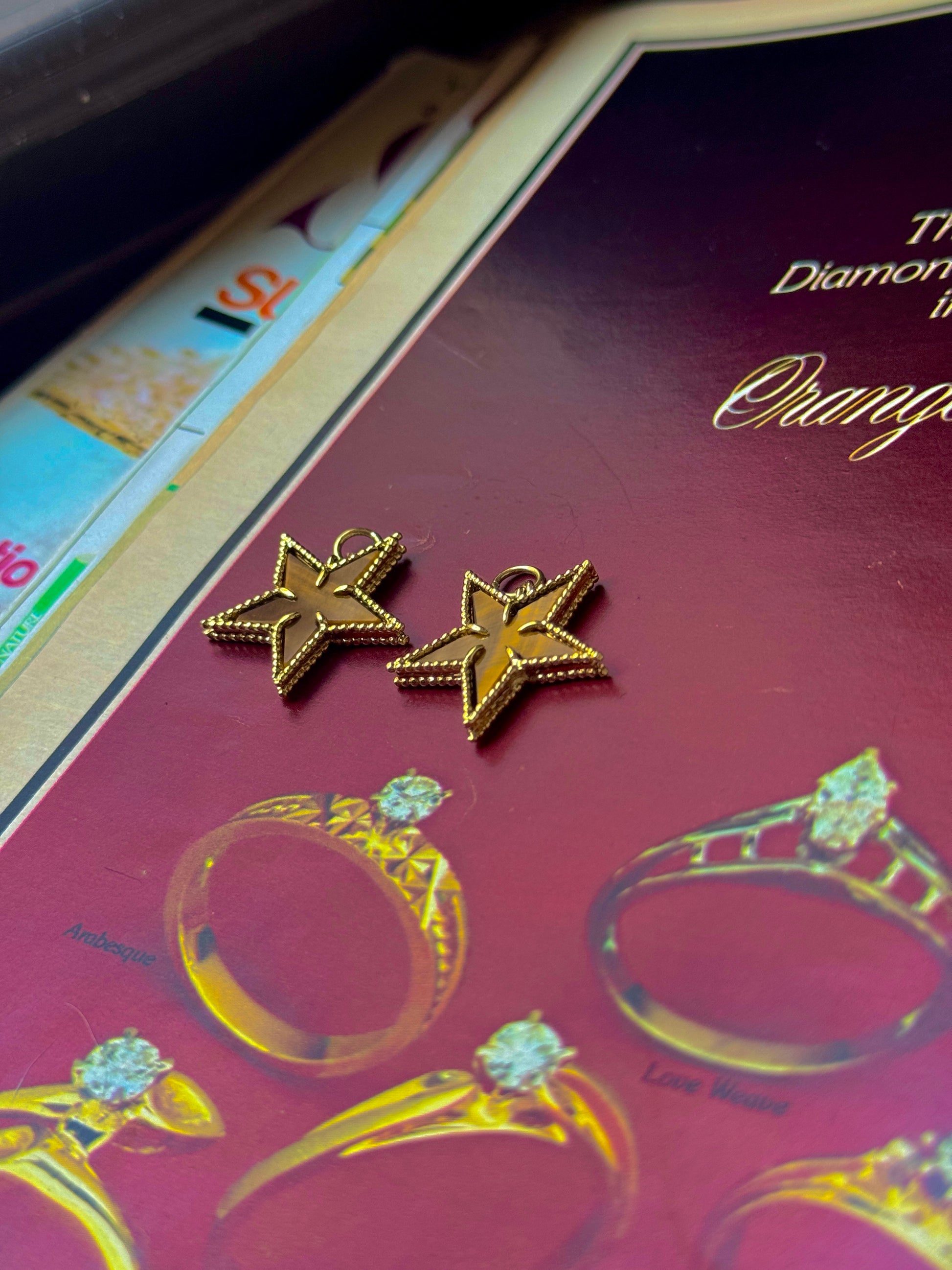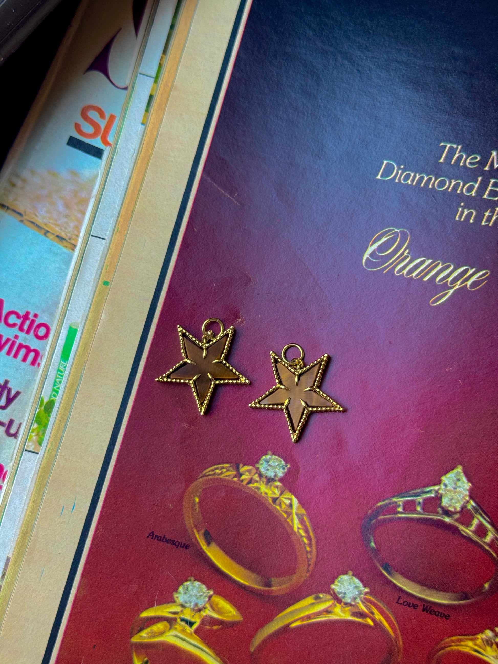 I've always loved the warm combination of tigers eye and 18k. So when I found a vintage necklace dripping with these stars, I had to have it (even though the necklace was kind of ugly, hence the conversion to pendants!) There are 19 of them, but both Ruby and I will be keeping one so 17 of you can twin with us!