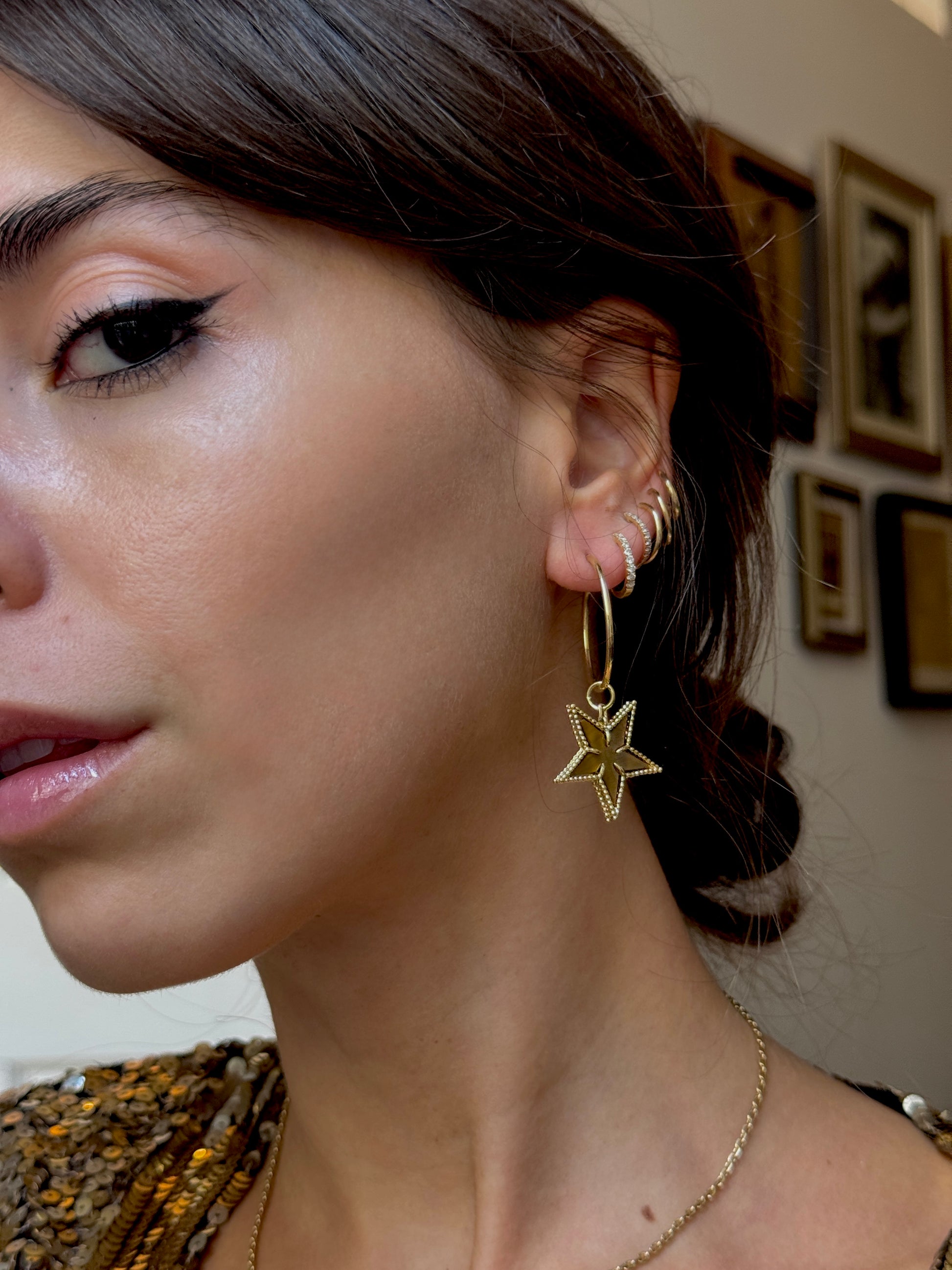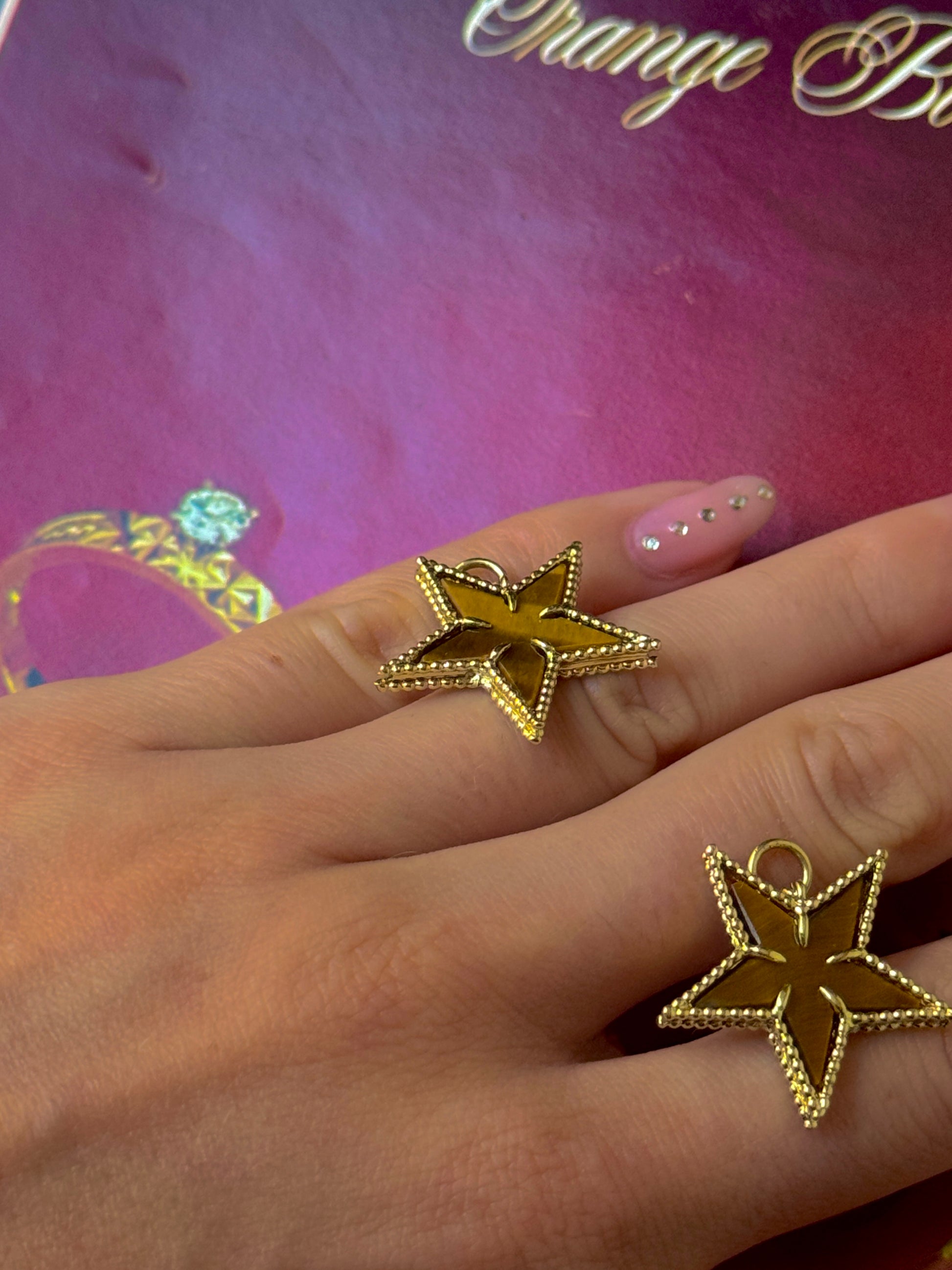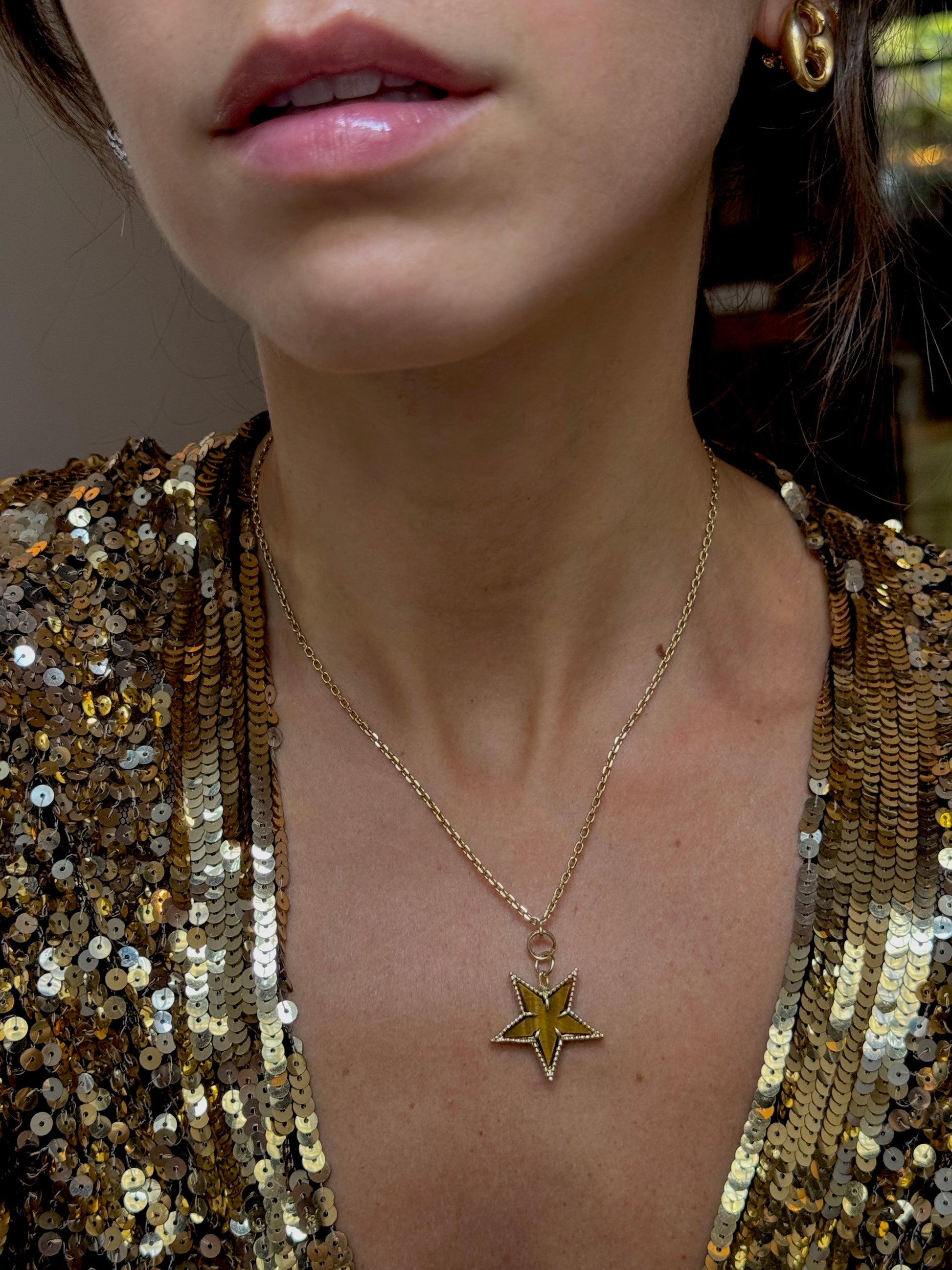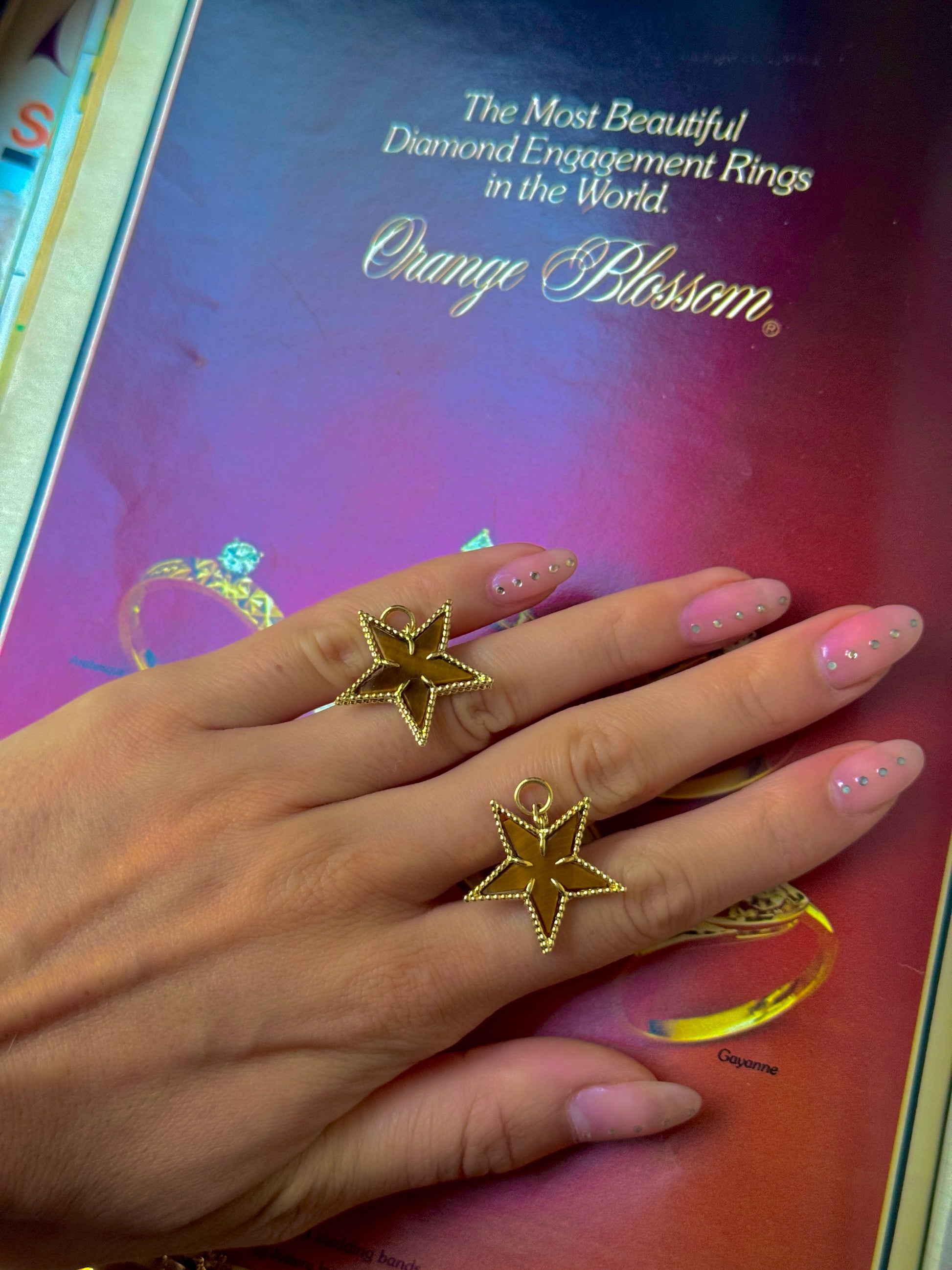 I've always loved the warm combination of tigers eye and 18k. So when I found a vintage necklace dripping with these stars, I had to have it (even though the necklace was kind of ugly, hence the conversion to pendants!) There are 19 of them, but both Ruby and I will be keeping one so 17 of you can twin with us!